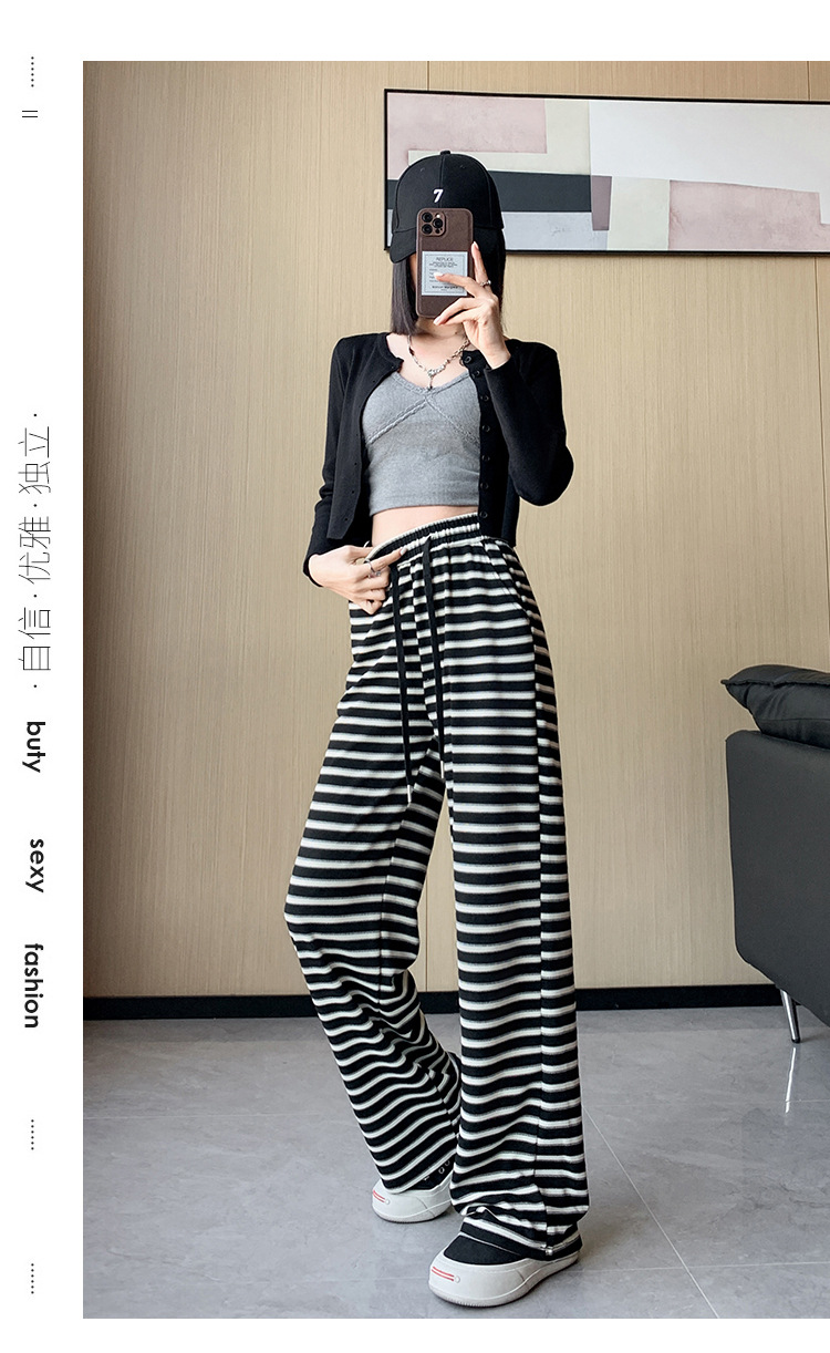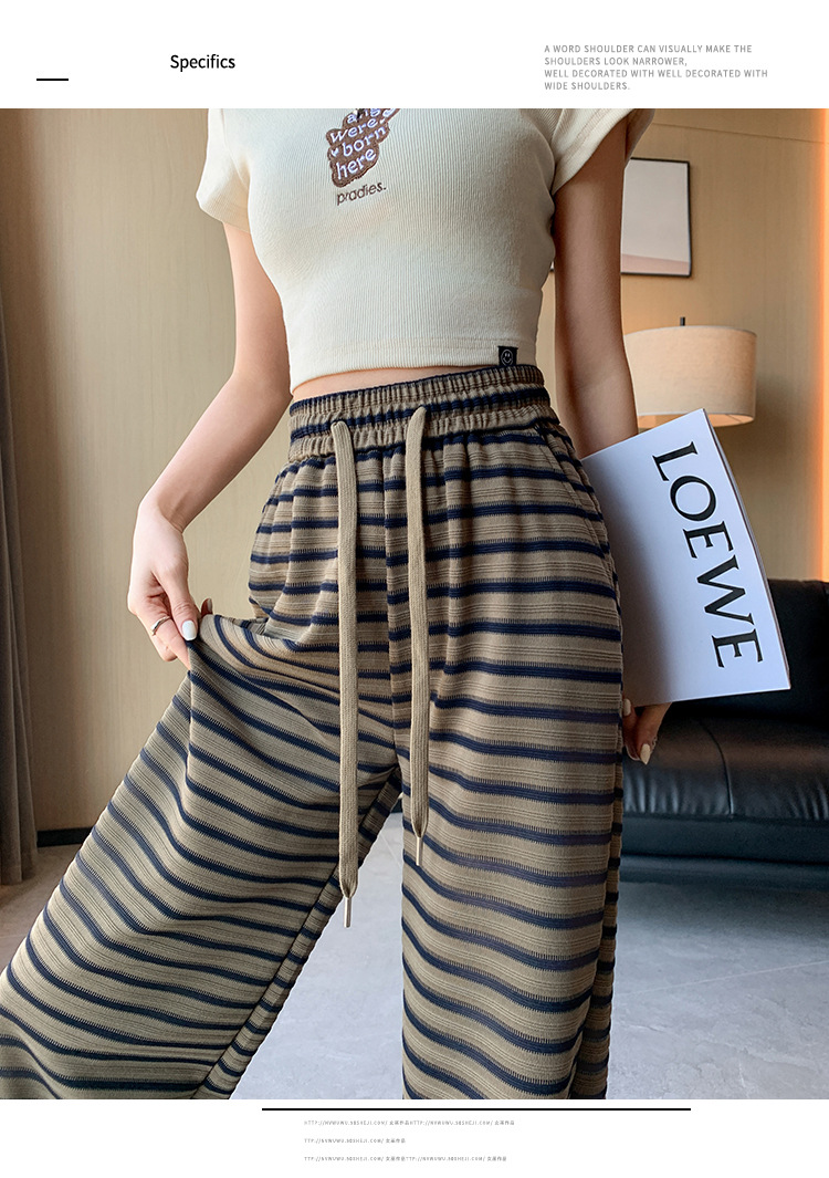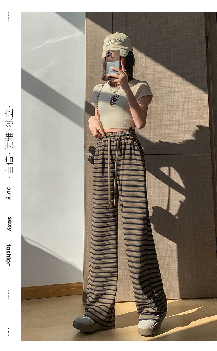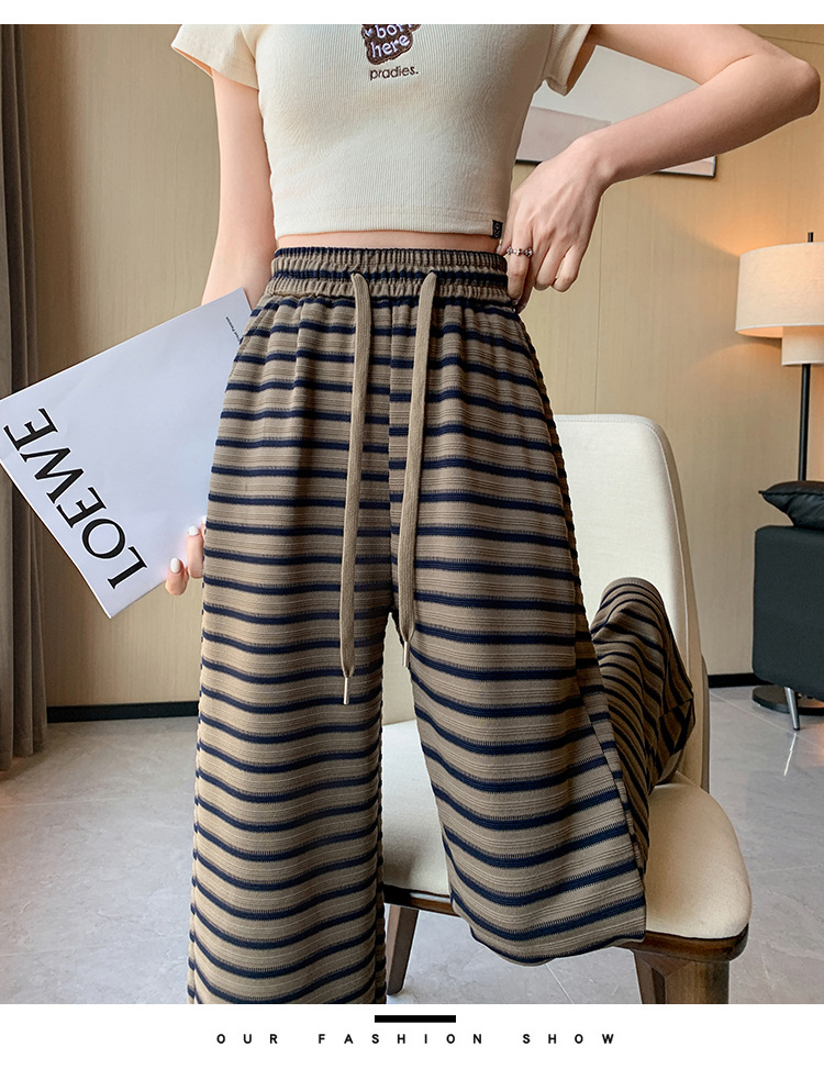 条纹休闲阔腿裤女2024夏季高腰宽松时尚韩版潮流显瘦直筒拖地长裤