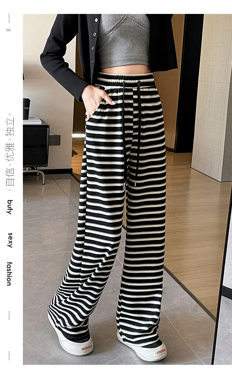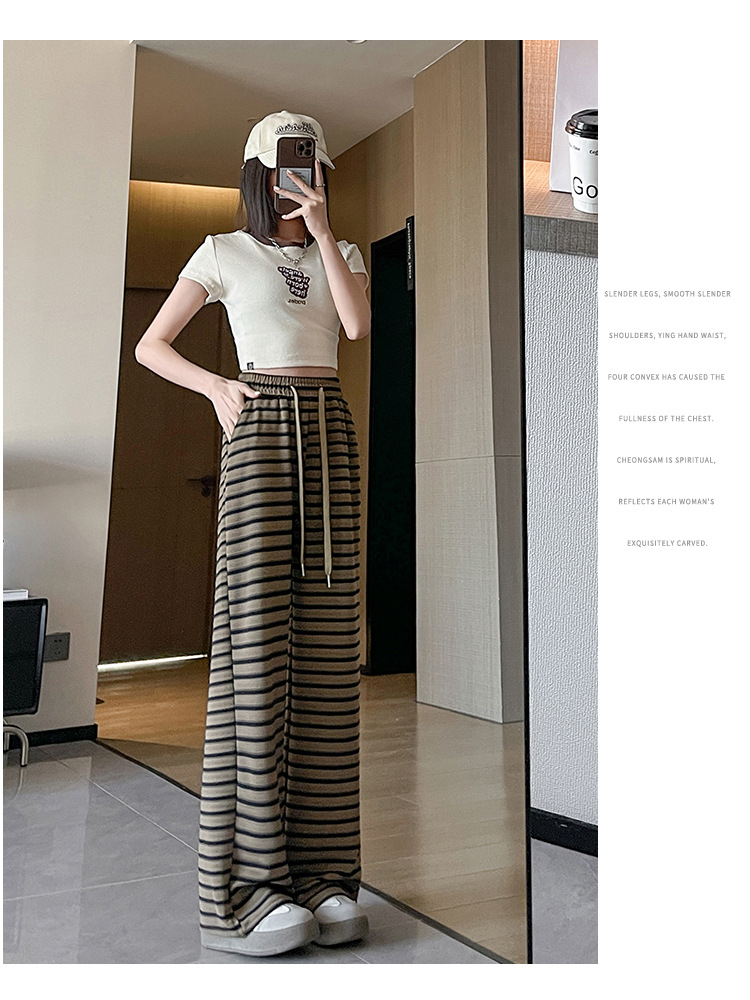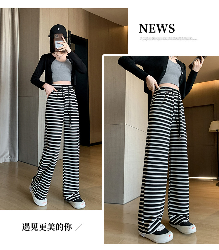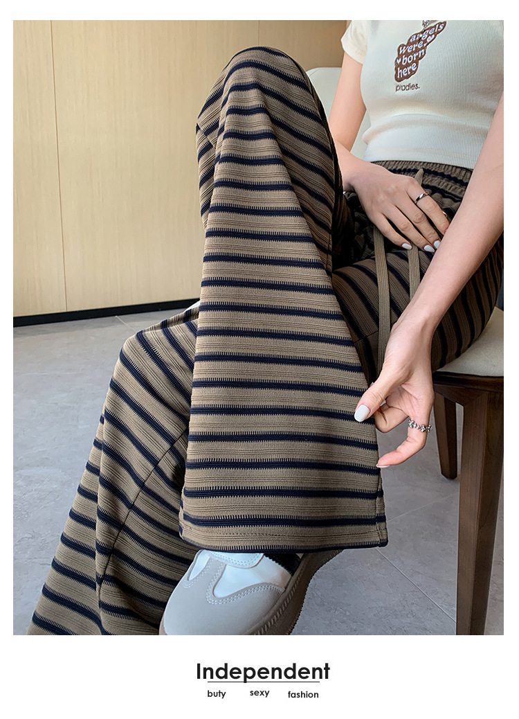条纹休闲阔腿裤女2024夏季高腰宽松时尚韩版潮流显瘦直筒拖地长裤