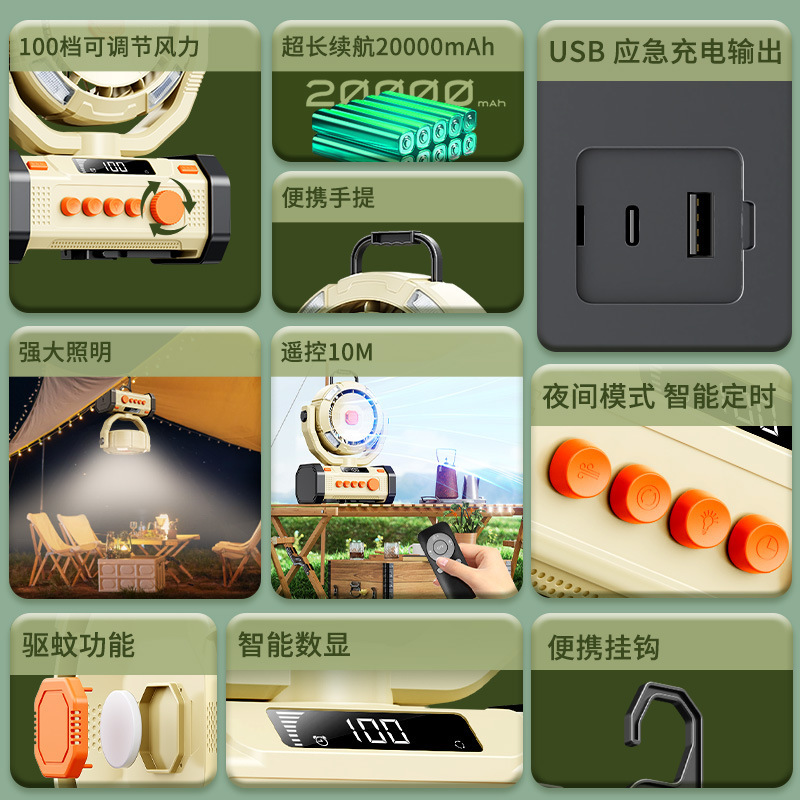 新款 B08露营可充电超长续航运动户外风扇大风力无级调速照明灯