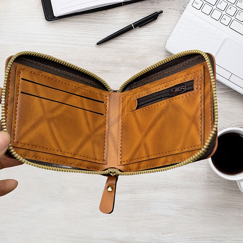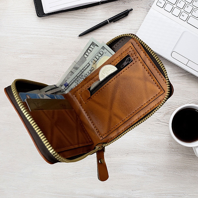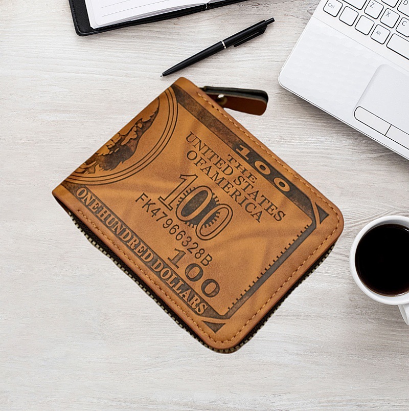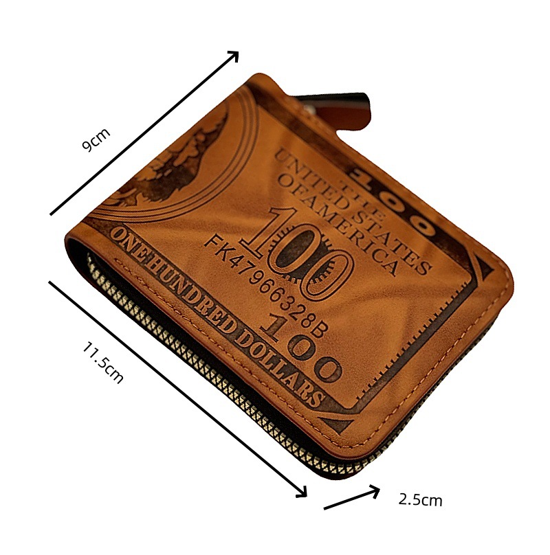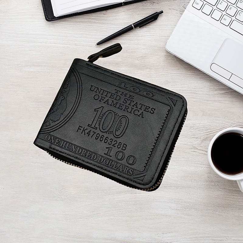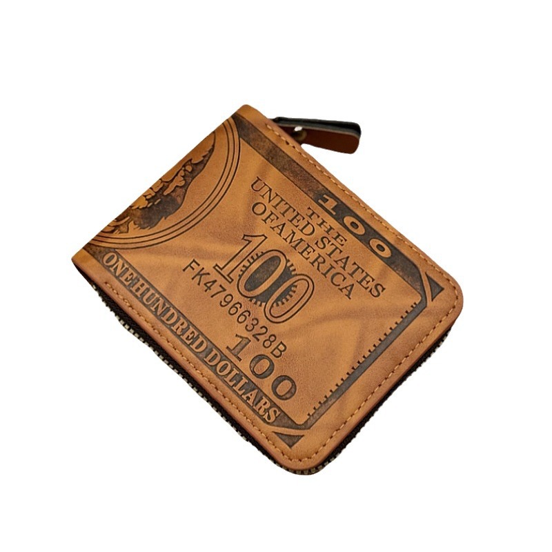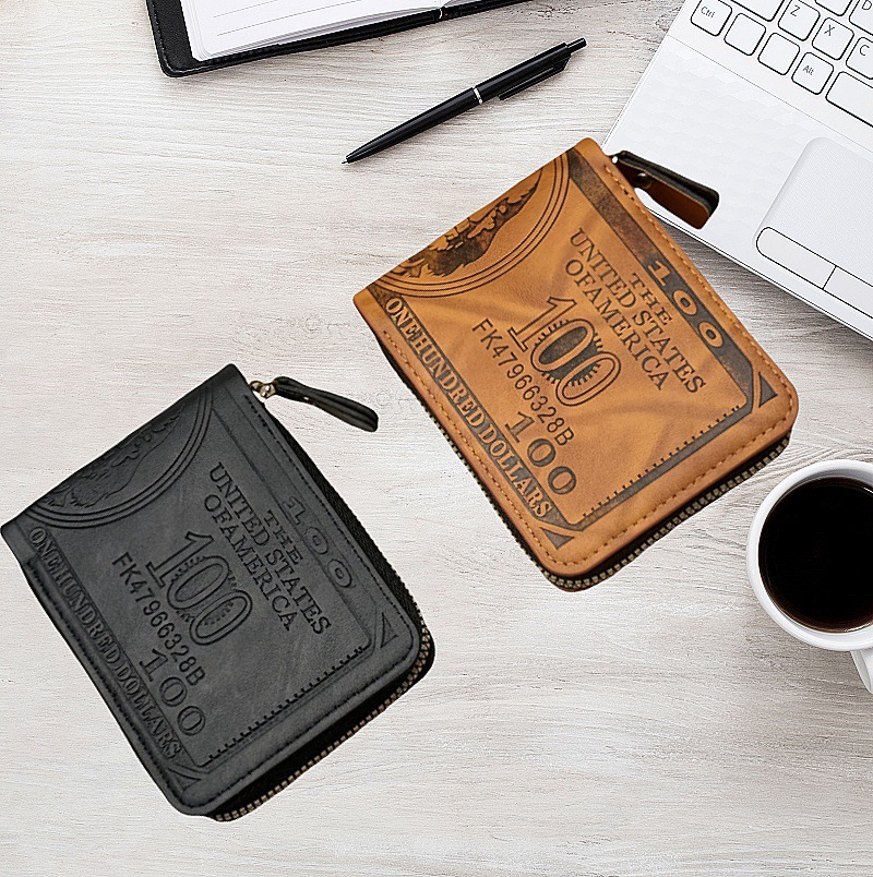 厂家直销新款男款钱包 复古热压印美金PU钱包男士拉链短款零钱包