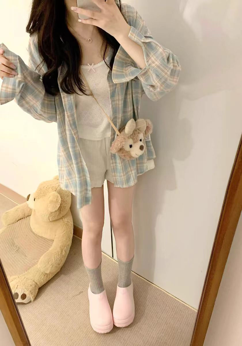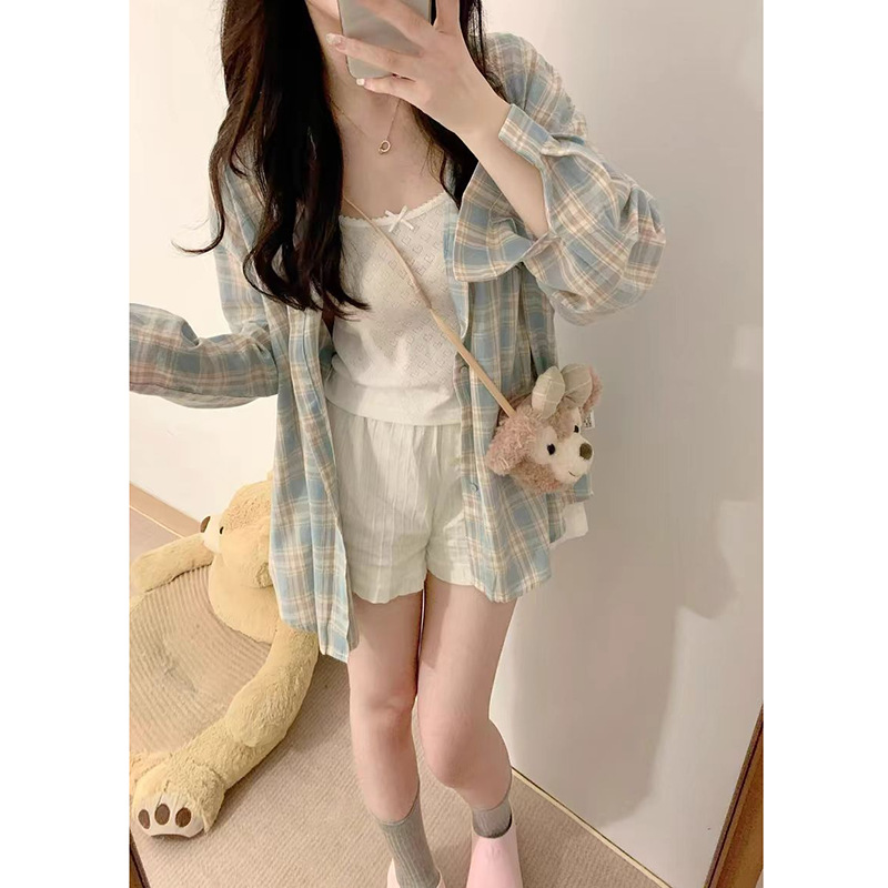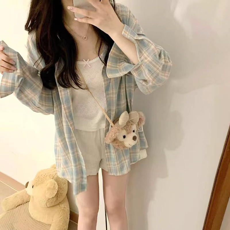 美式复古格子长袖衬衫女秋季防晒衬衣开衫外套中长款宽松显瘦上衣