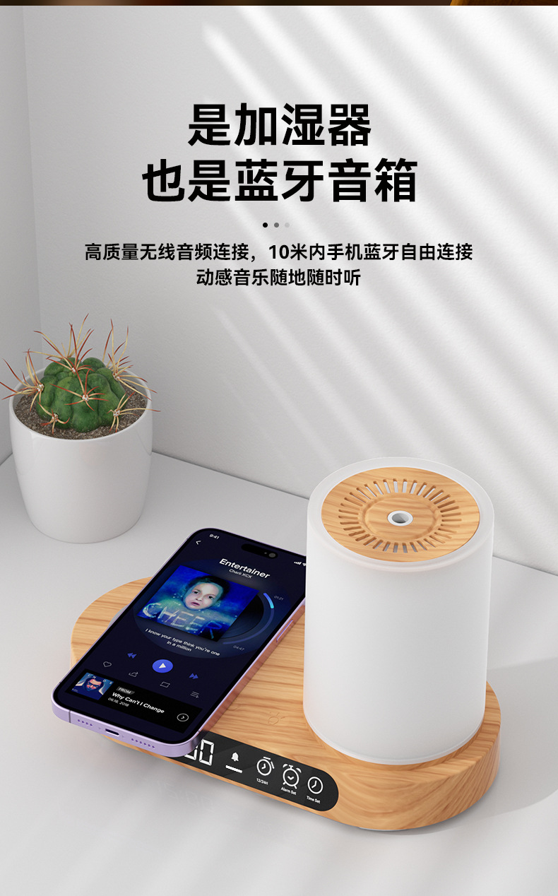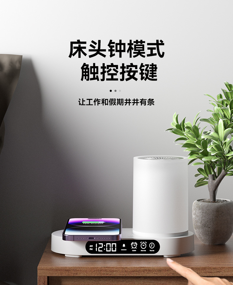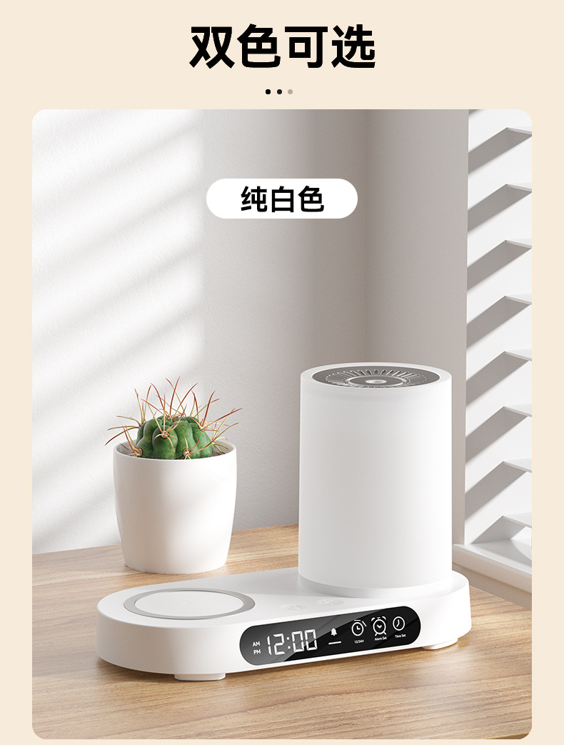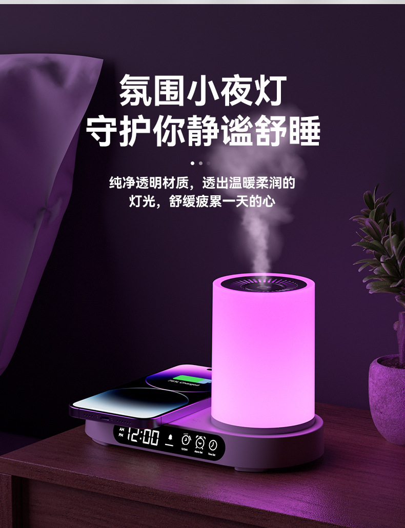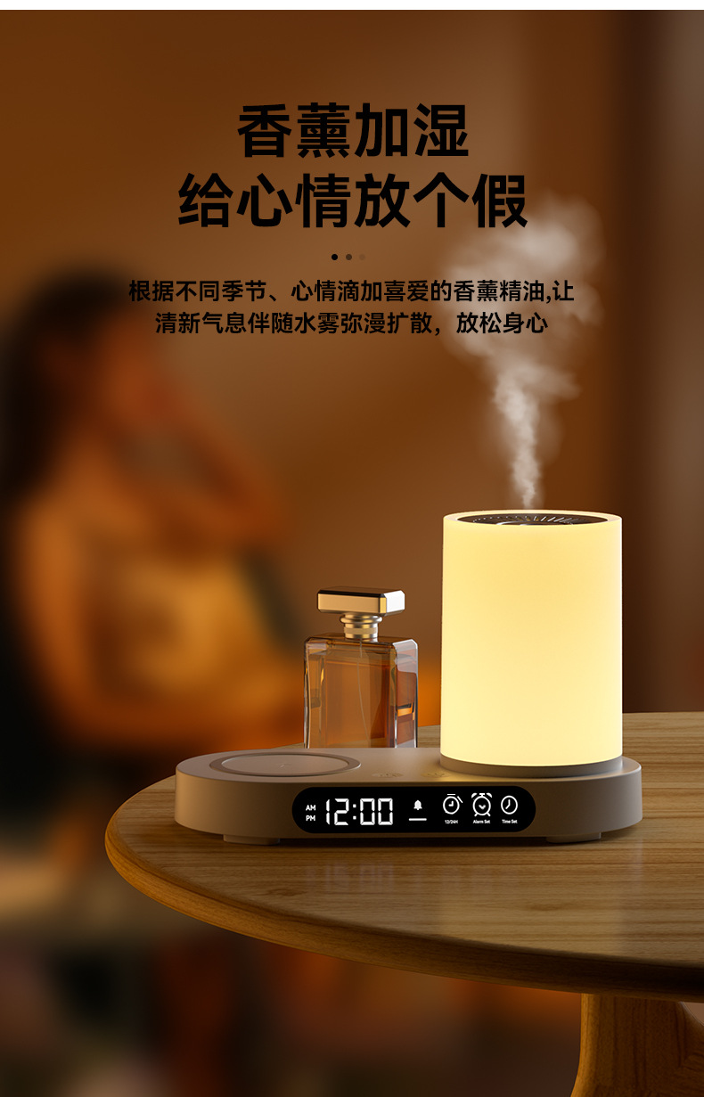 特色功能:手机无线充电器、香薰、加湿、时钟、闹钟、夜灯、蓝牙音响。