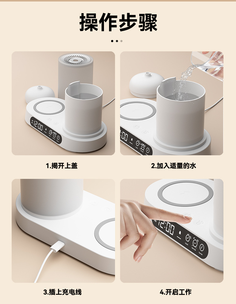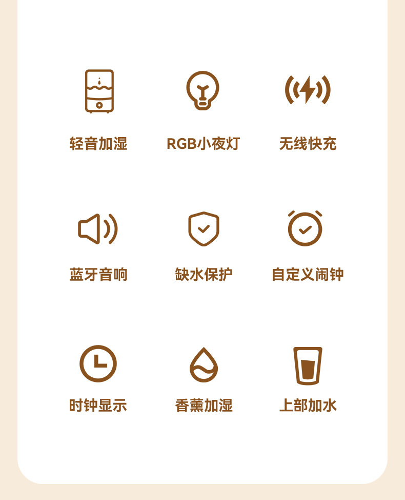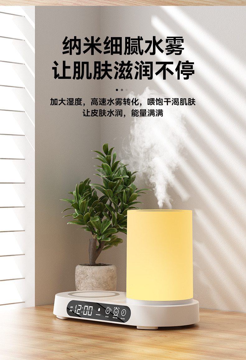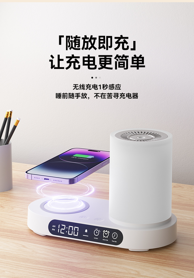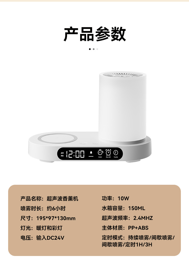 特色功能:手机无线充电器、香薰、加湿、时钟、闹钟、夜灯、蓝牙音响。