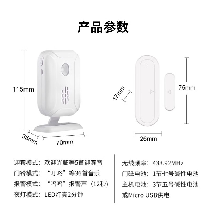 (也可调节为你好欢迎光临或者其他提示声,共41种铃声)。门磁和响铃之间是分开的,