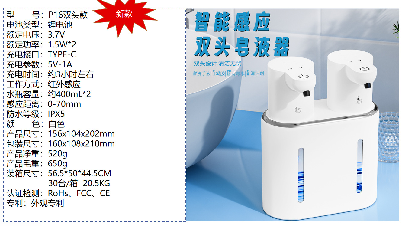 新款P16自动感应皂液器电动泡沫机双头皂液洗手机壁挂洗手液机