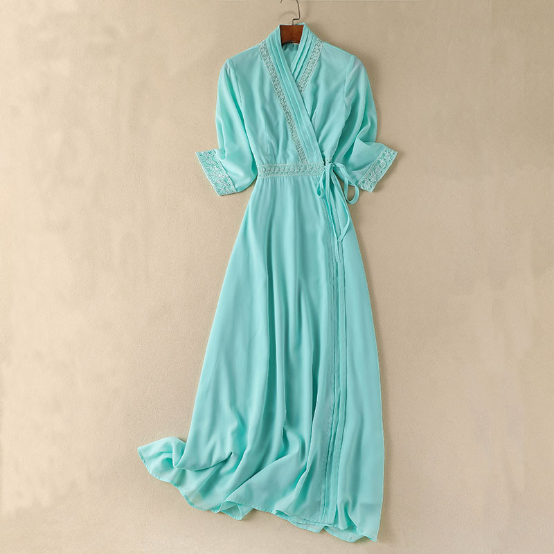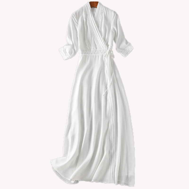 抖音同款汉服七分袖V领系带长裙显瘦女春夏秋季复古民族风文艺范