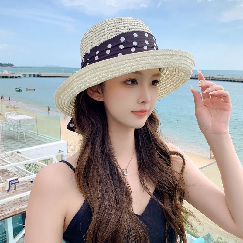 夏季帽子女波点飘带草帽旅游出行沙滩帽大沿防晒遮阳帽翘沿太阳帽