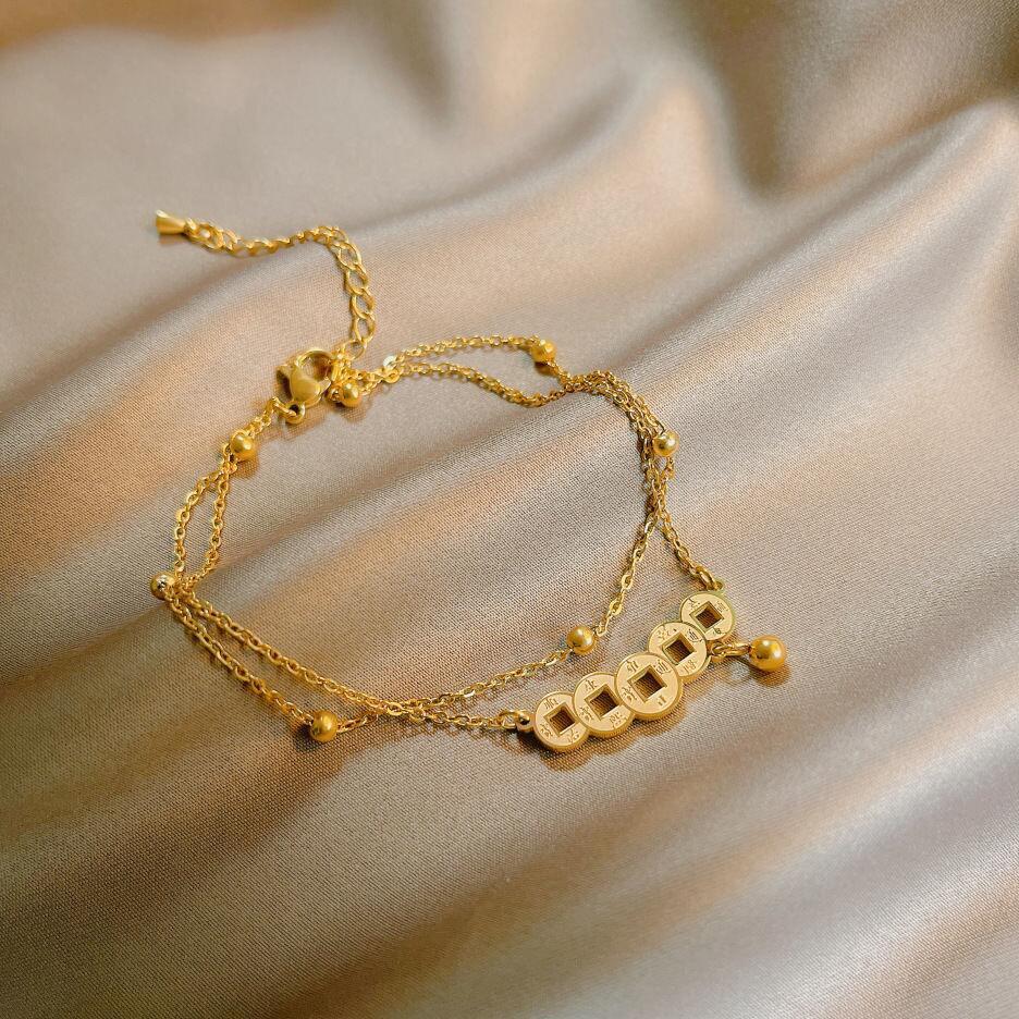 复古铜钱2022新款足链女人足链钛钢不掉色小众设计铃铛脚裸链性感