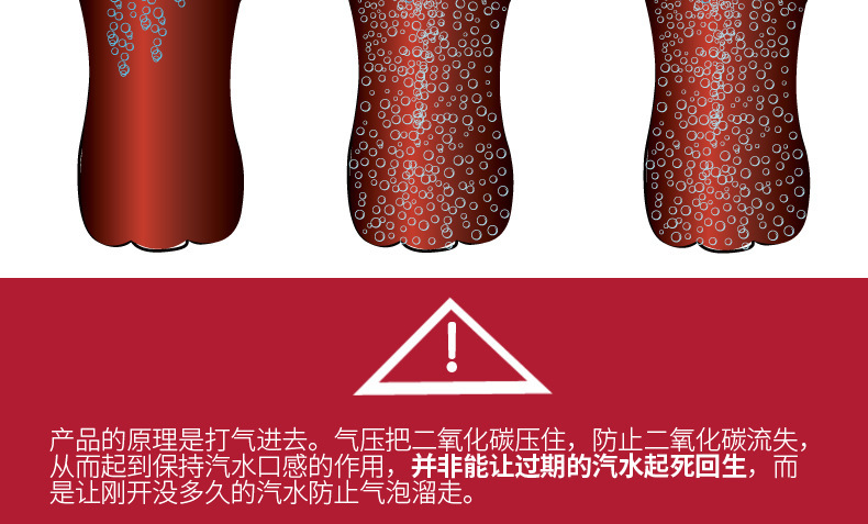 是把气体打进去,气压把二氧化碳压住,防止二氧化碳流失,从而起到保持汽水口感的作用,而并非能让过期的汽水起死回生,而是让刚打开没多久的汽水饮料防止气泡溜走!!!