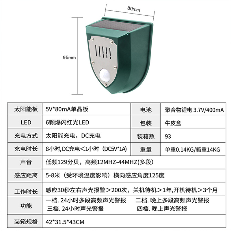 感应款:1档24小时感应声光警报模式,2档晚上感应声光警报模式,3档晚上循环10分钟声光报警。 定时款:1档晚上循环5分钟声光报警,2档间隔10分钟工作一次,3档间隔20分钟工作一次。