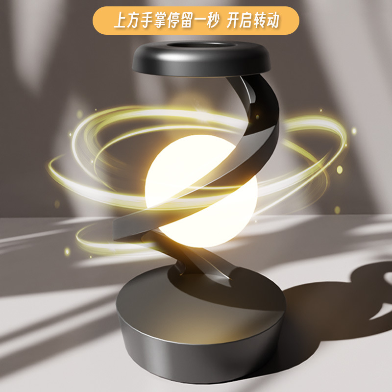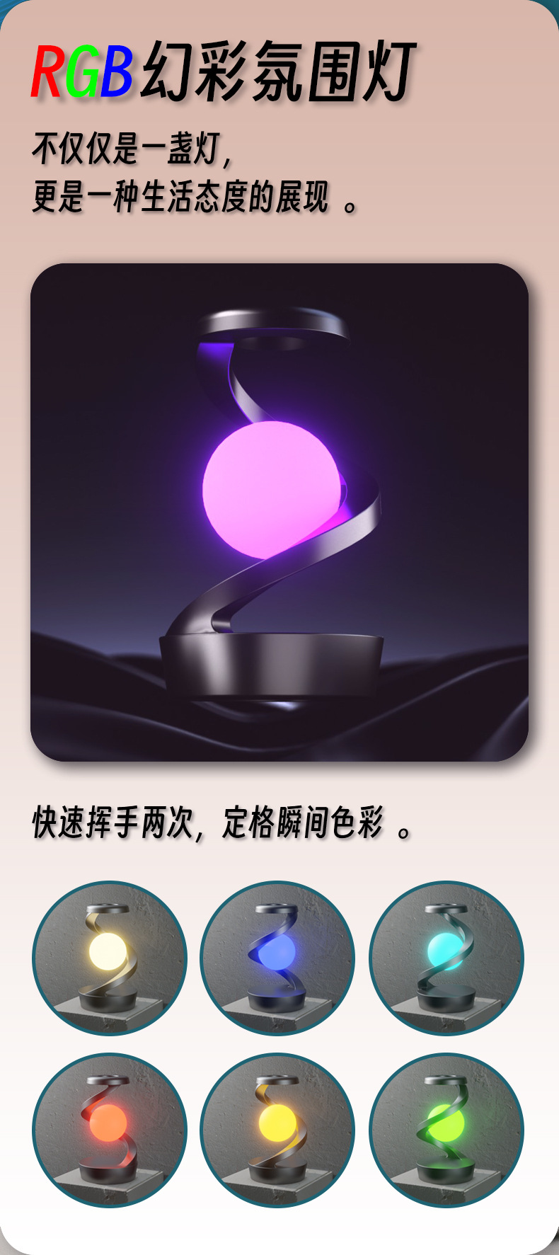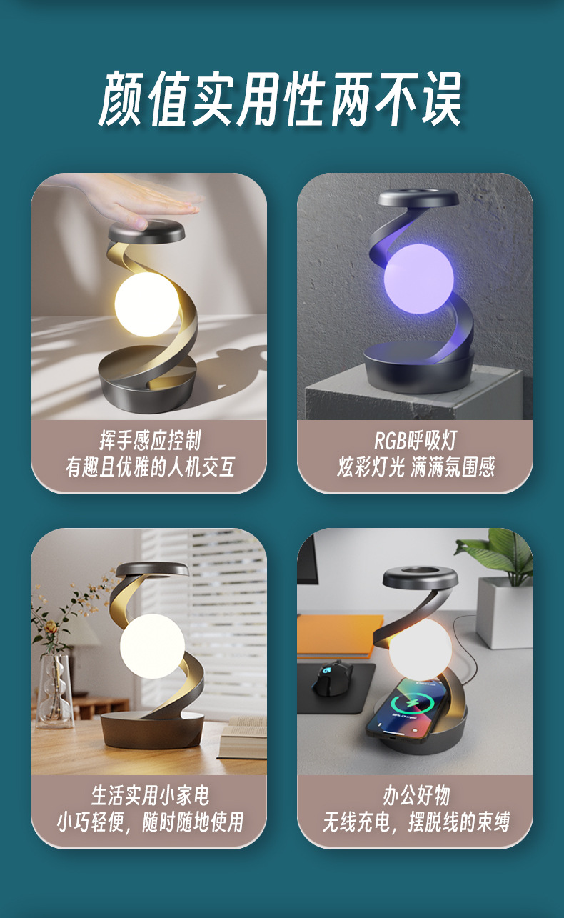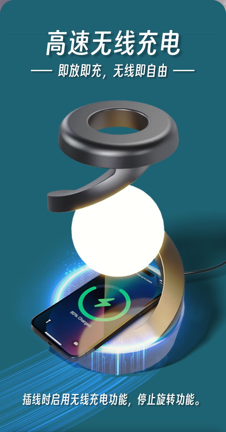 跨境新款10W无线充夜灯感应旋转RGB七彩氛围视觉悬浮充电台灯