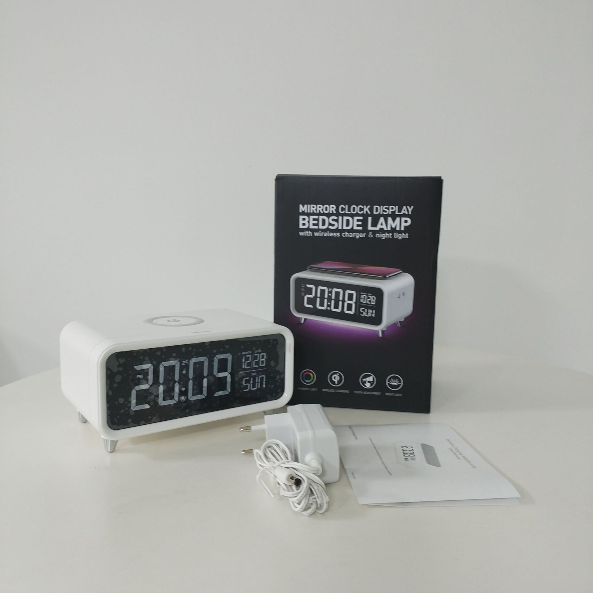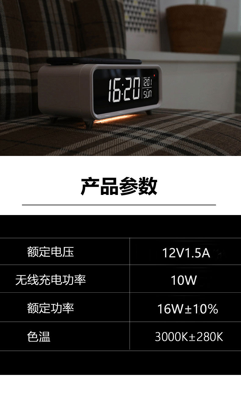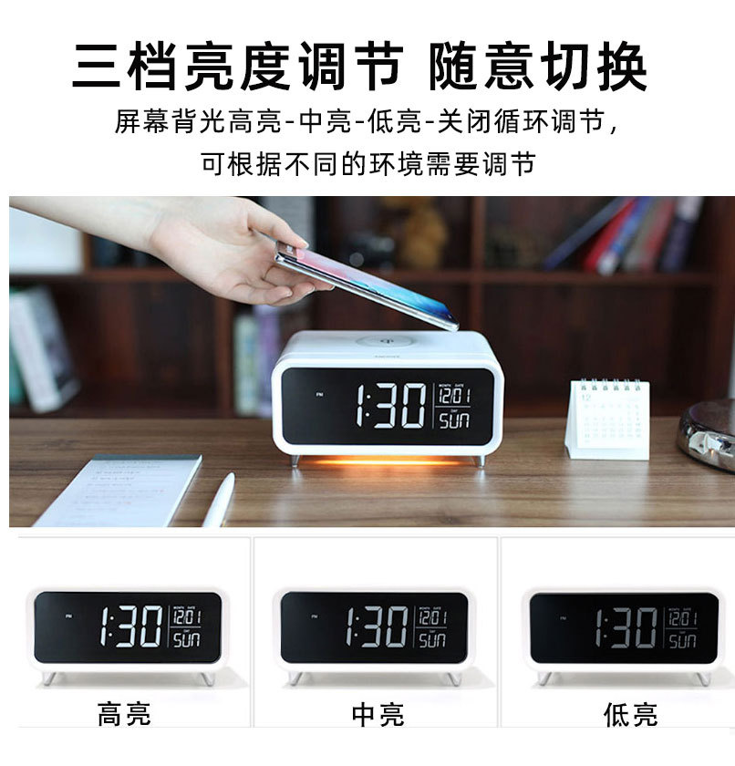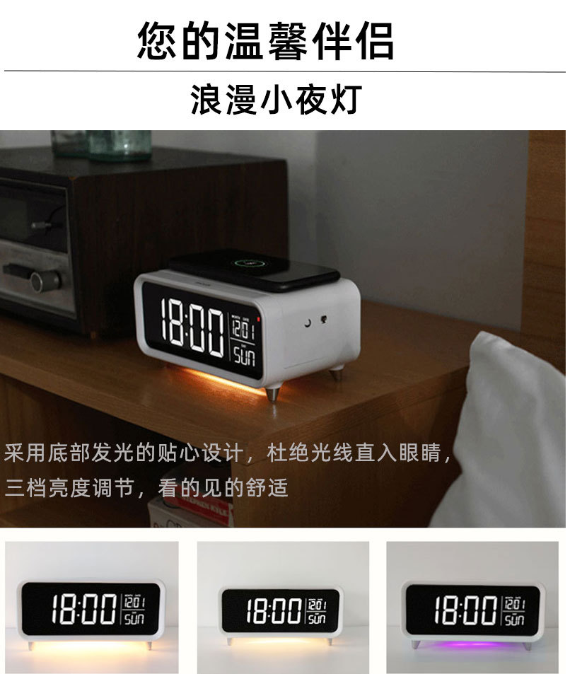 源头QI无线充床头夜灯居家礼品便捷LCD万年历时钟插电台灯