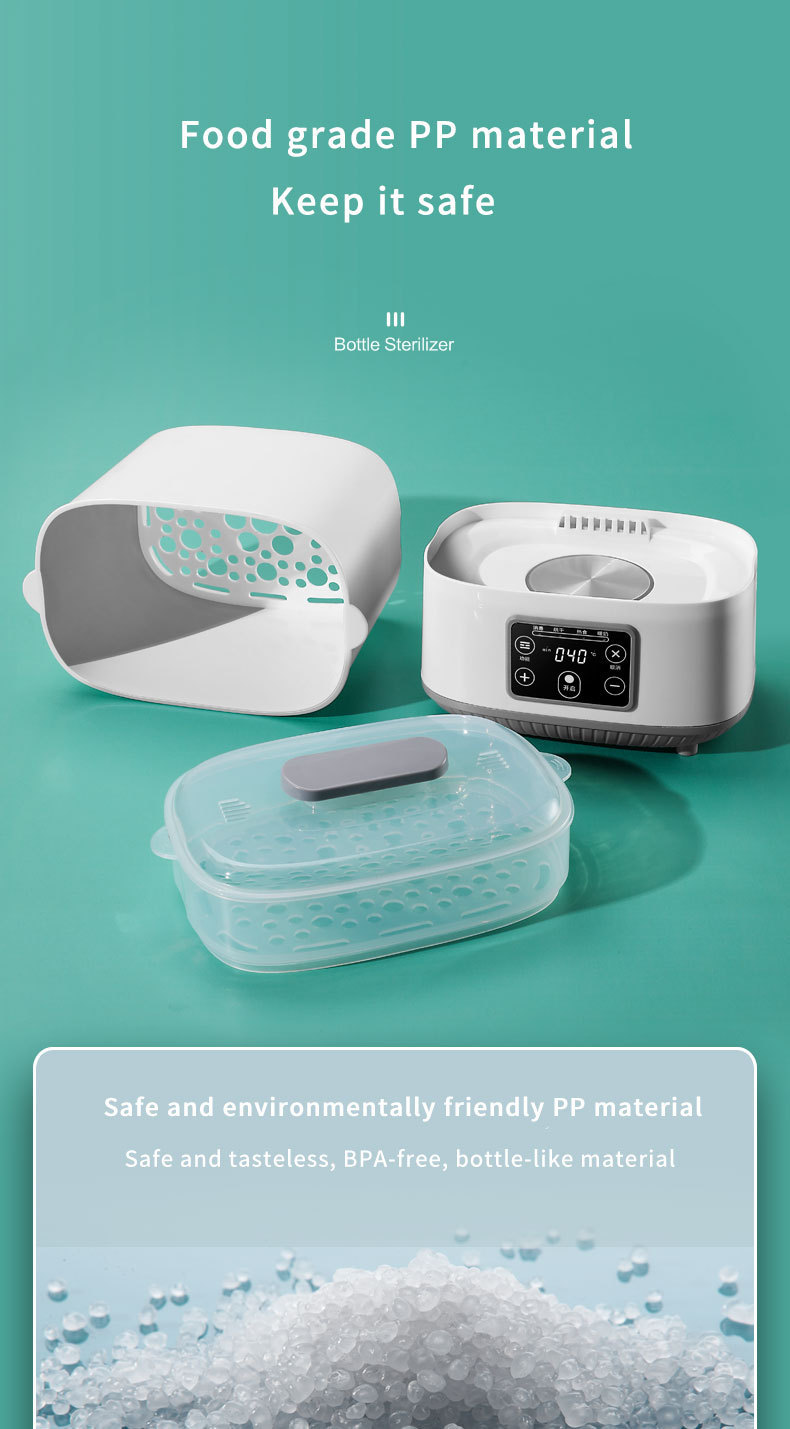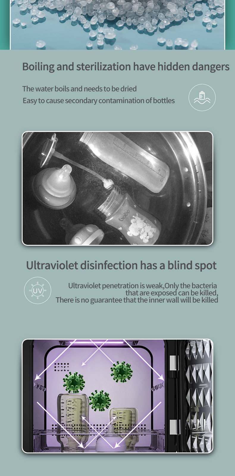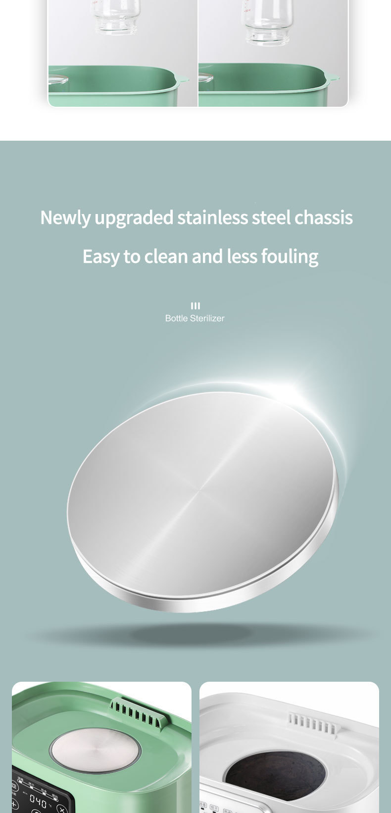 产品发热部位由原来的不锈钢发热盘升级成陶瓷釉不粘锅涂层(不锈钢+涂层),能更好的起到一个防水垢的作用,同时无异味能更好清洁奶瓶奶嘴。