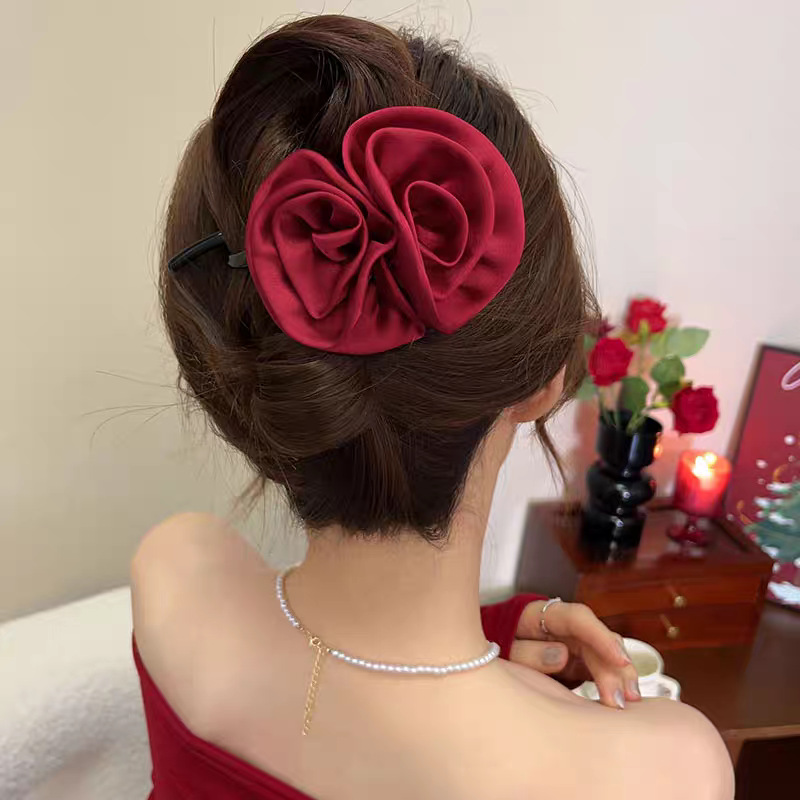 酒红色玫瑰花抓夹女2024新年新款喜庆双花发夹后脑勺盘发鲨鱼夹子