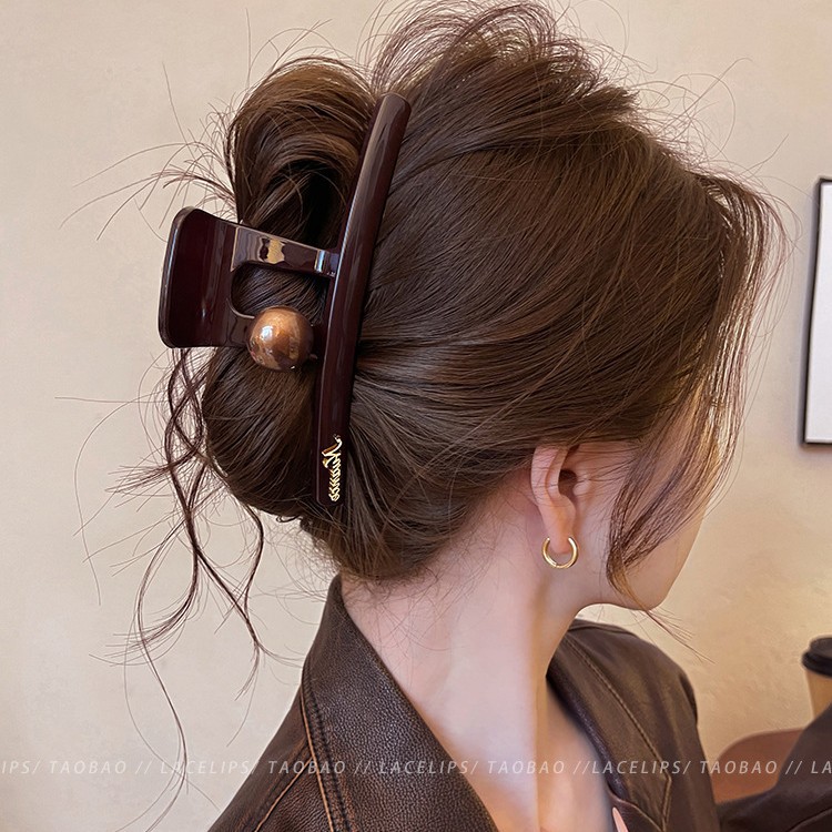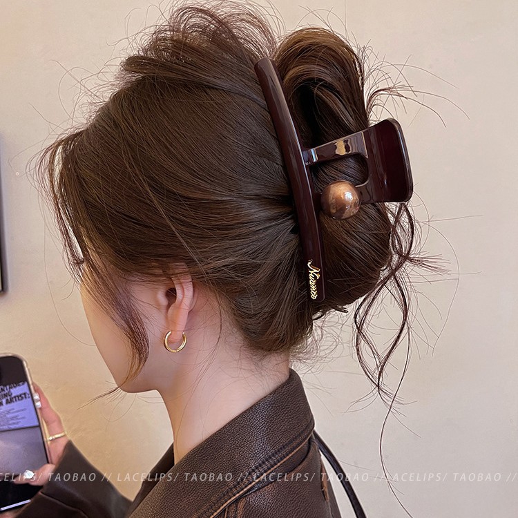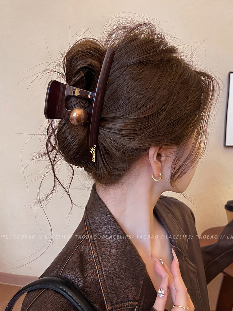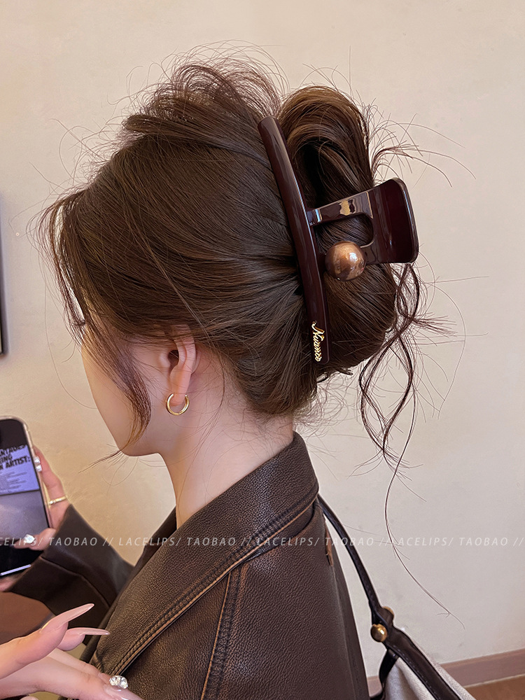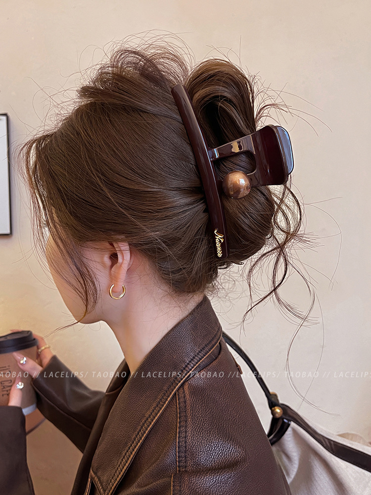 圆棕珠字母标抓夹2025新款后脑勺发量多大号鲨鱼夹高级感发夹头饰