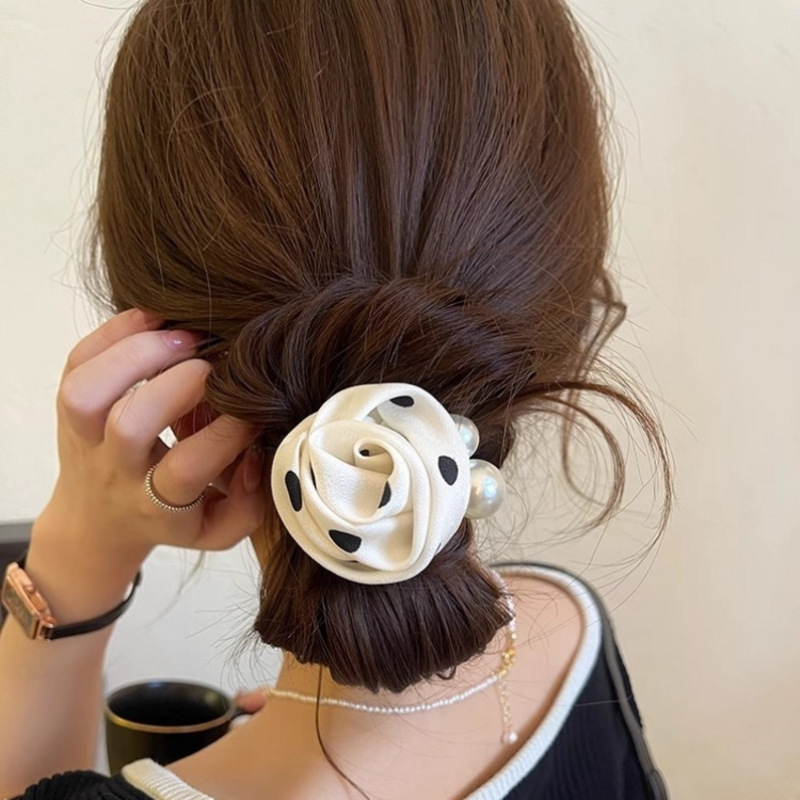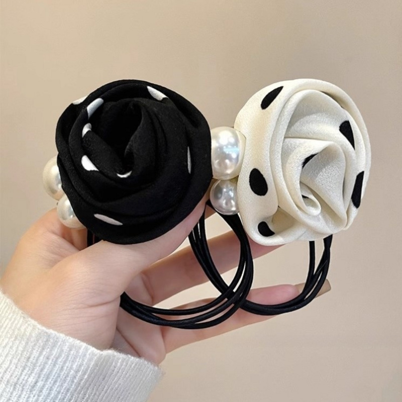 韩系珍珠撞色波点玫瑰花发绳简约高级感扎马尾头绳高弹橡皮筋发圈