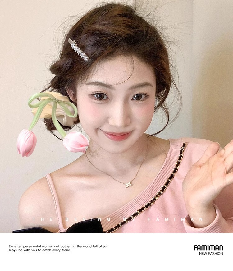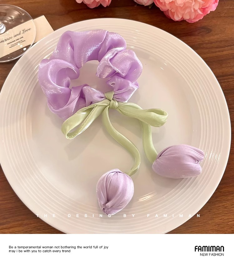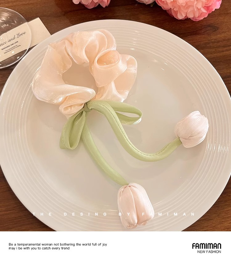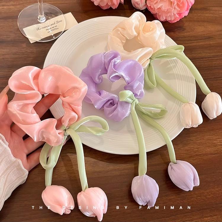 粉色郁金香花苞飘带大肠发圈2025新款高级感森系扎头发绳花朵发饰
