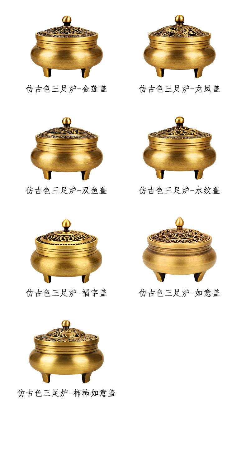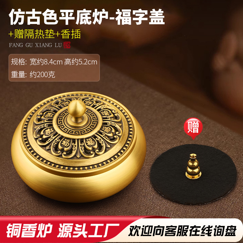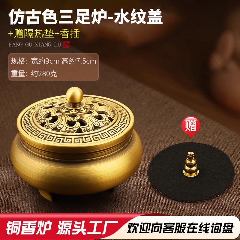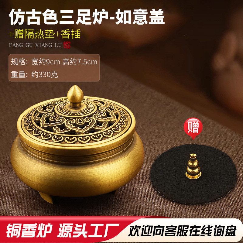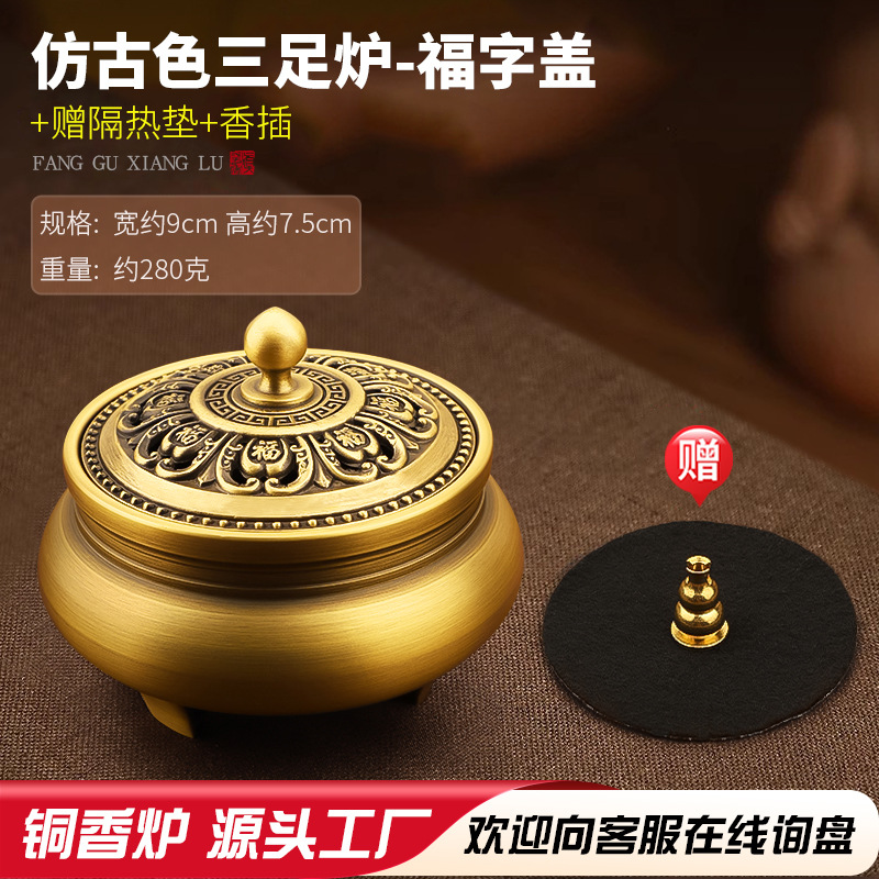 黄铜香炉带盖平底三足小香炉插香家用盘香炉摆件上香批发工艺品