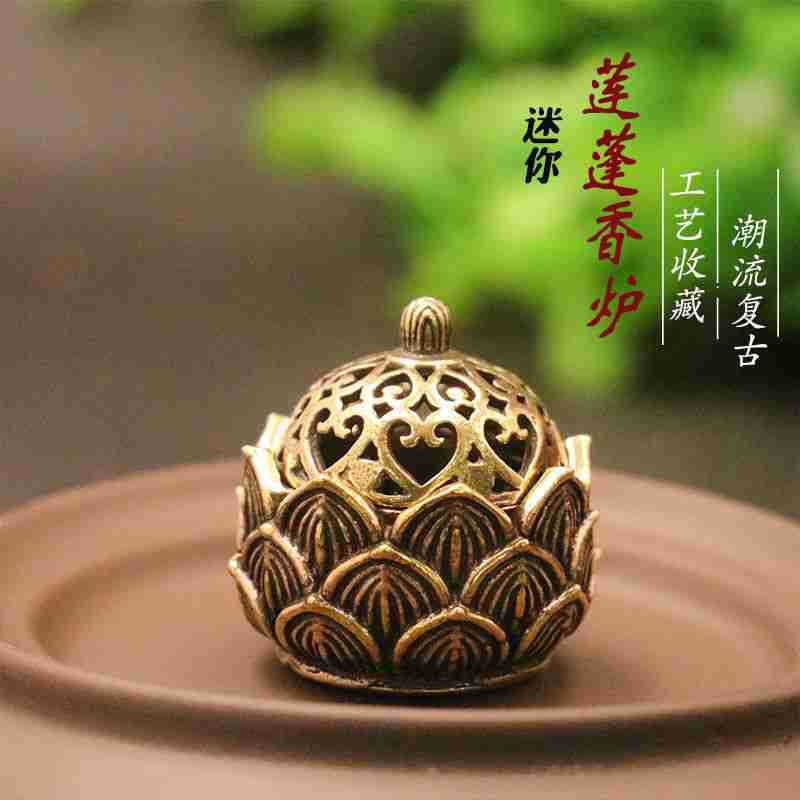 迷你镂空莲花香炉家用供奉插香纯铜小香炉手把件创意古玩摆件可爱