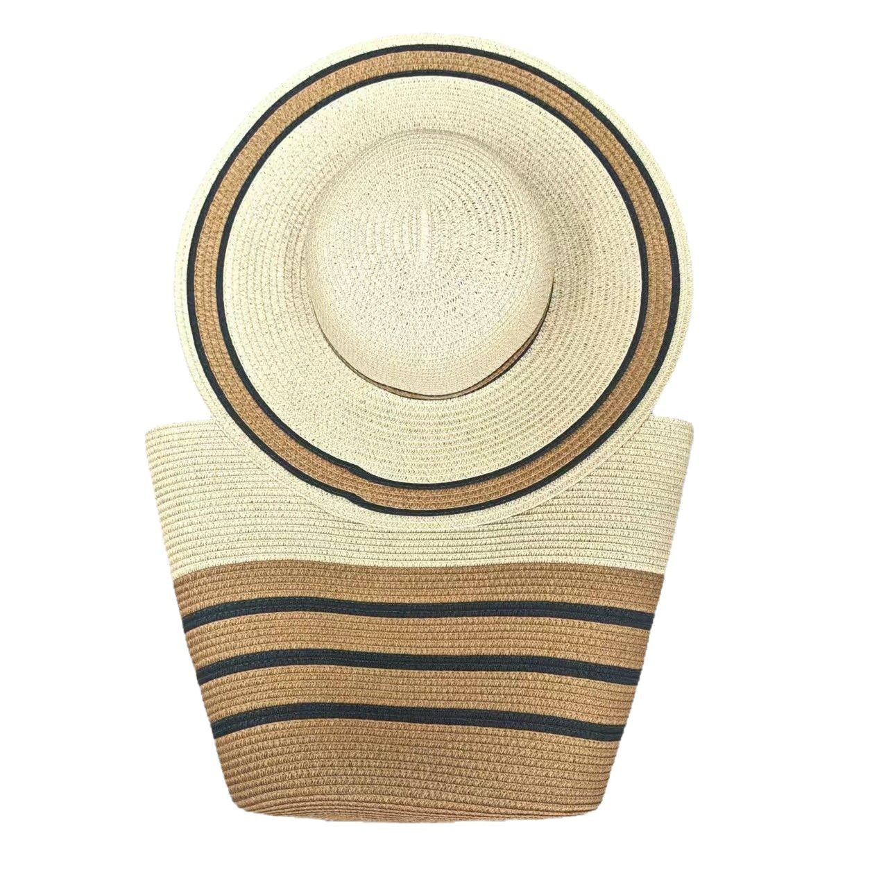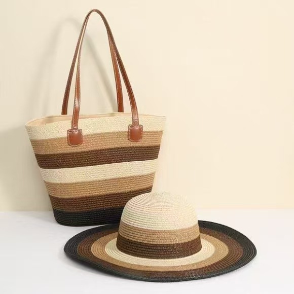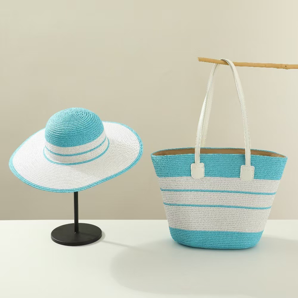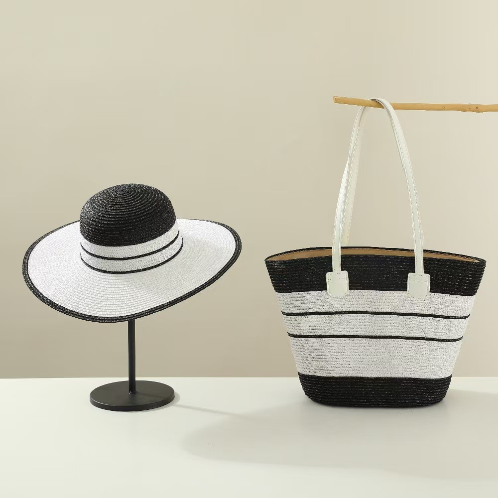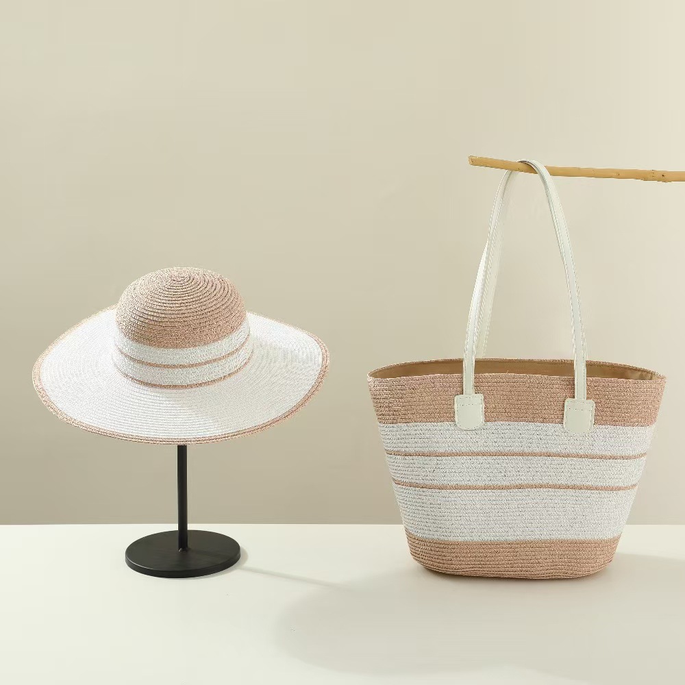 外贸两件套夏季草编包套装大檐条纹草帽和草编包包套装托特手提包