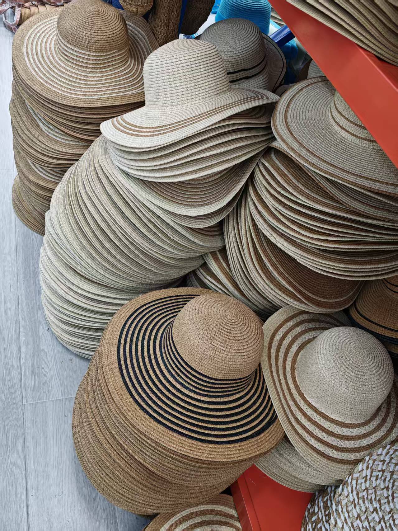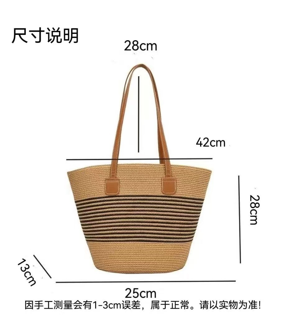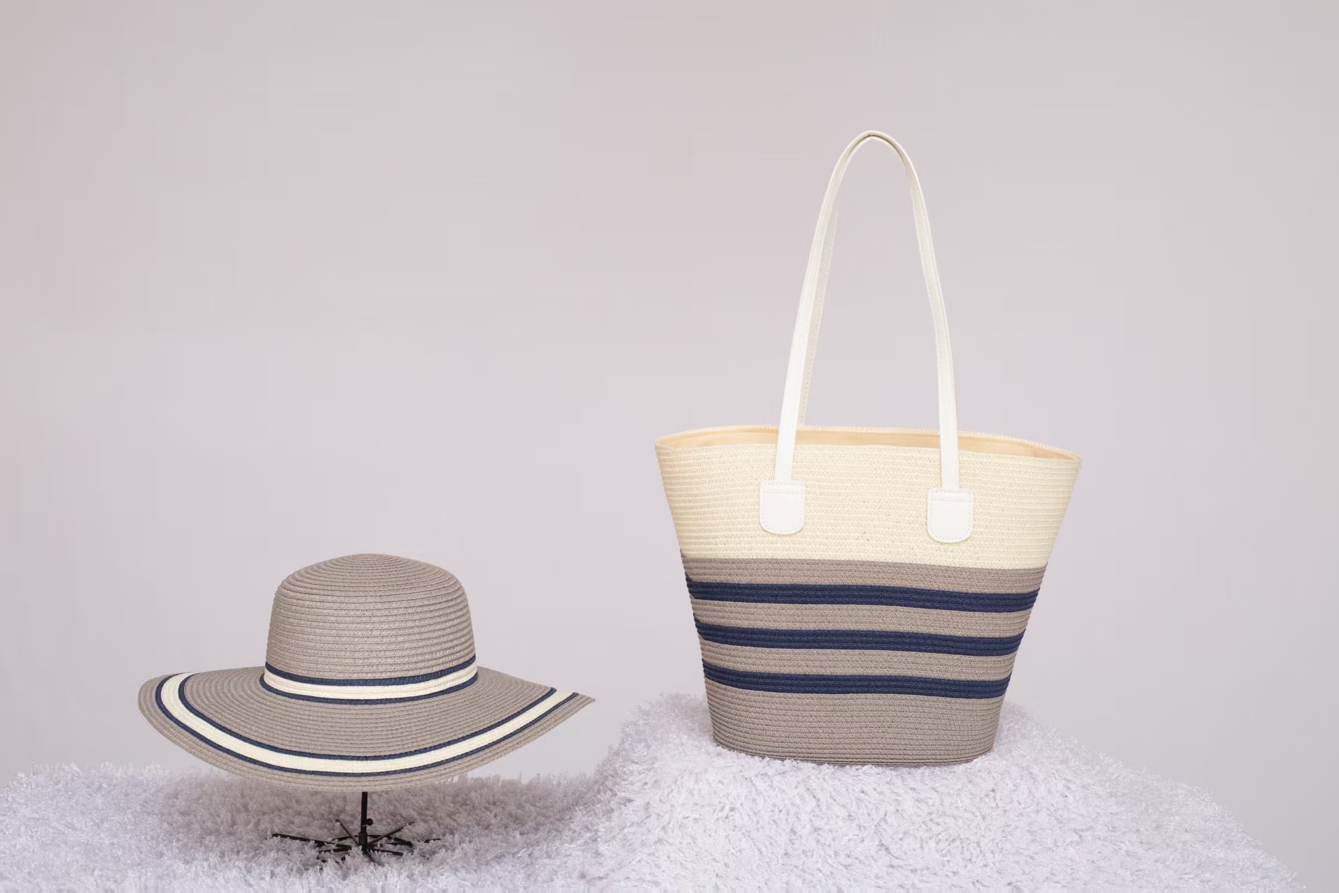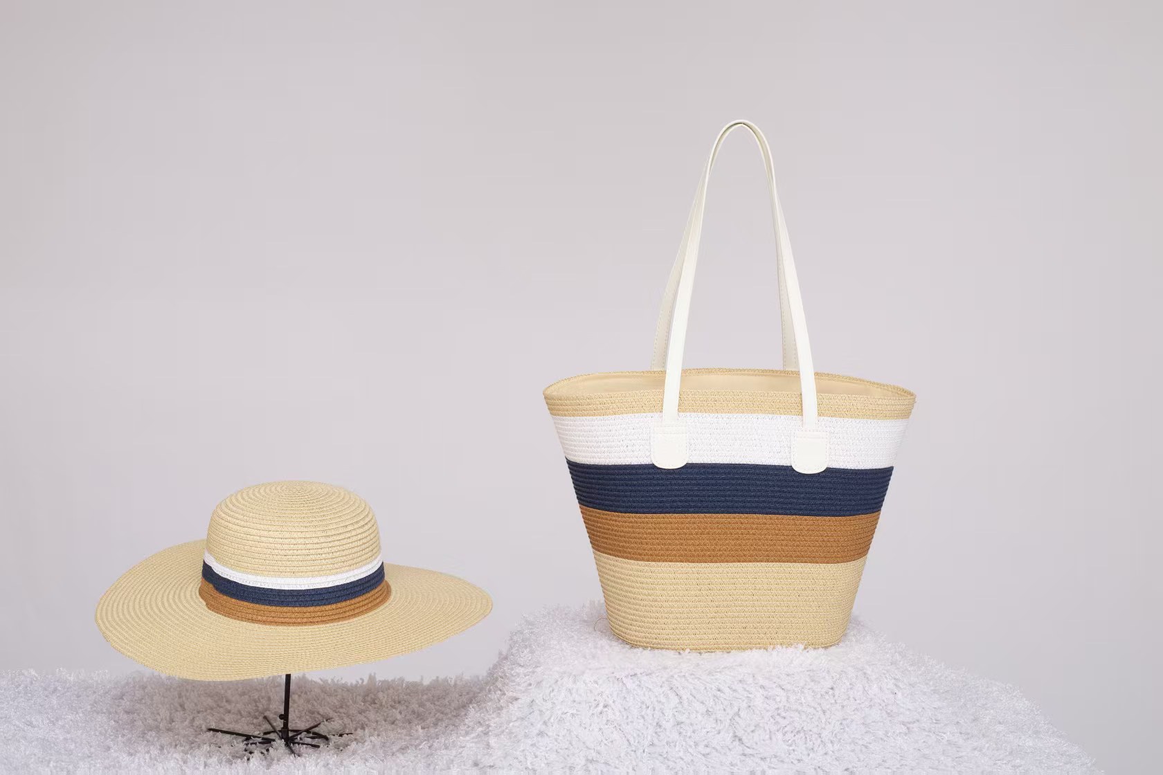 外贸两件套夏季草编包套装大檐条纹草帽和草编包包套装托特手提包