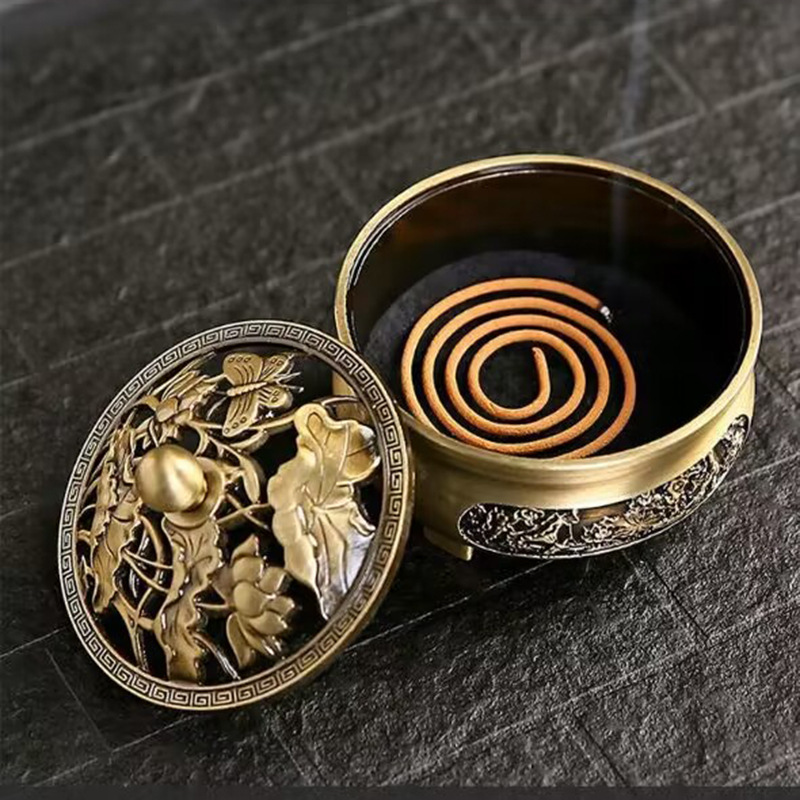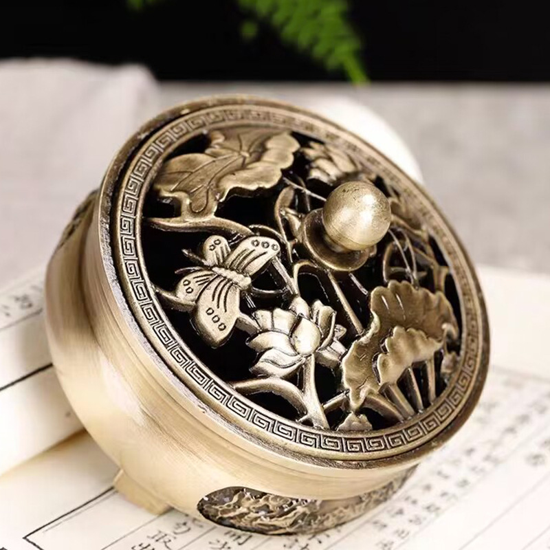 仿古合金三足雕花铜香炉纯铜盘香炉家用室内禅意茶道檀香香炉批发