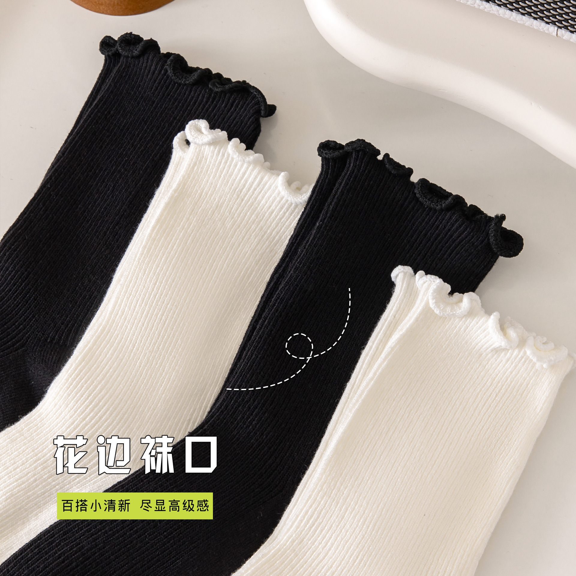 木耳边袜子女中筒袜纯色秋冬新款日系堆堆袜简约潮流学生无骨棉袜