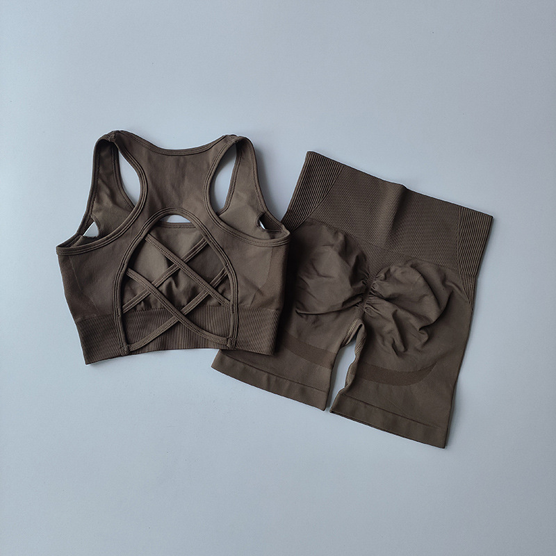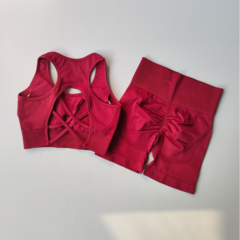 跨境新款无缝瑜珈套装瑜伽服短裤两件套健身跑步速干运动套装女