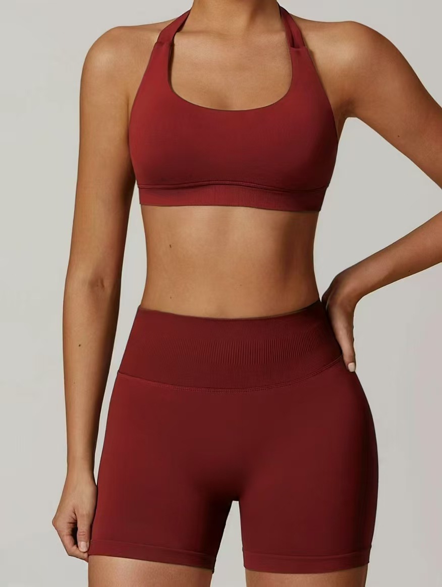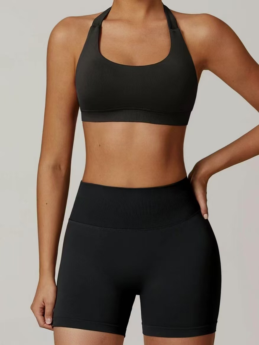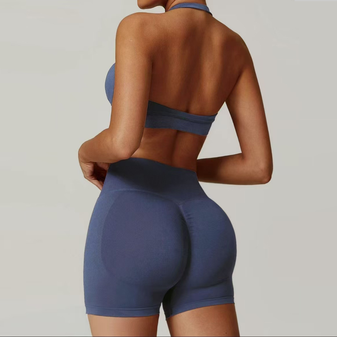 欧美跨境挂脖瑜珈套装女高腰瑜伽服套装紧身百搭健身短裤运动套装