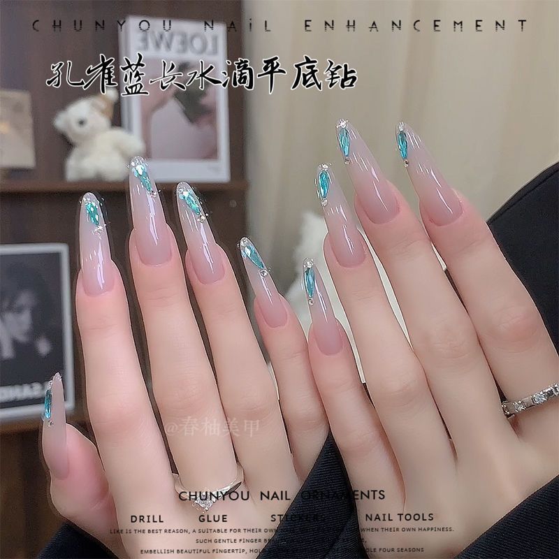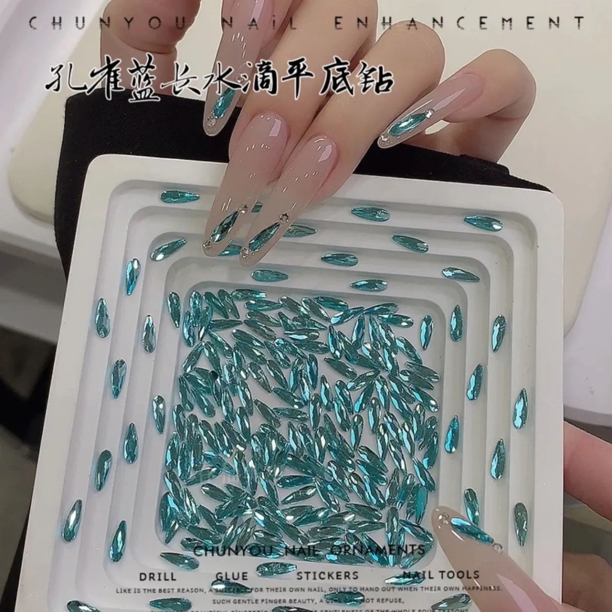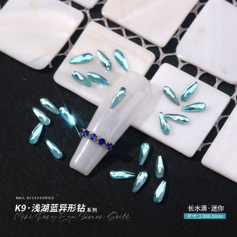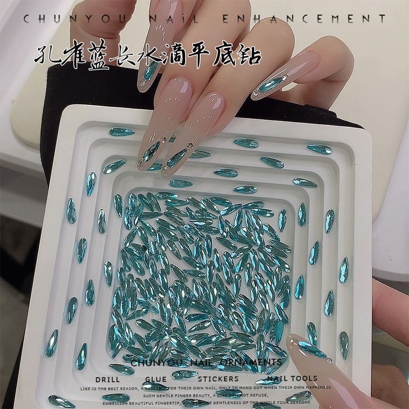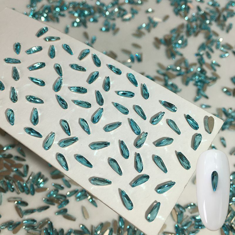 新款小号平底钻2*6长水滴浅湖蓝色细水滴美甲钻显白指甲装饰品