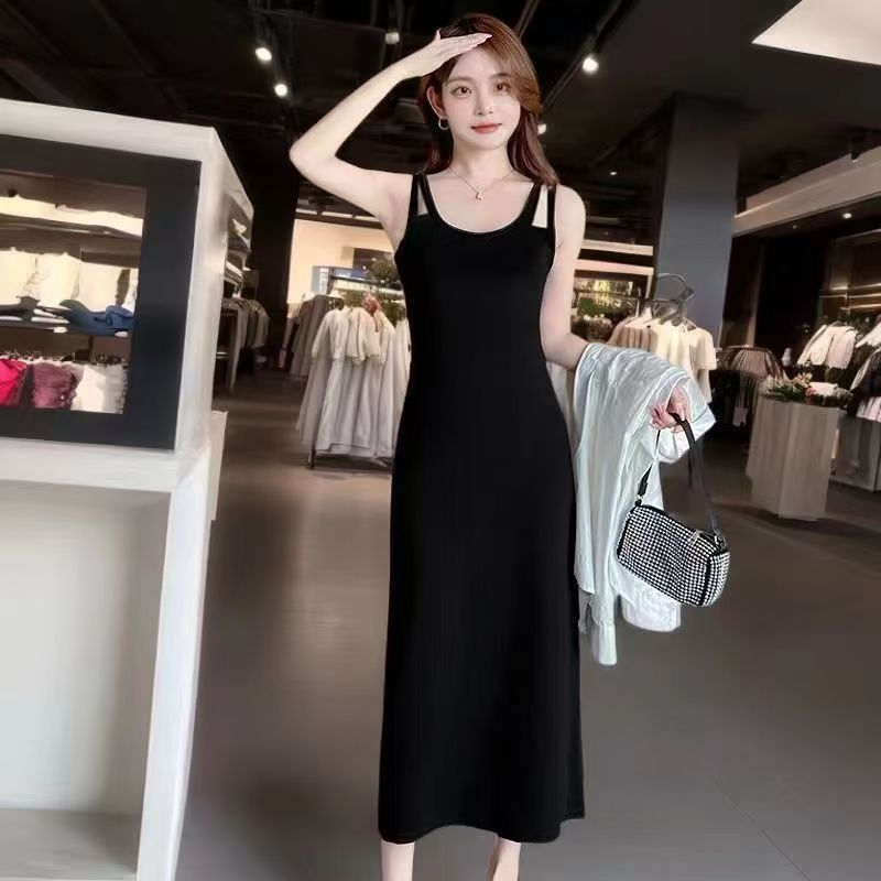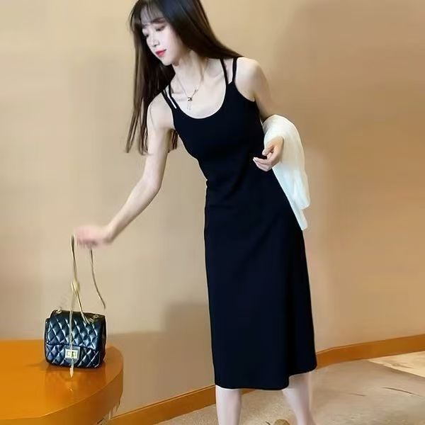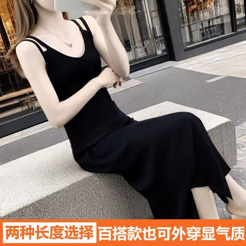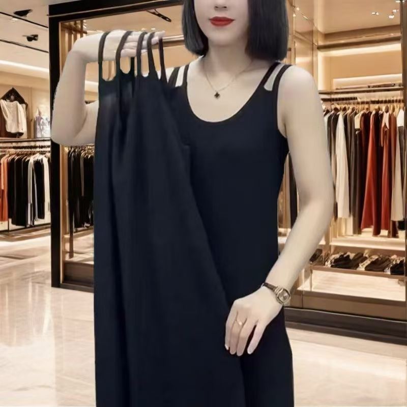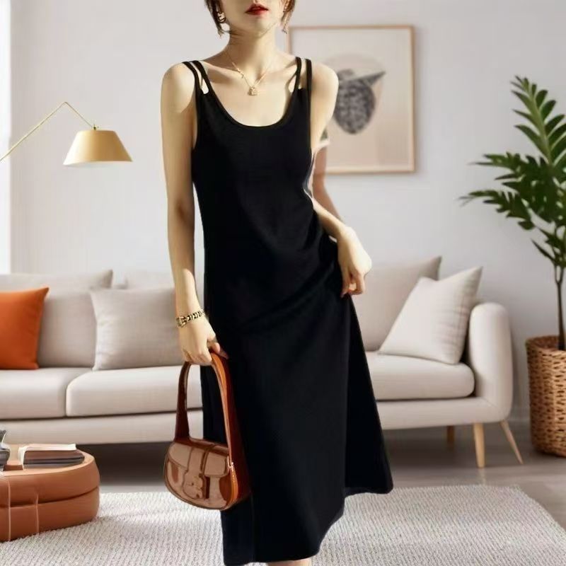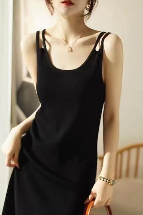 新中式黑色吊带连衣裙女2025新款法式中长款显瘦无袖背心打底裙子
