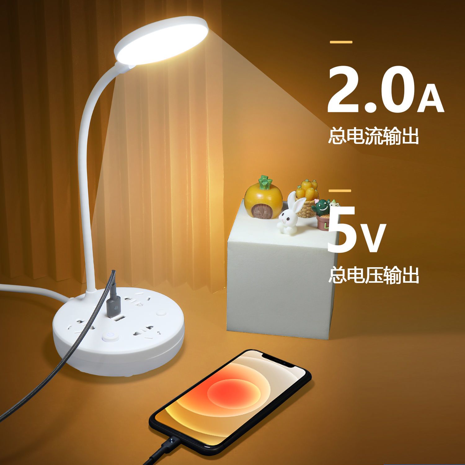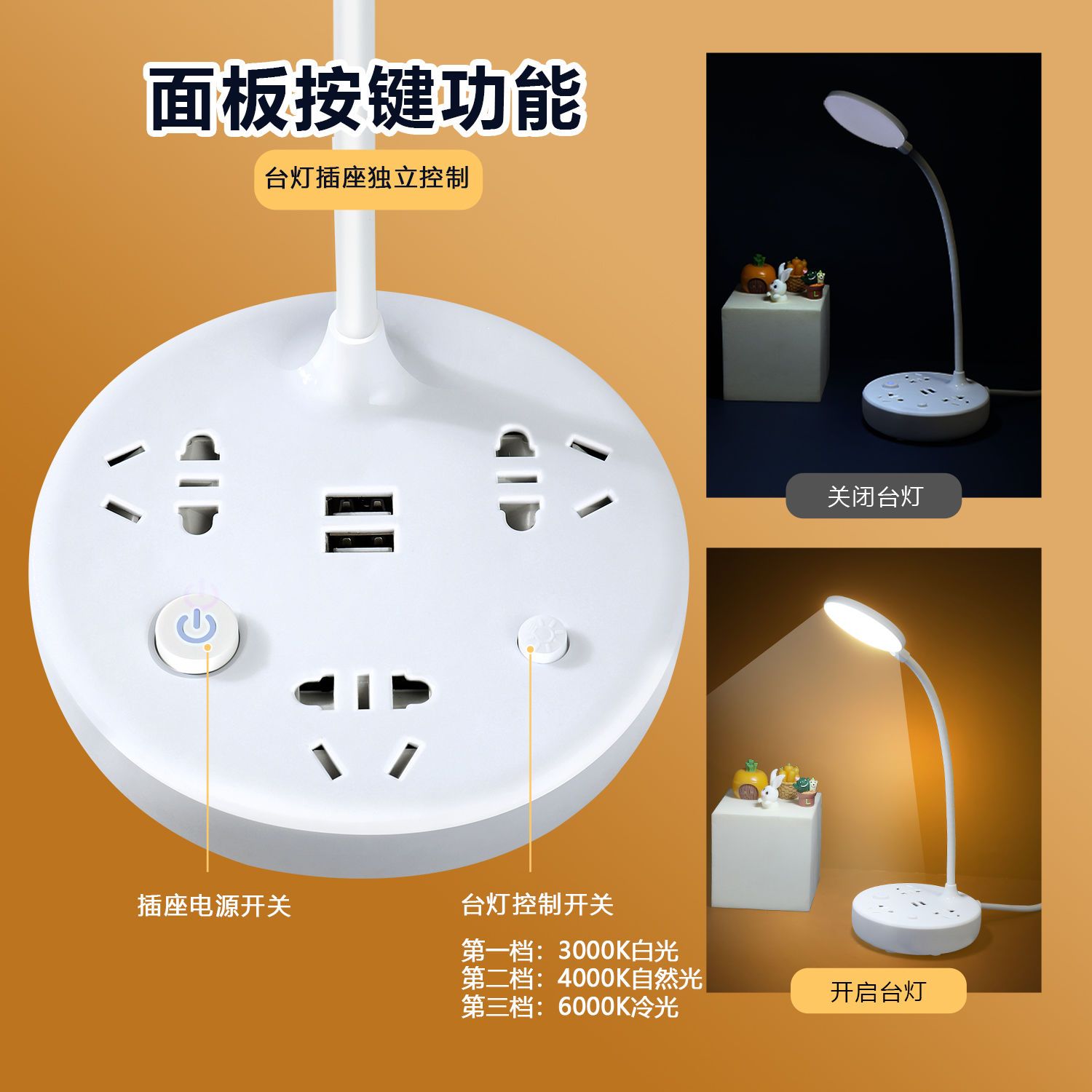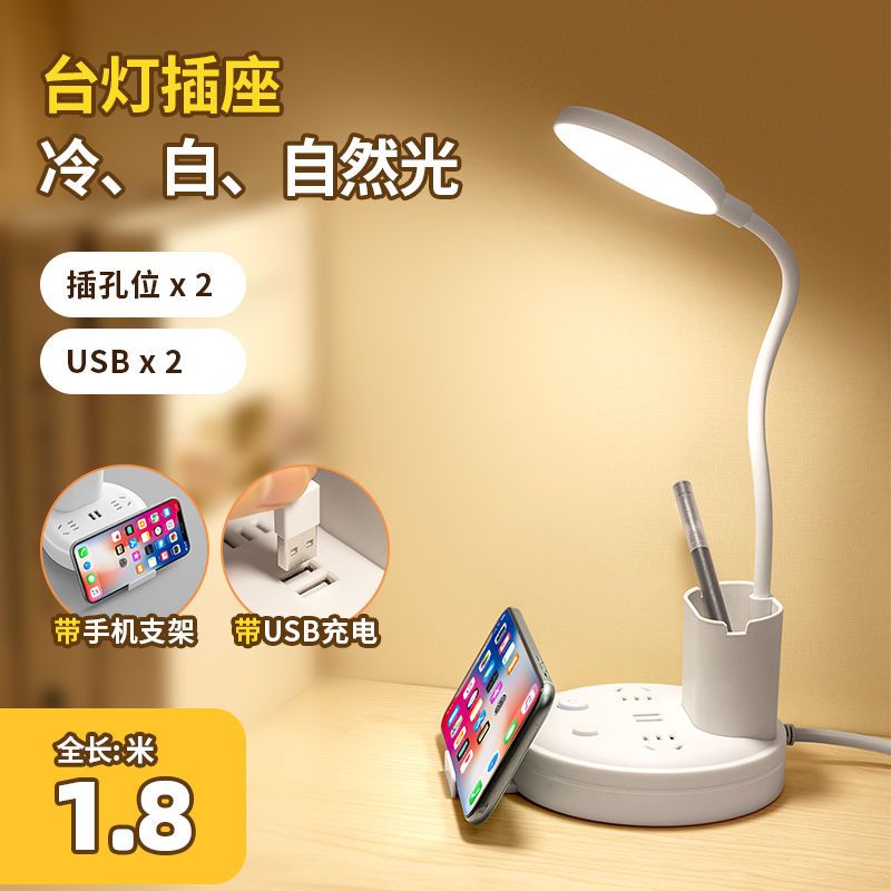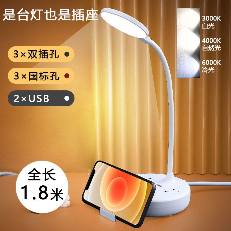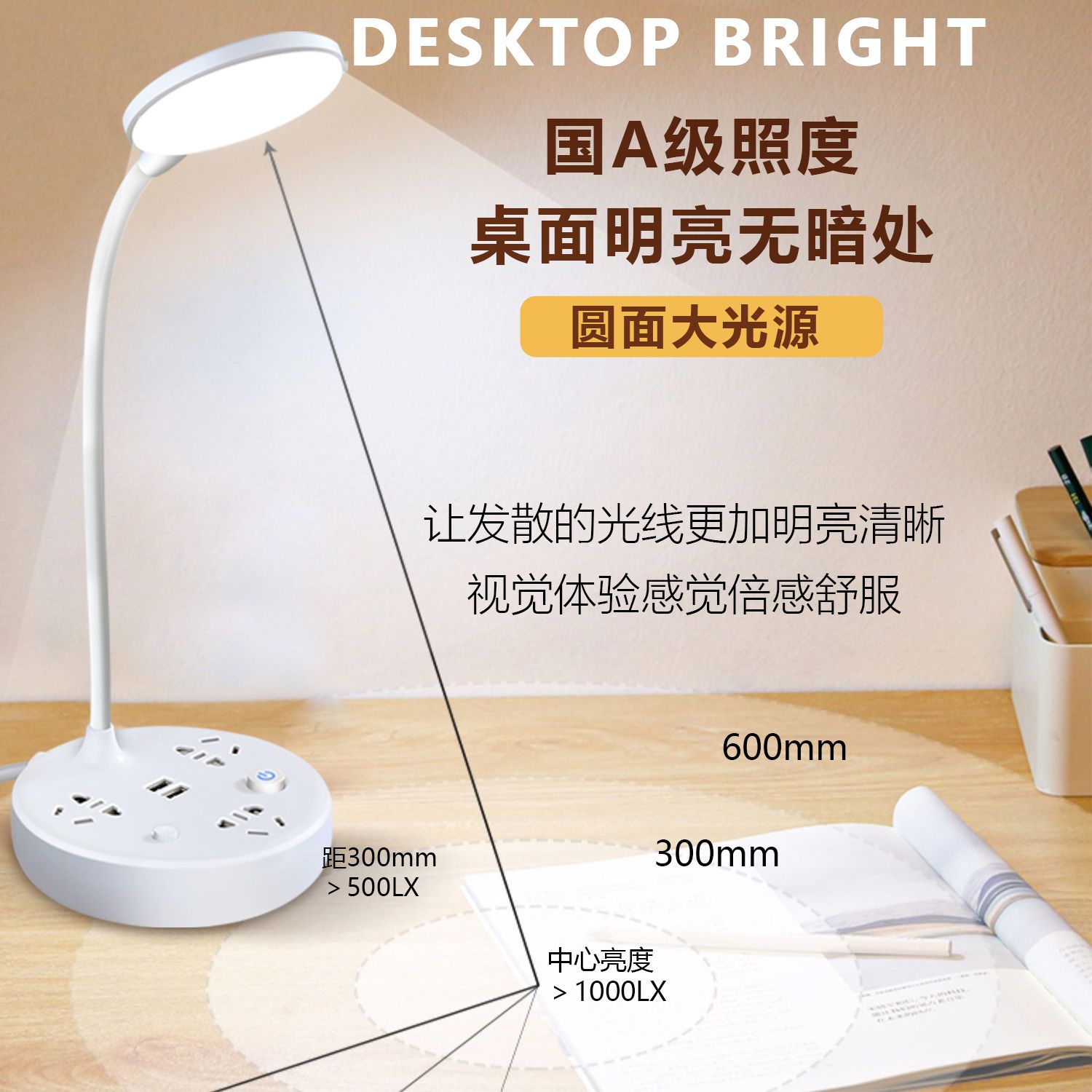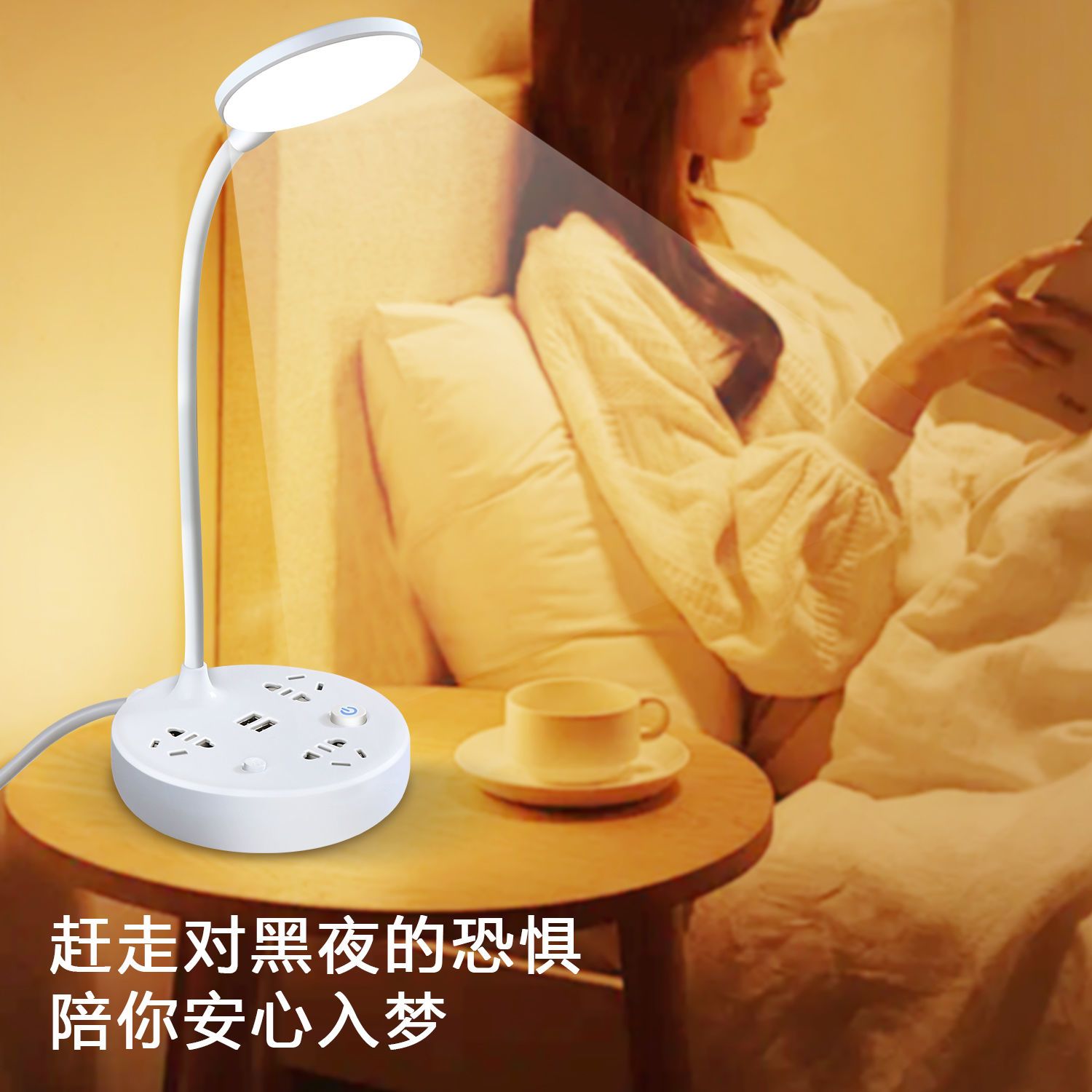 新款台灯三档调光LED台灯学习护眼USB插座长线家用多孔排插床头灯