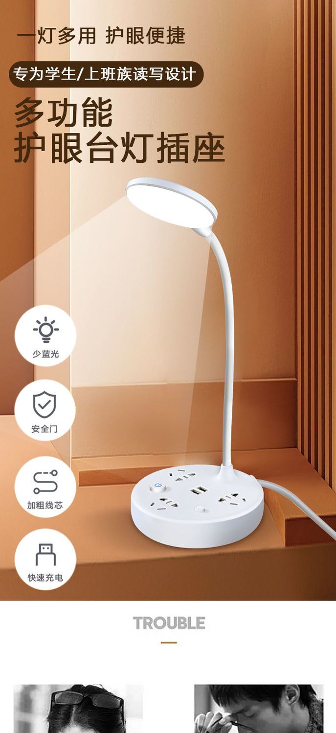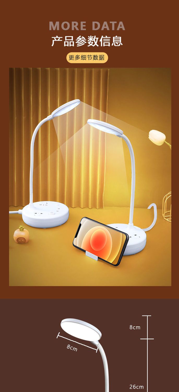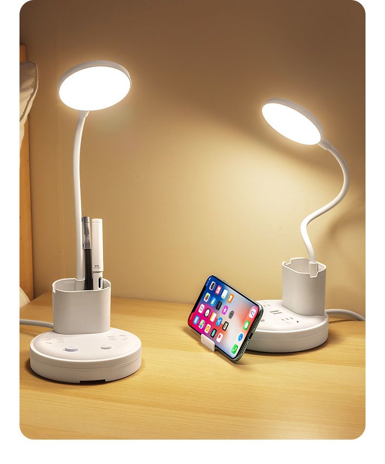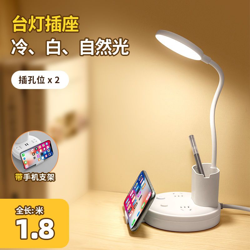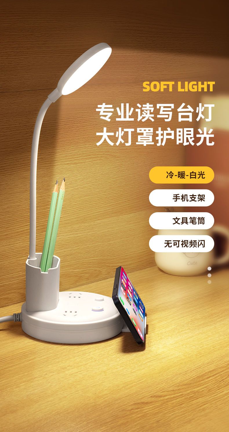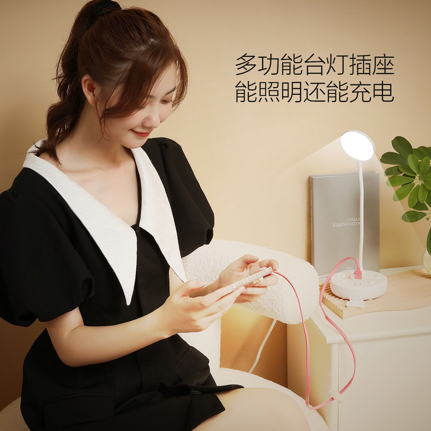 新款台灯三档调光LED台灯学习护眼USB插座长线家用多孔排插床头灯