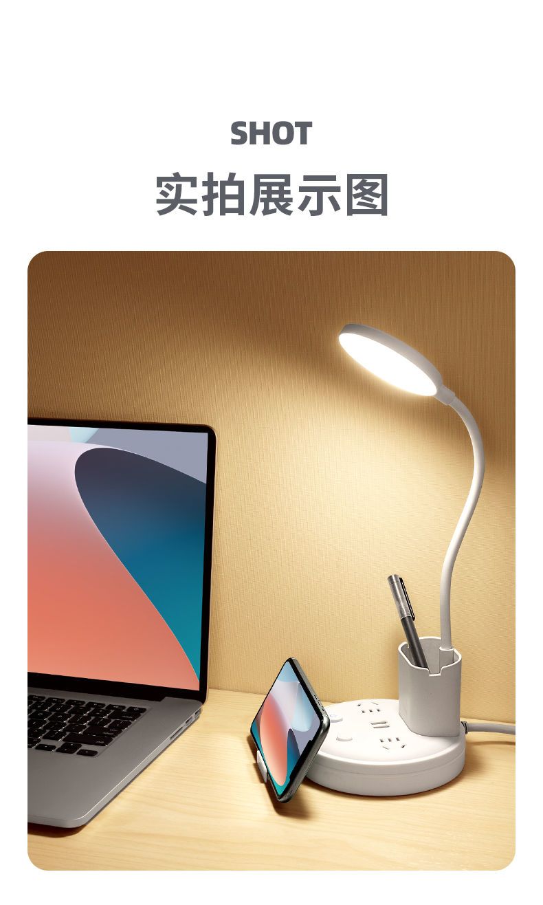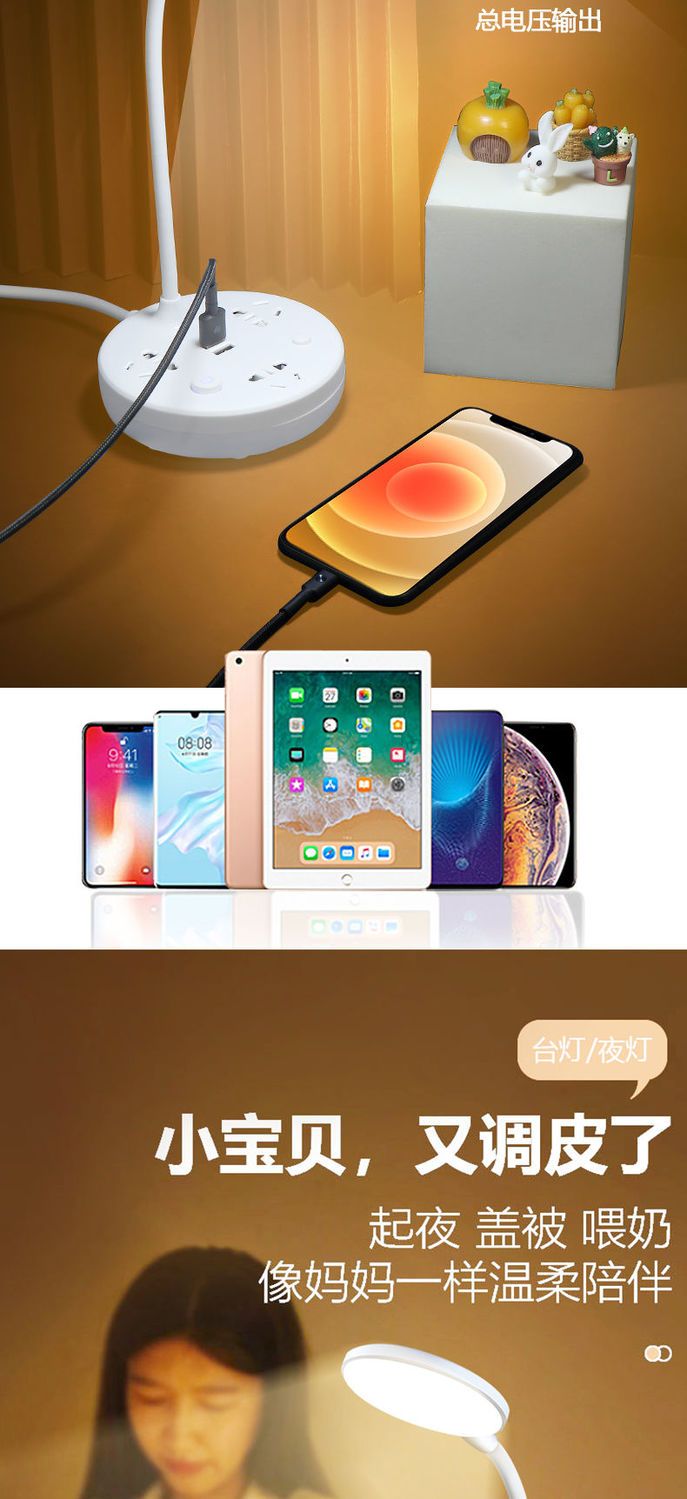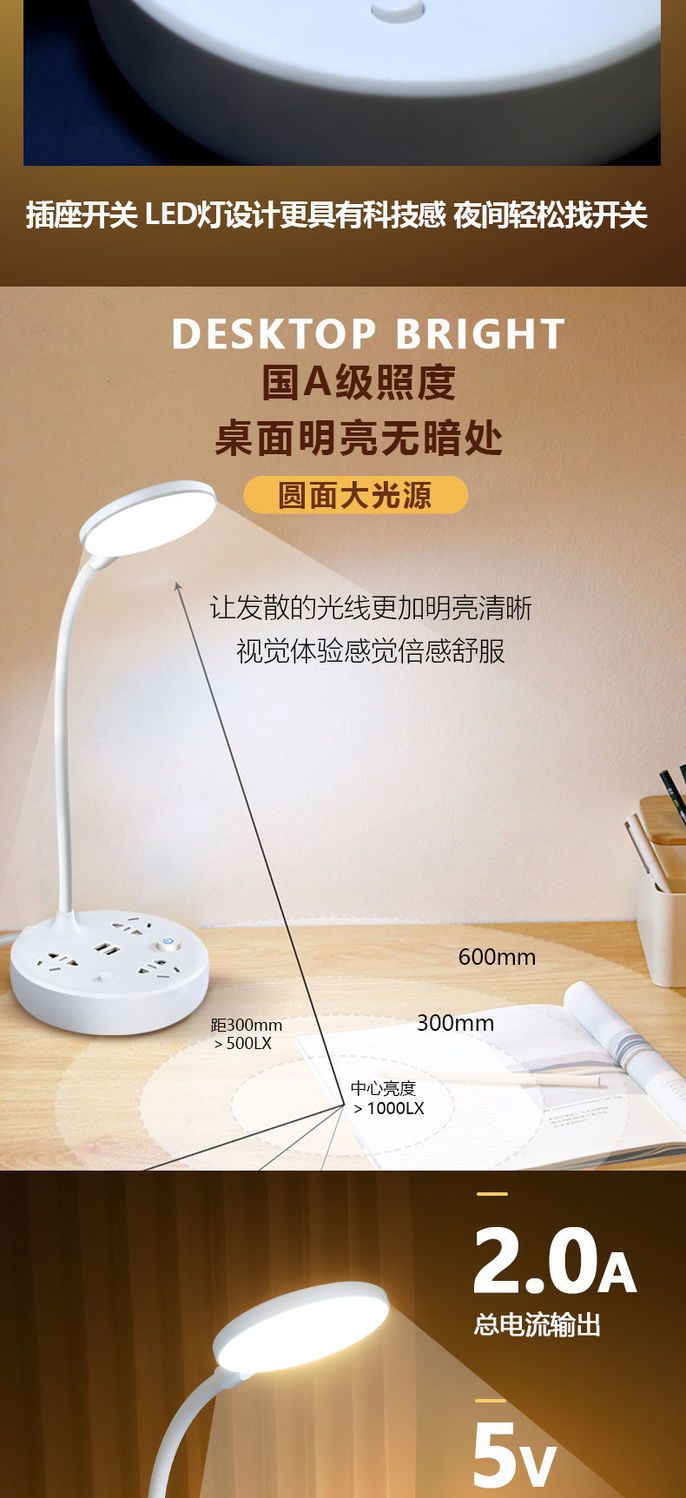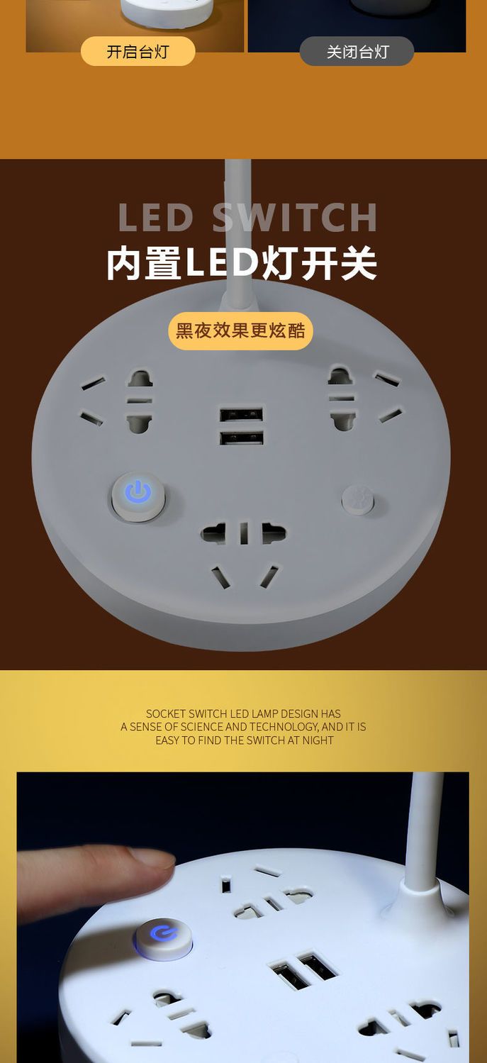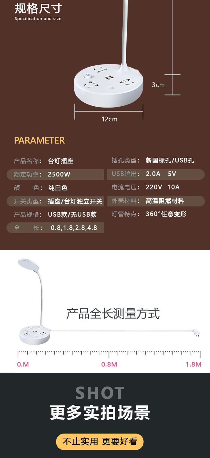 新款台灯三档调光LED台灯学习护眼USB插座长线家用多孔排插床头灯