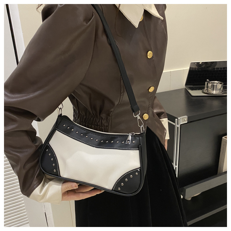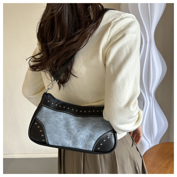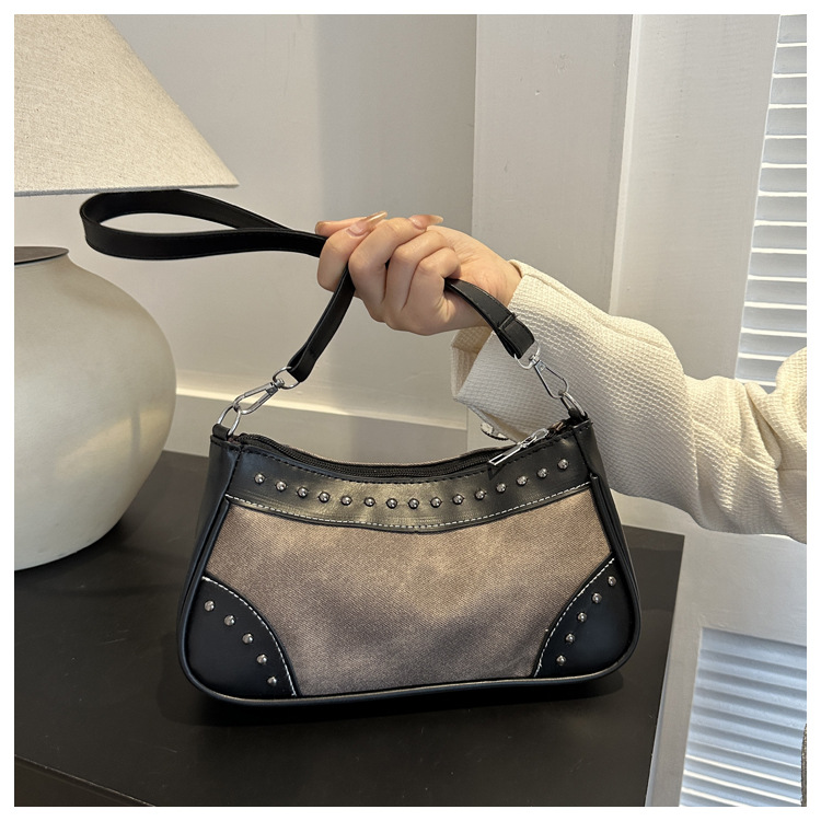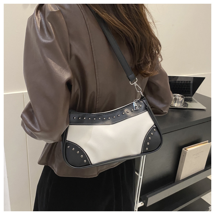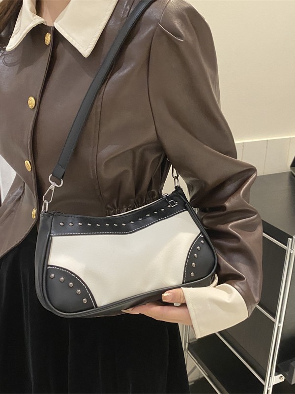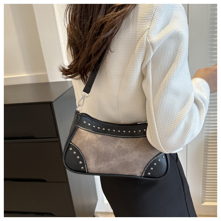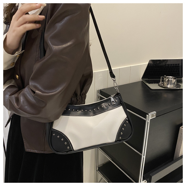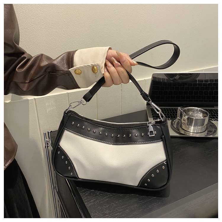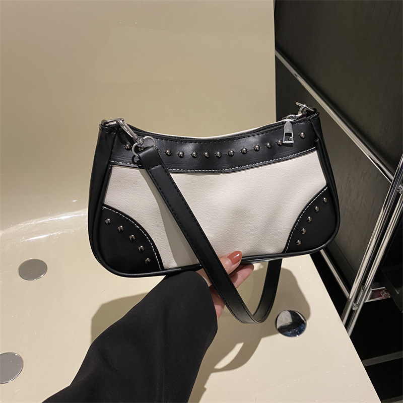2025新款复古拼接时尚腋下包包女甜酷辣妹风铆钉机车包手提包