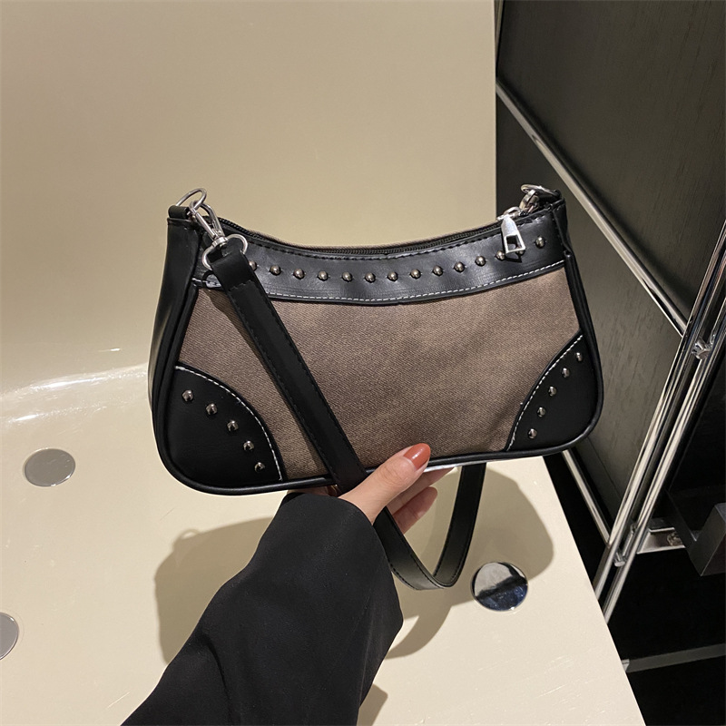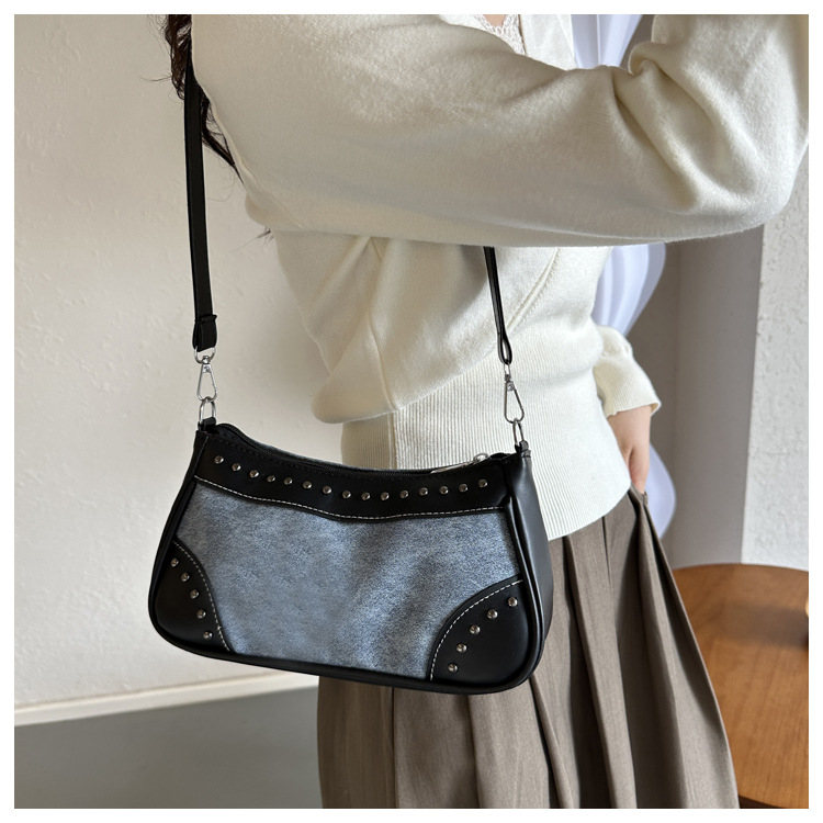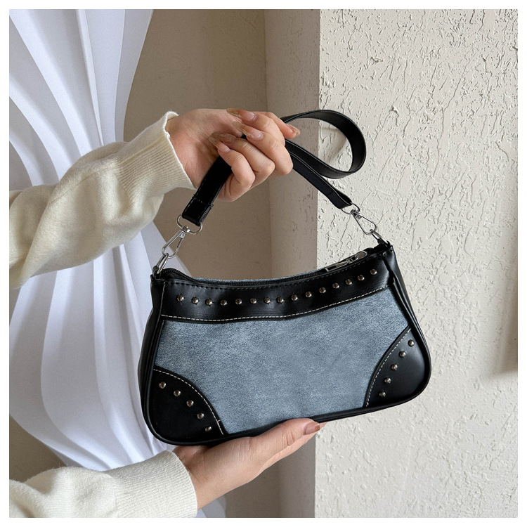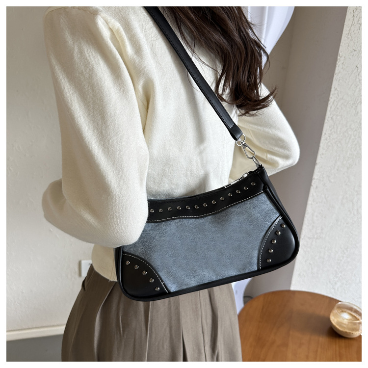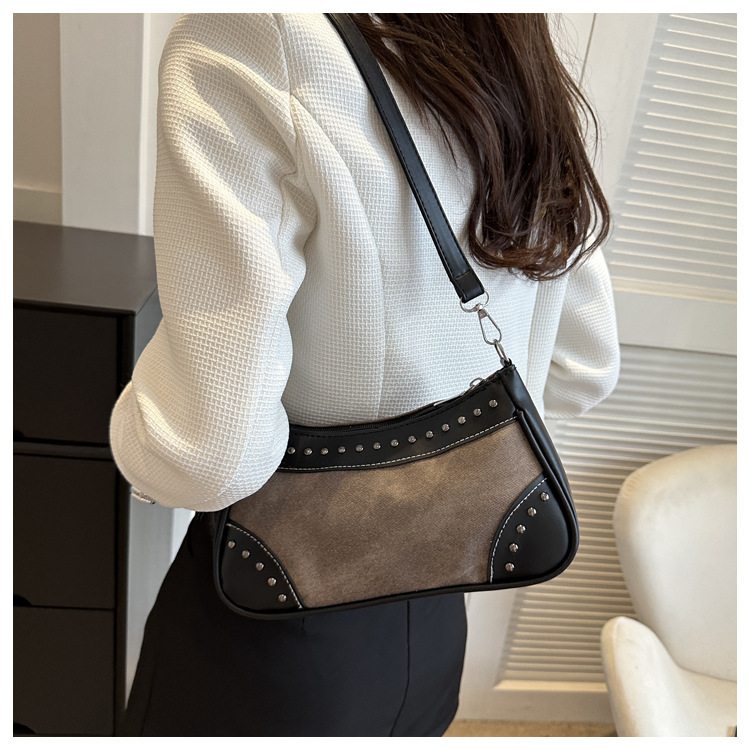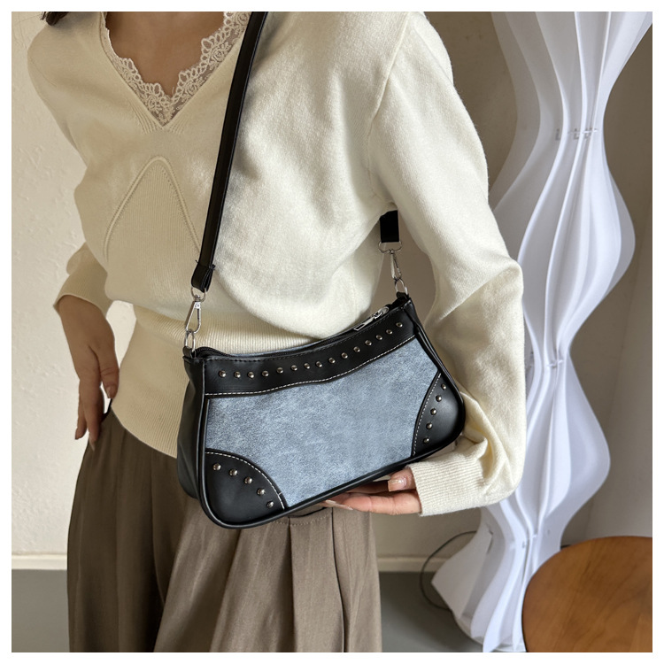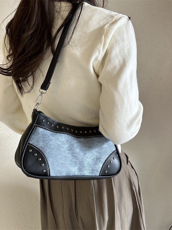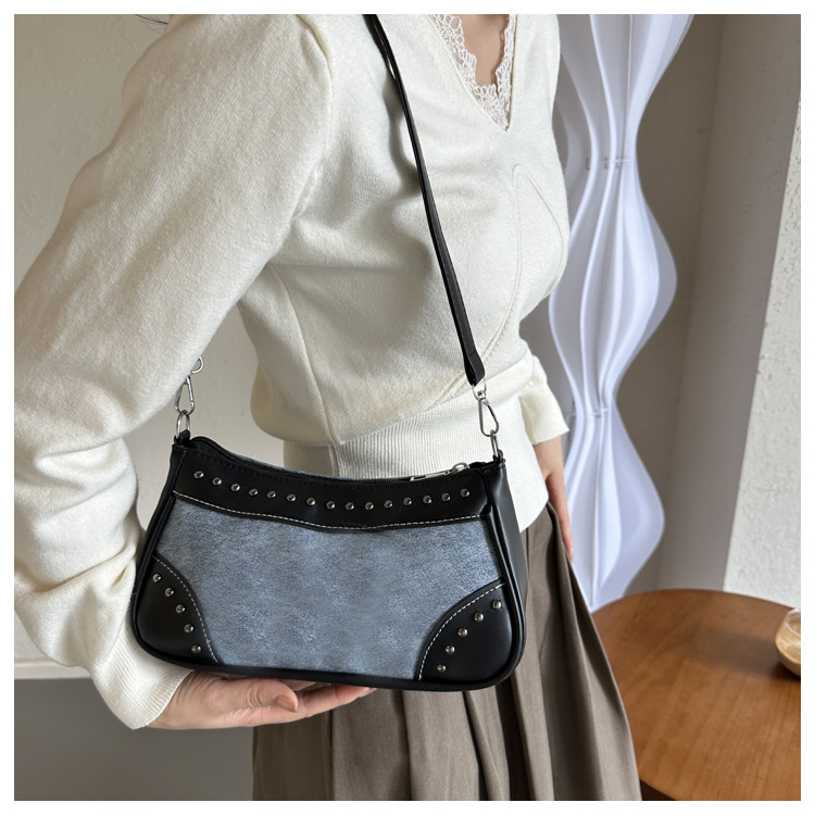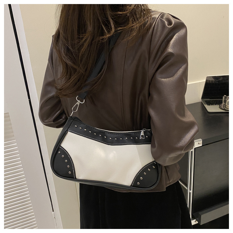 2025新款复古拼接时尚腋下包包女甜酷辣妹风铆钉机车包手提包