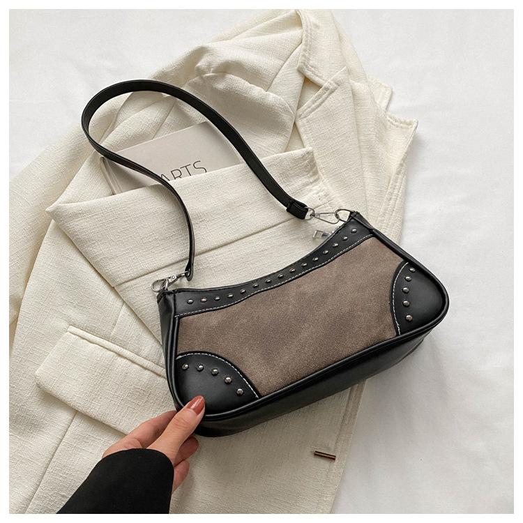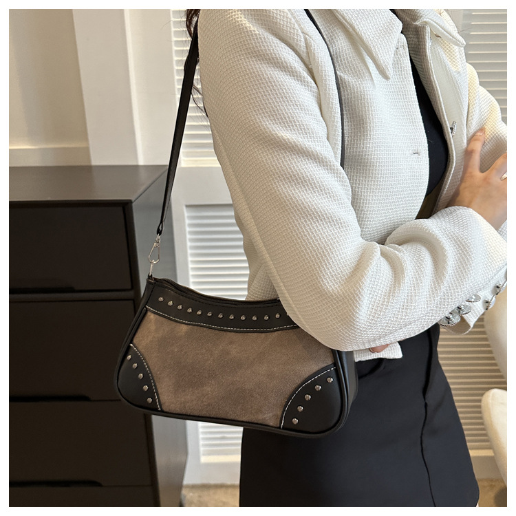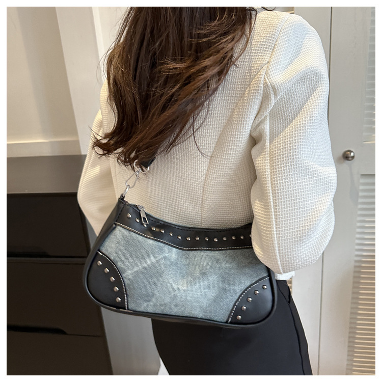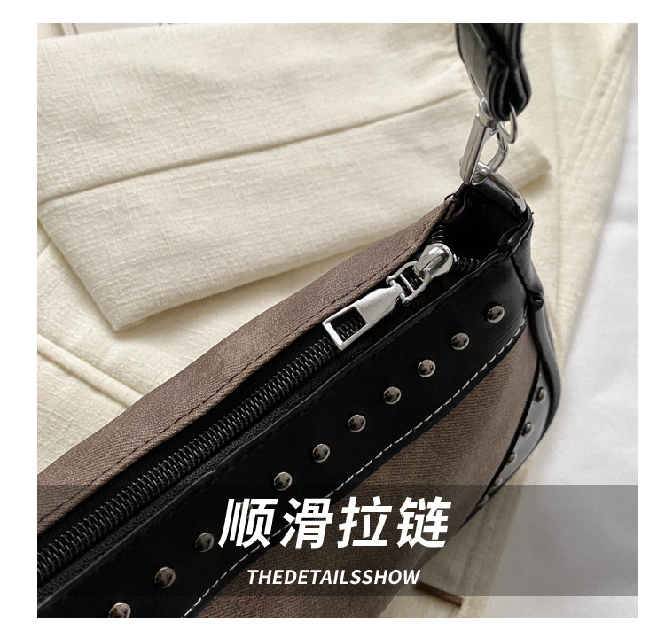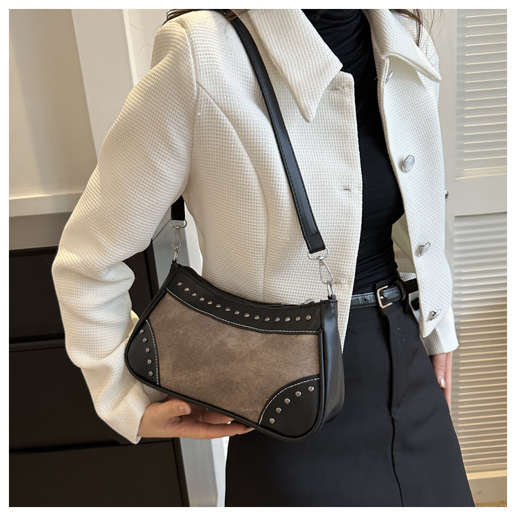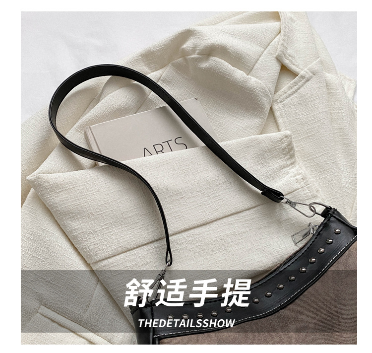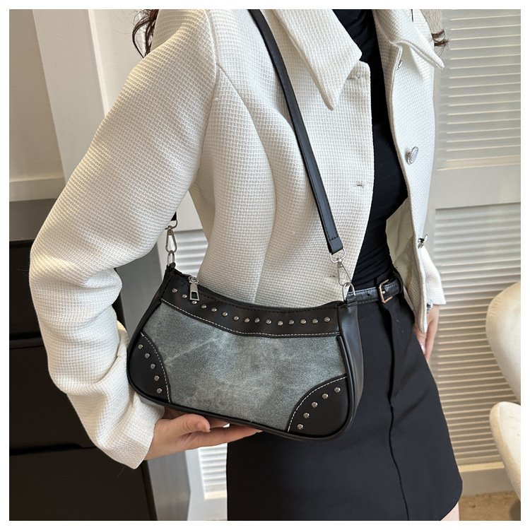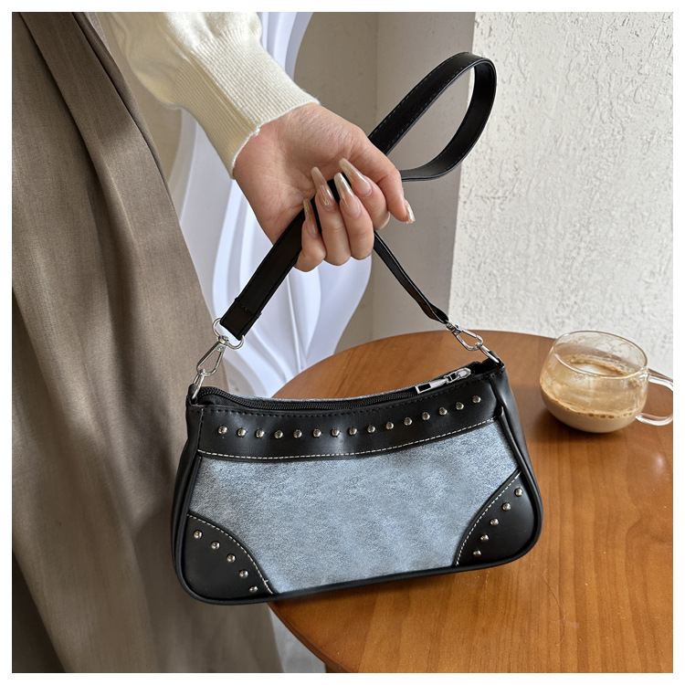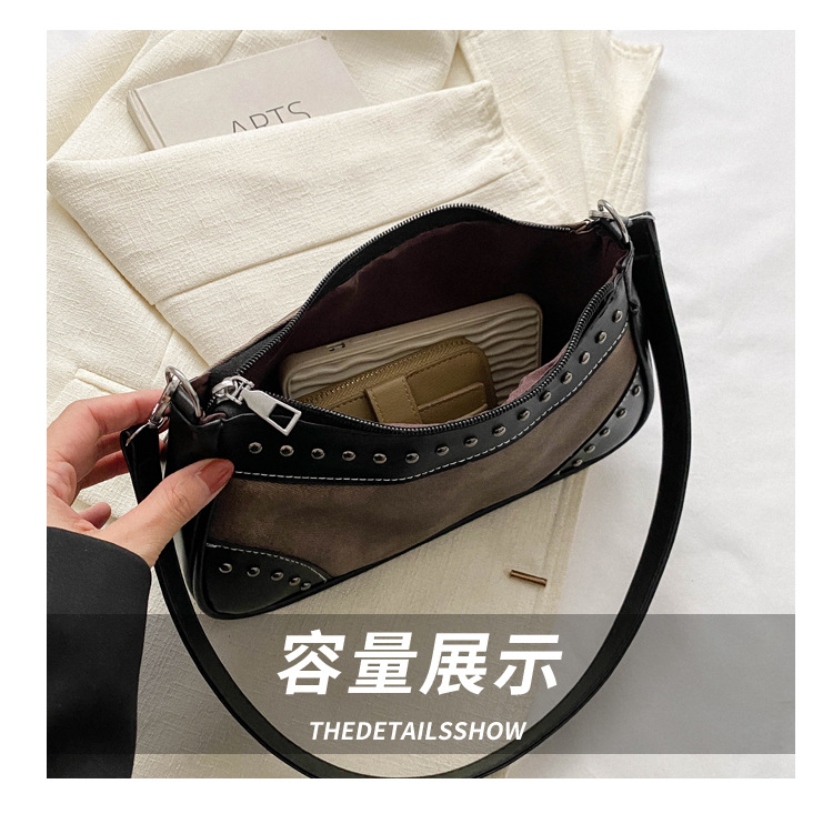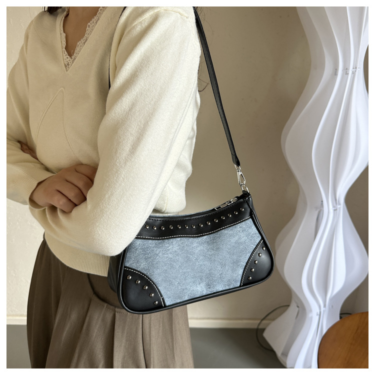 2025新款复古拼接时尚腋下包包女甜酷辣妹风铆钉机车包手提包
