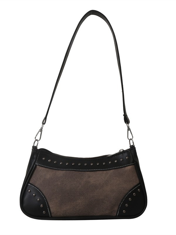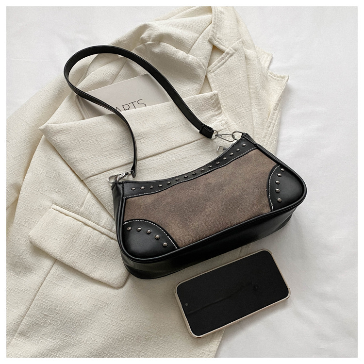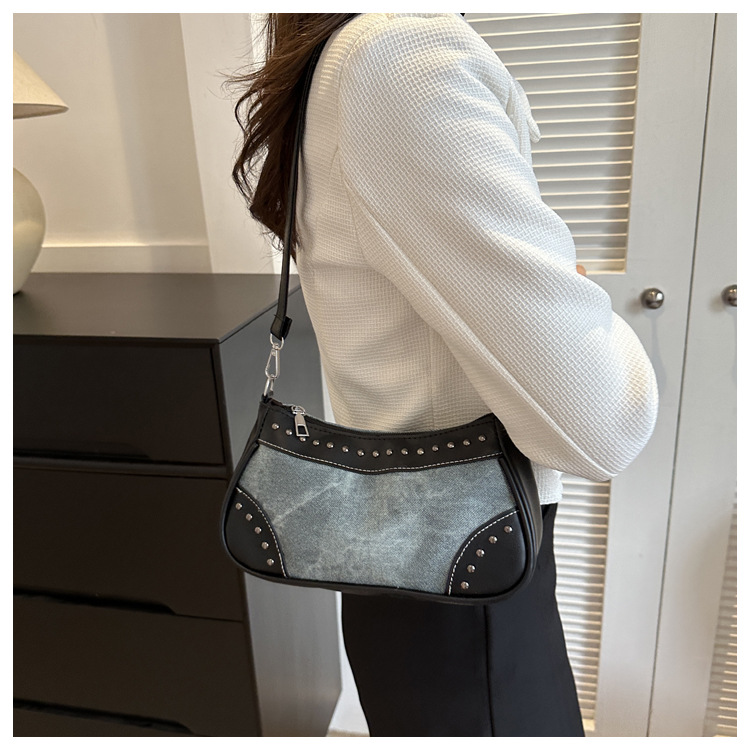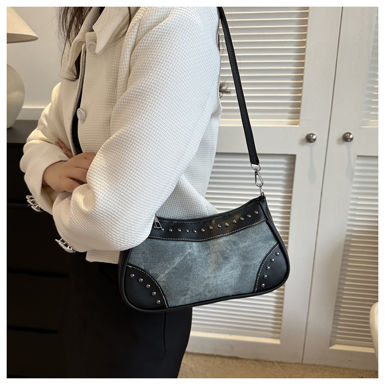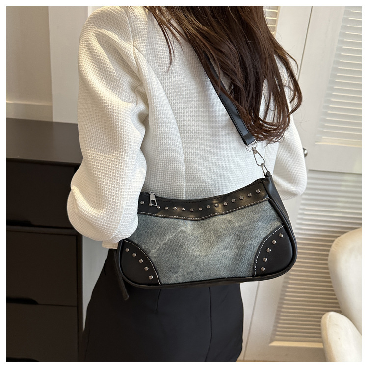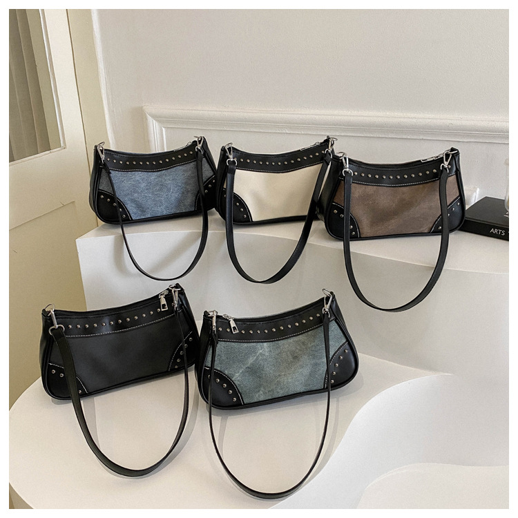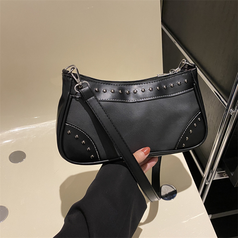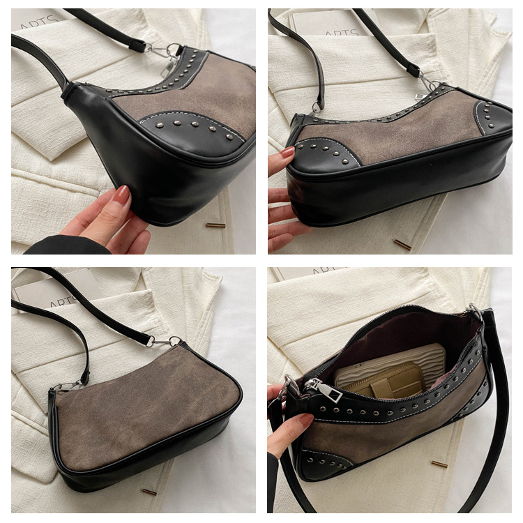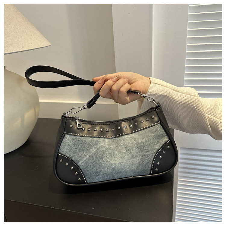 2025新款复古拼接时尚腋下包包女甜酷辣妹风铆钉机车包手提包