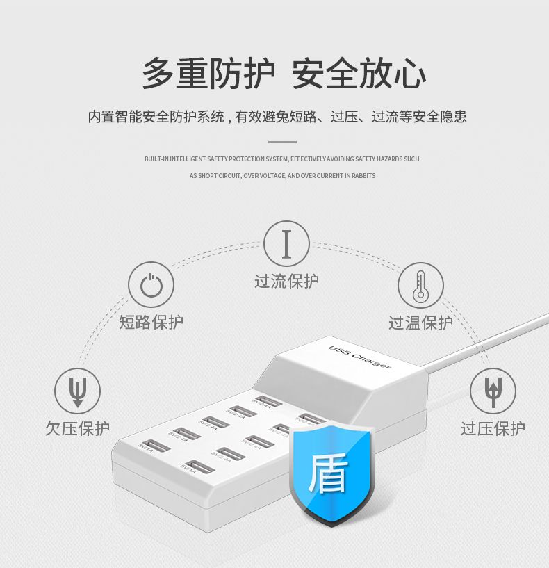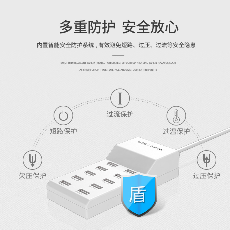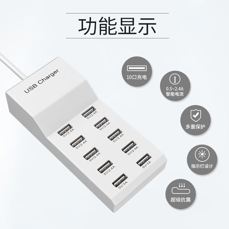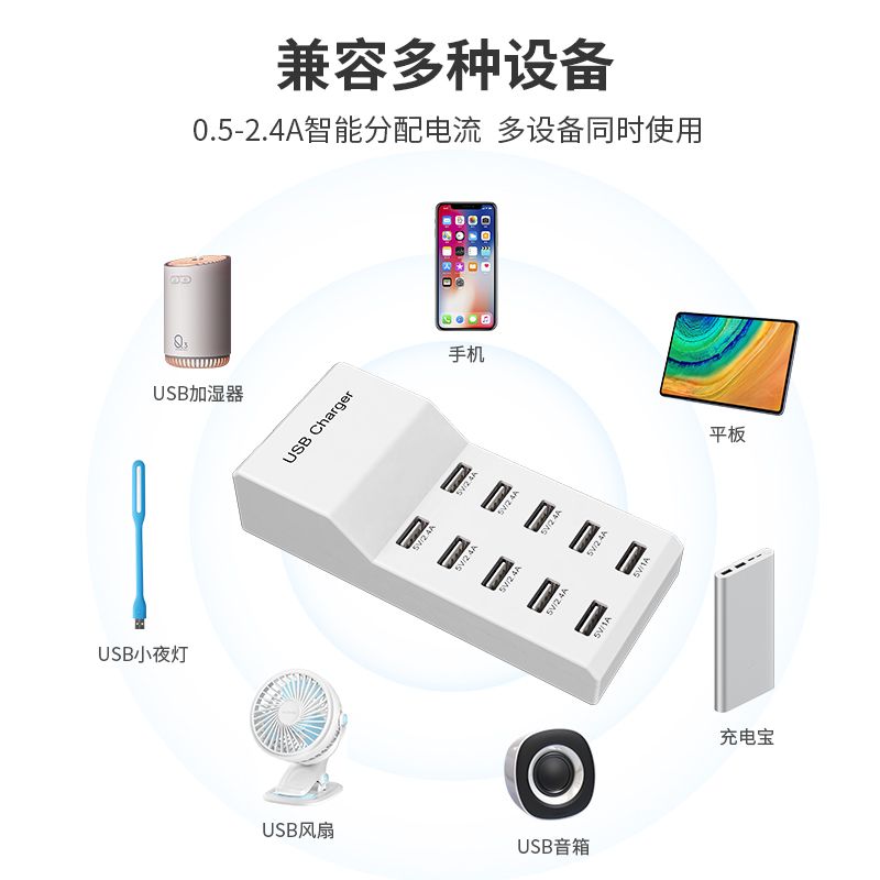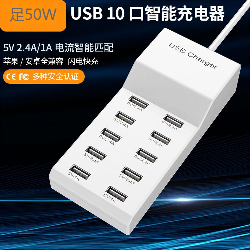 10口50W智能通用USB快速充电器兼容苹果安卓手机华为OPPO荣耀VIVO