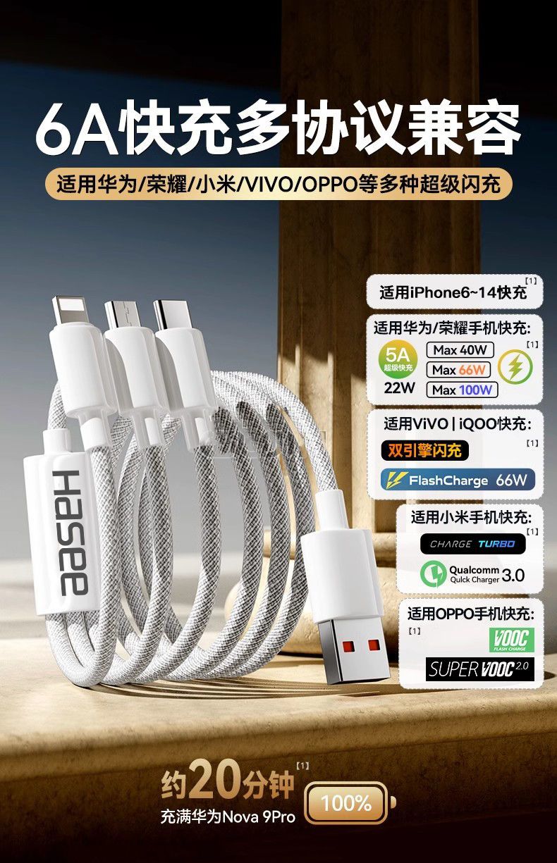 神舟三合一套装充电器闪充线适用华为荣耀苹果小米vivo通用USB