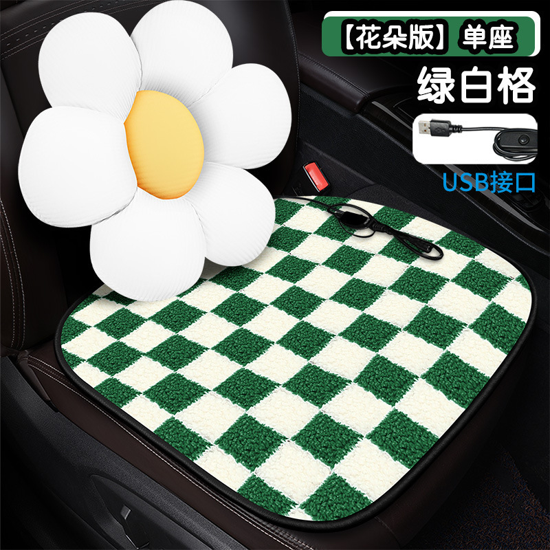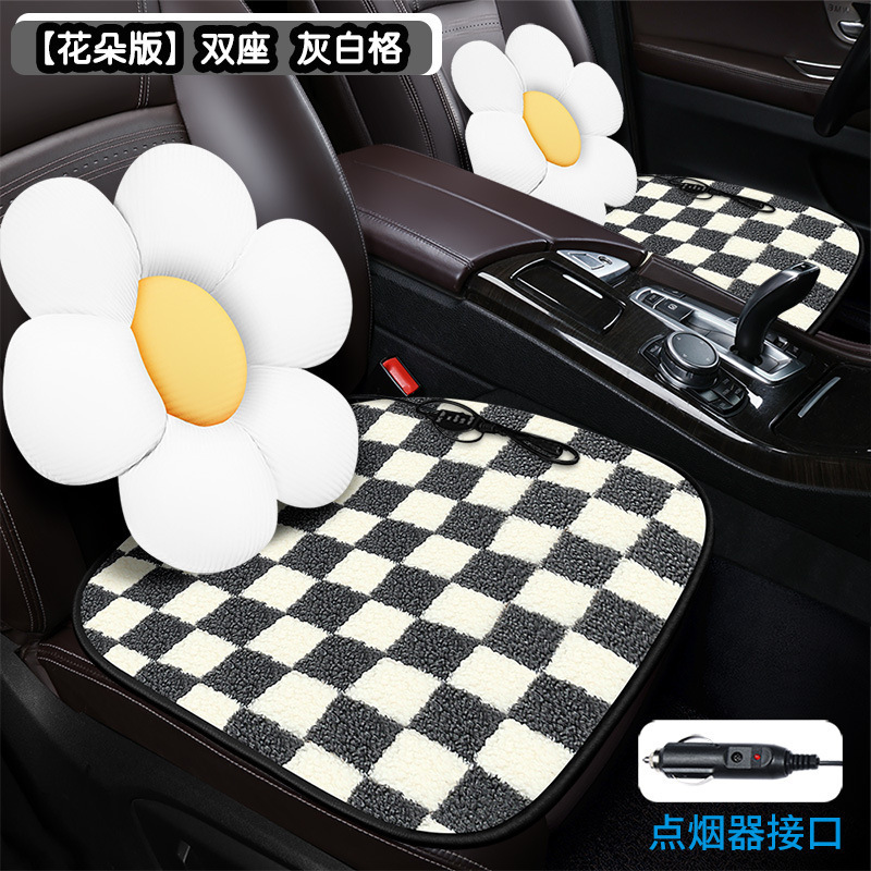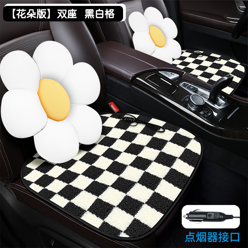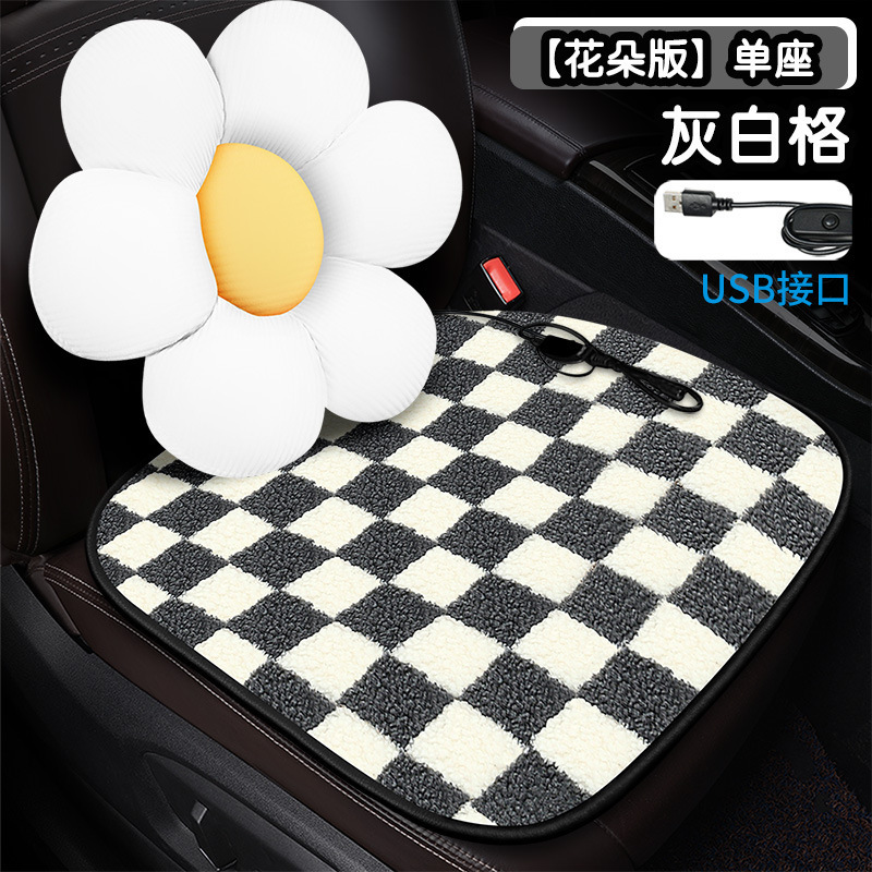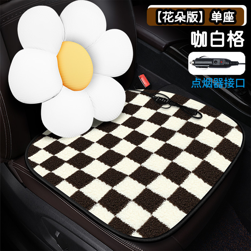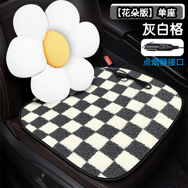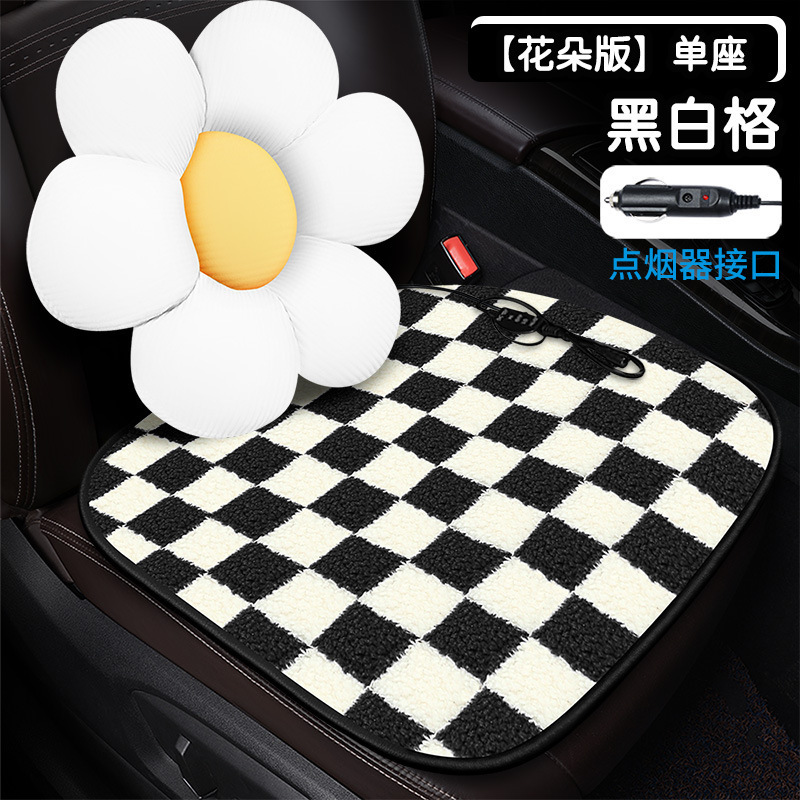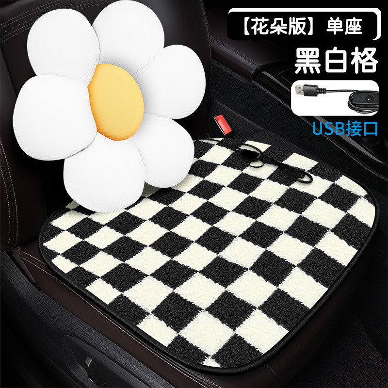 批发棋盘格加热垫汽车坐垫跨境卡通花朵羊羔绒内饰用品冬季单座垫