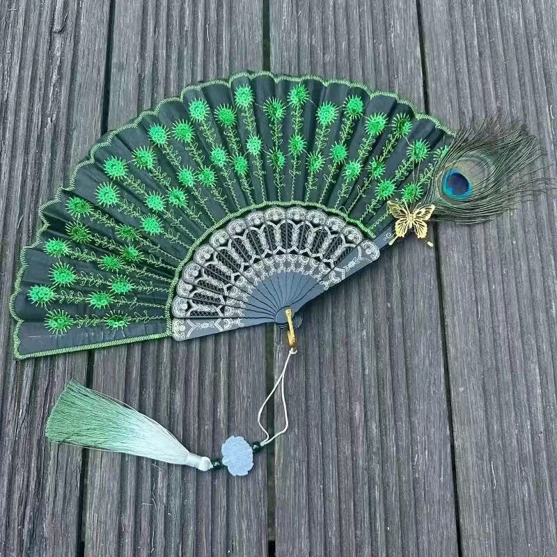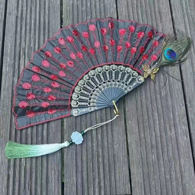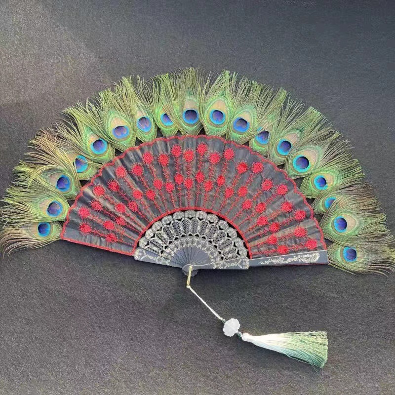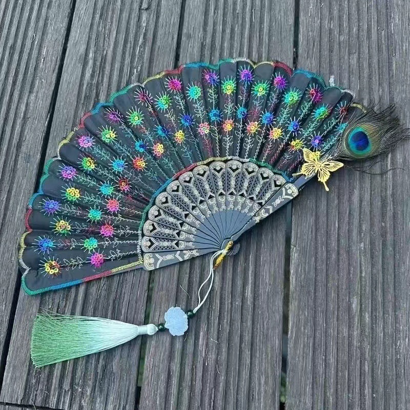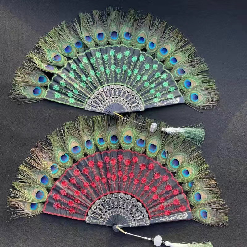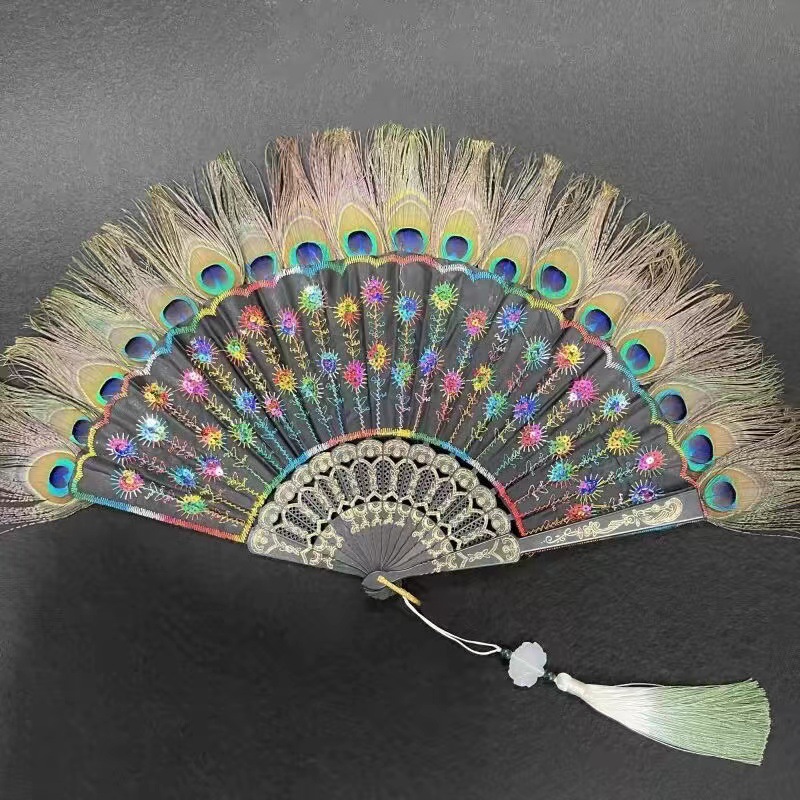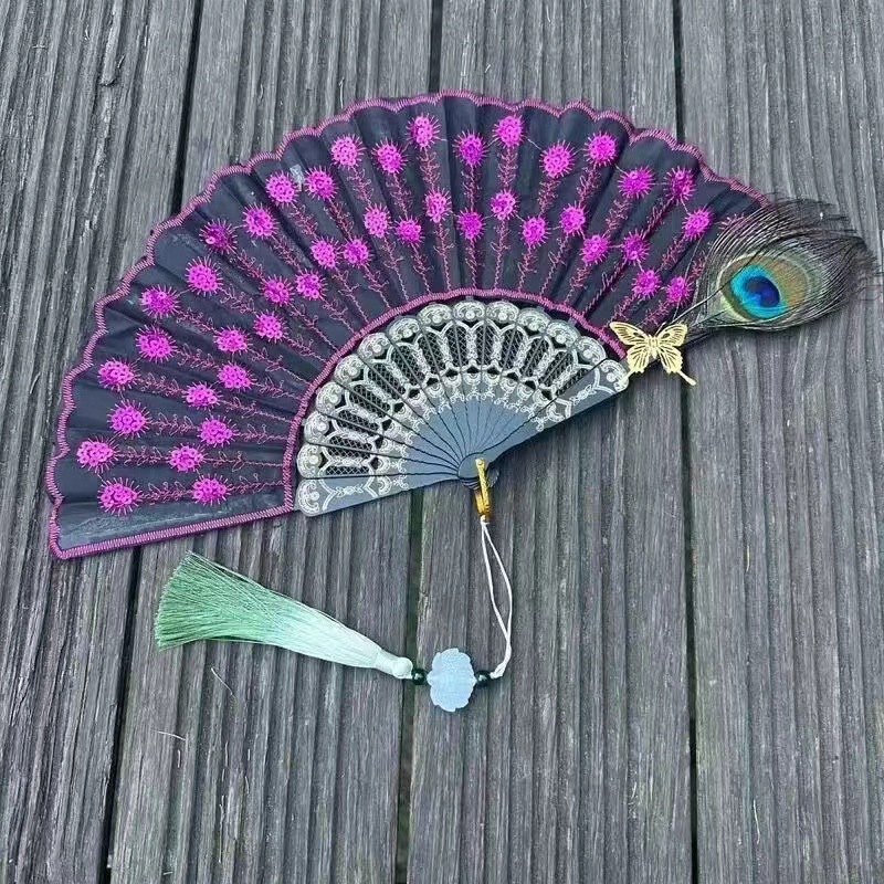 孔雀羽毛折扇刺绣扇黑杆亮片扇子咏春礼品扇诸葛亮羽毛扇中国风