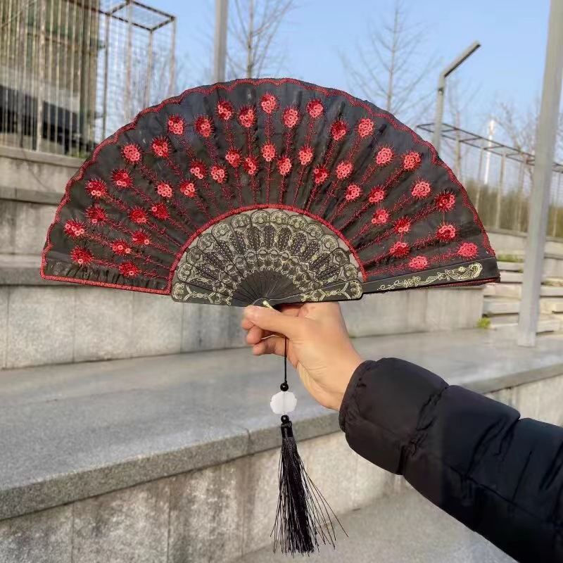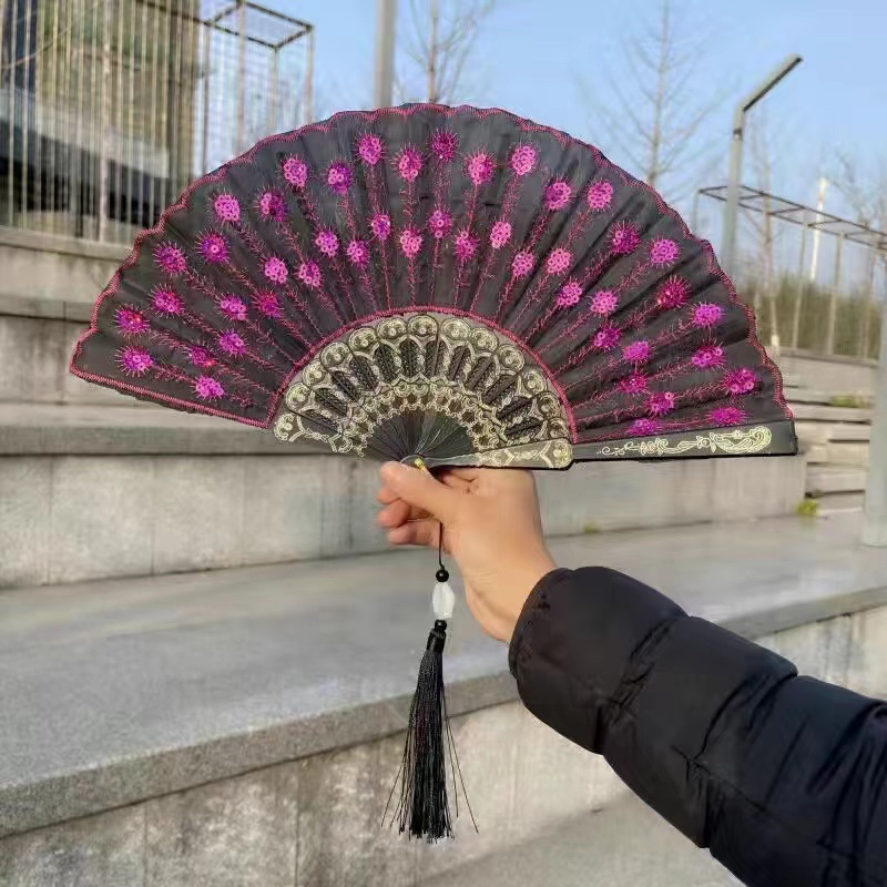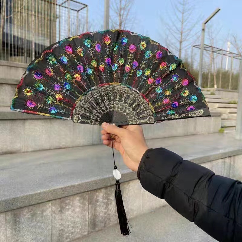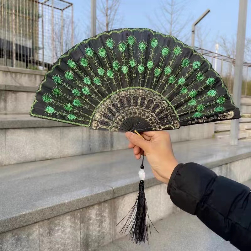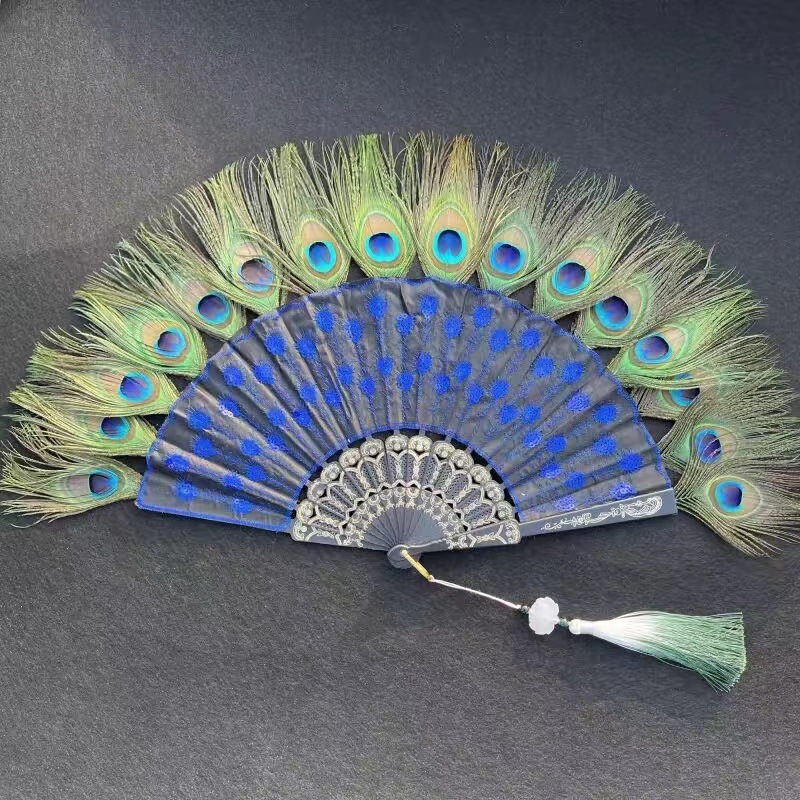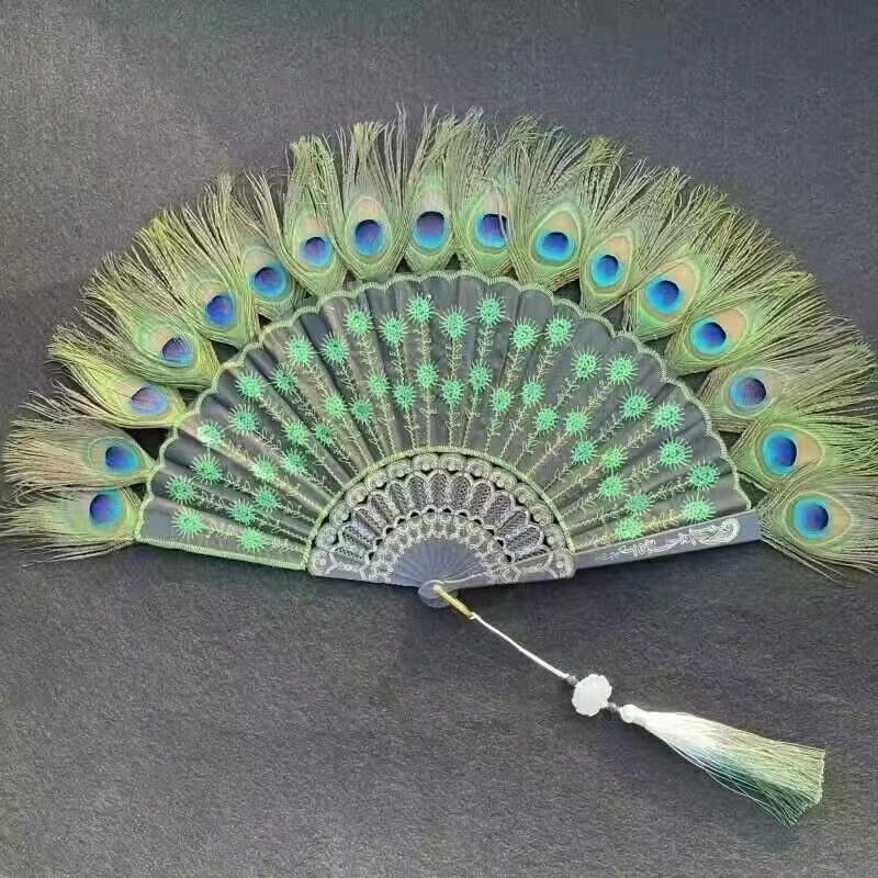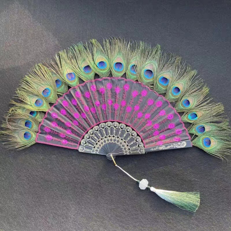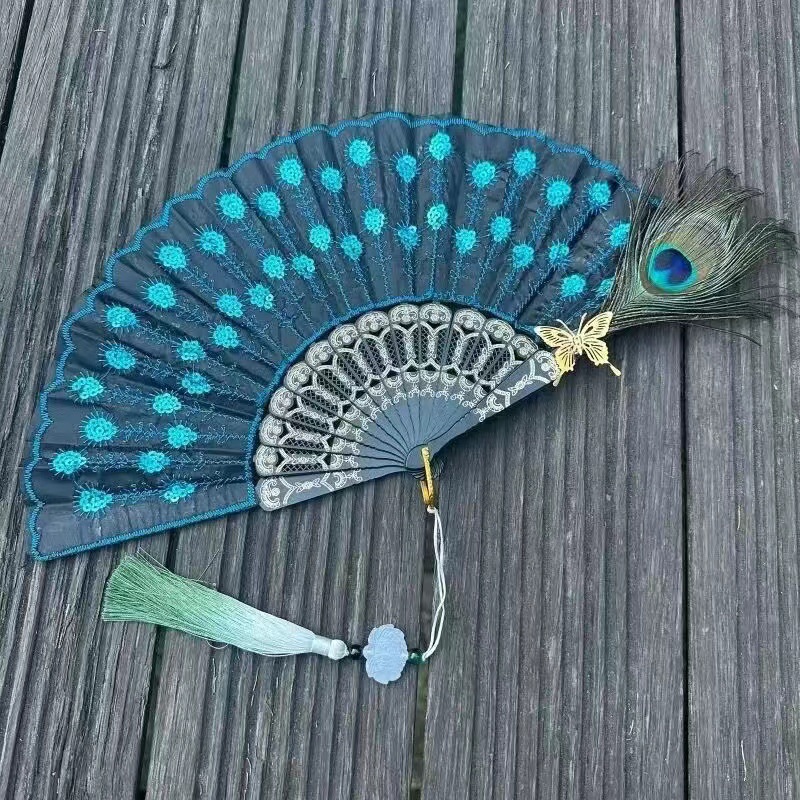 孔雀羽毛折扇刺绣扇黑杆亮片扇子咏春礼品扇诸葛亮羽毛扇中国风