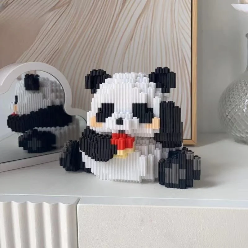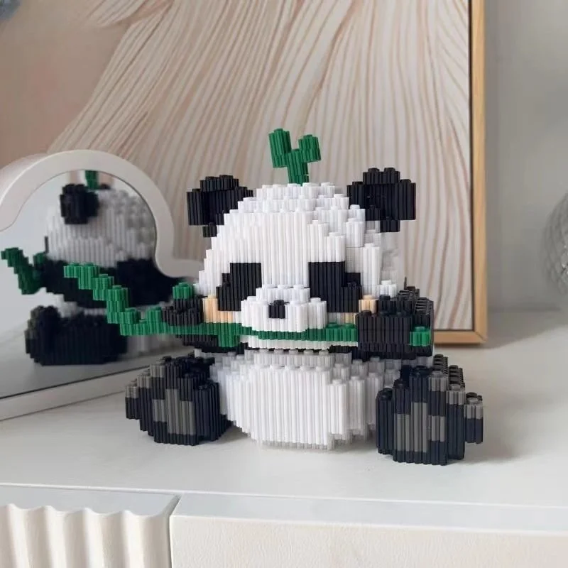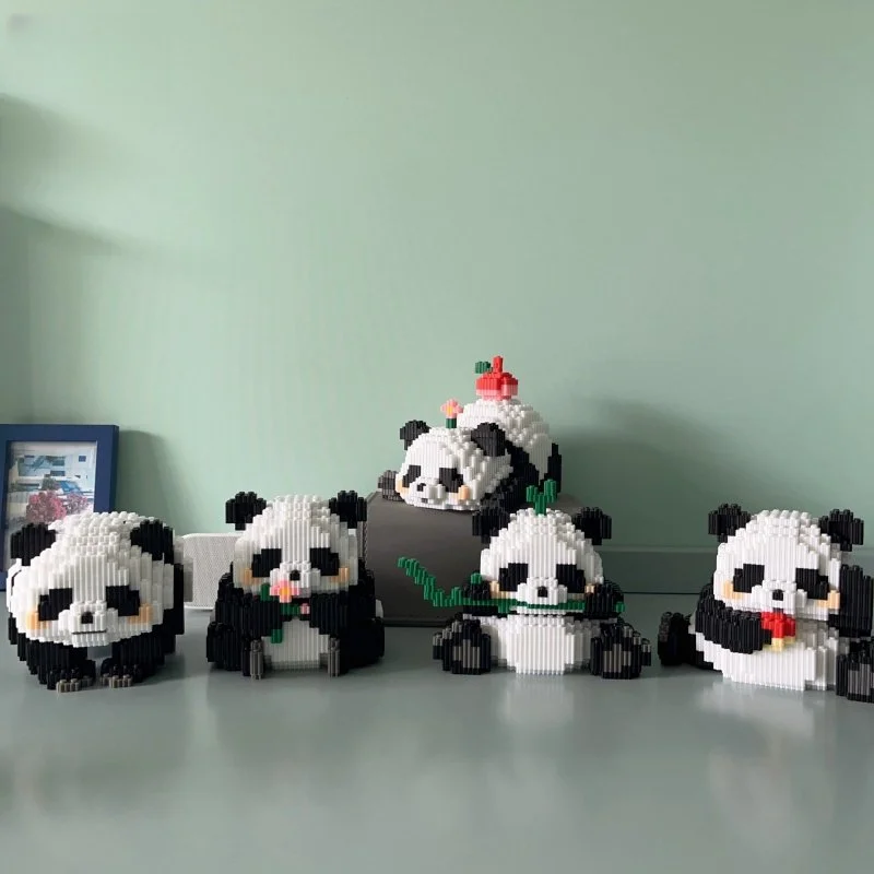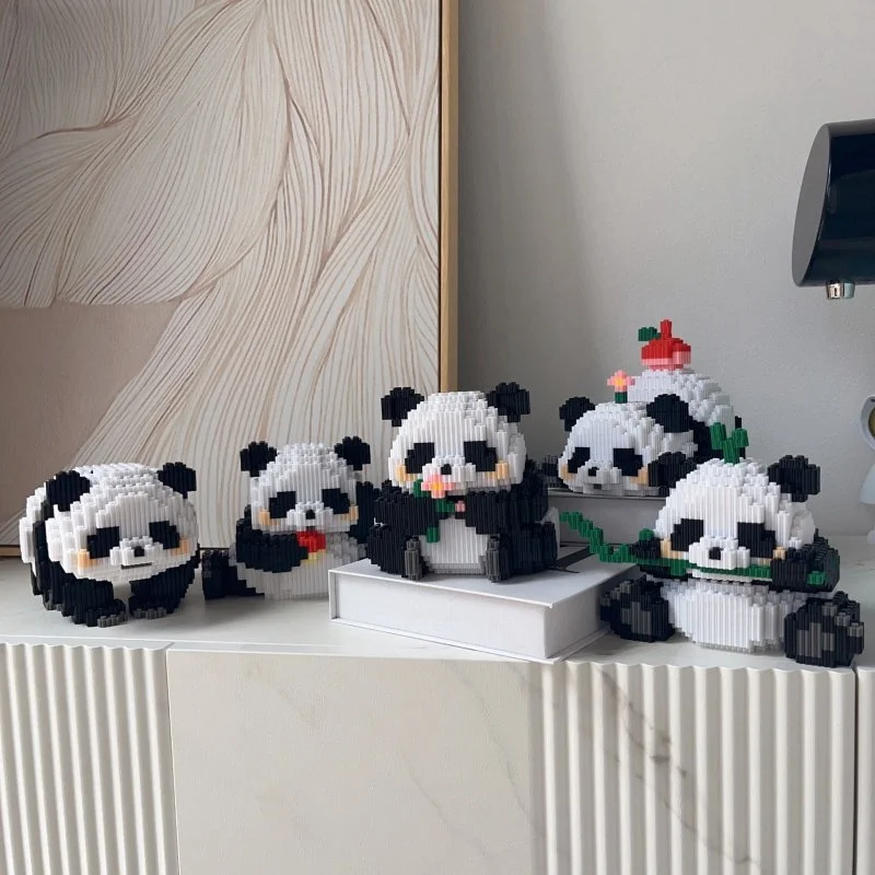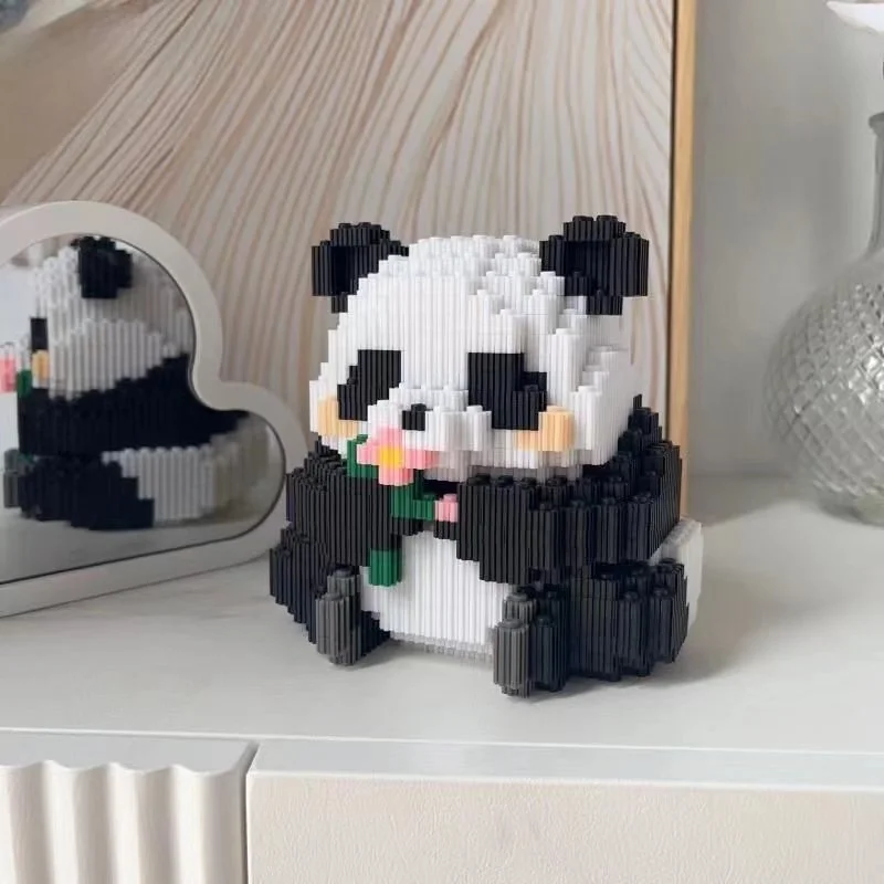 国宝熊猫花花玩具手工拼装儿童益智高难度兼容乐高积木拼图3d立体