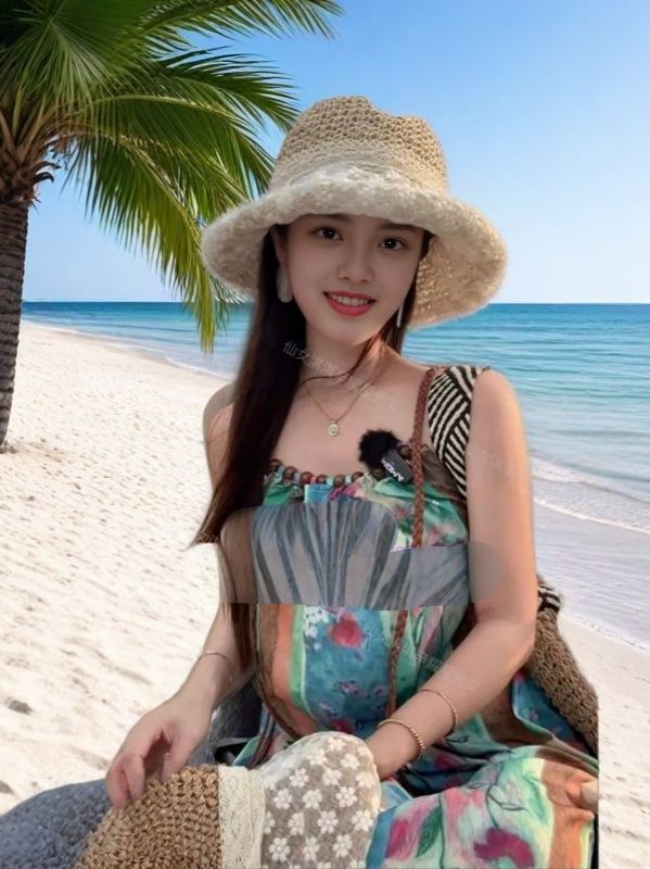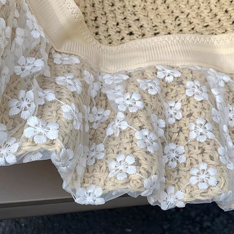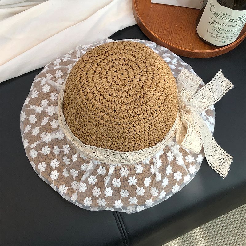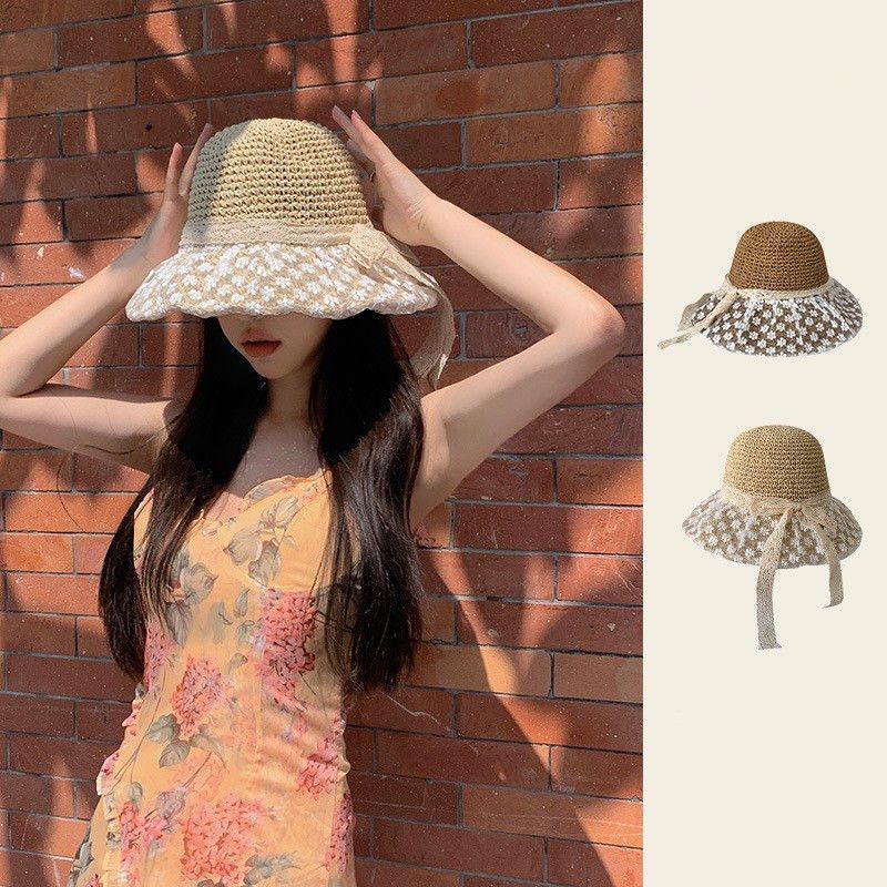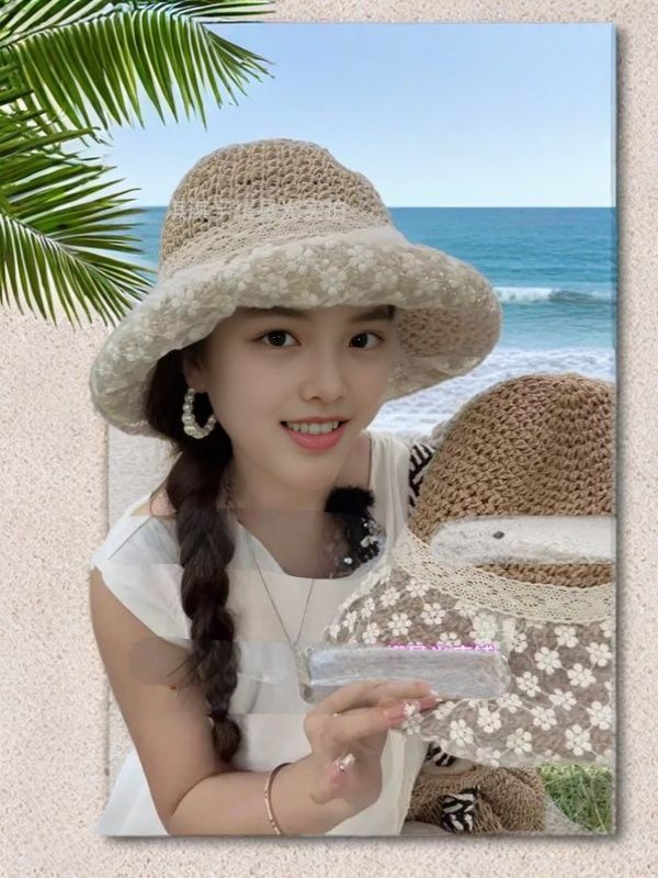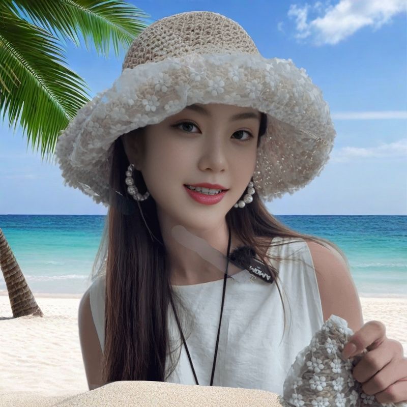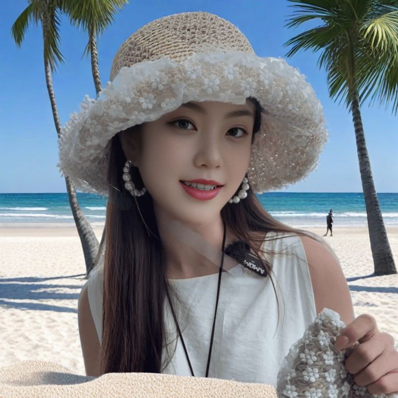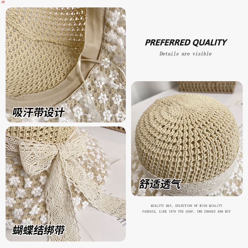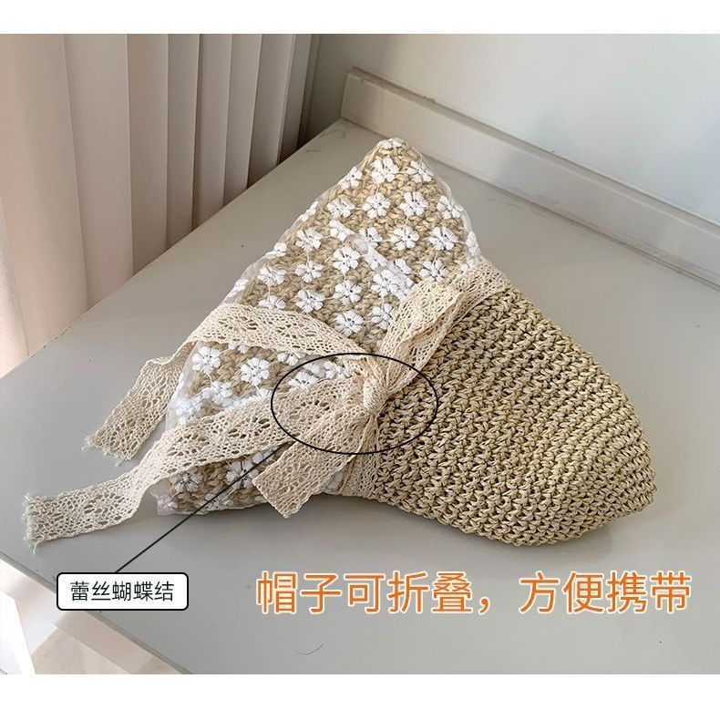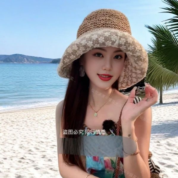 蕾丝遮阳系带草帽夏季超仙珍珠防晒法式碎花海边沙滩遮阳帽森女