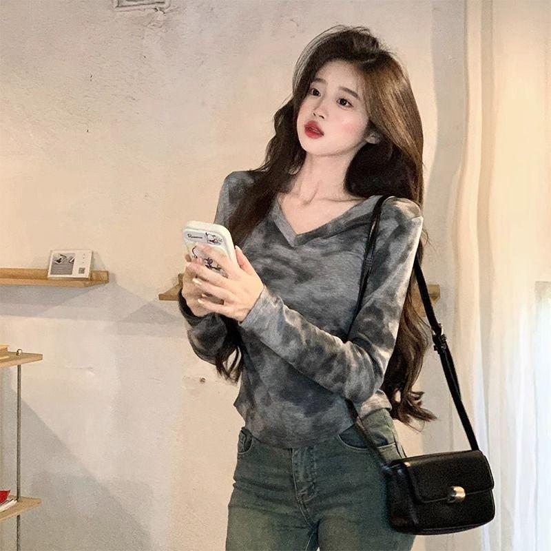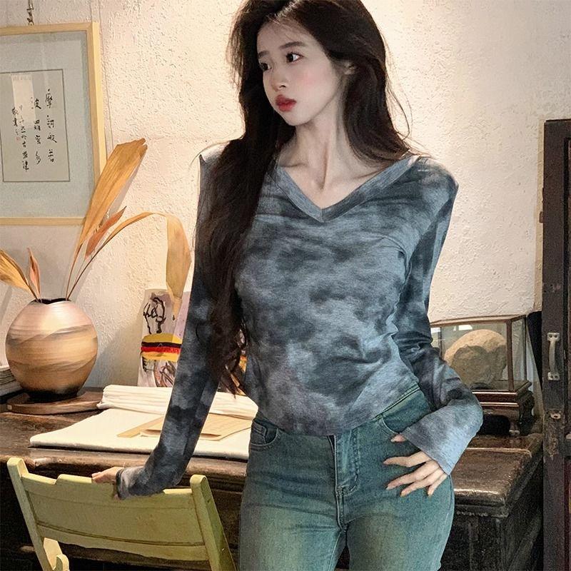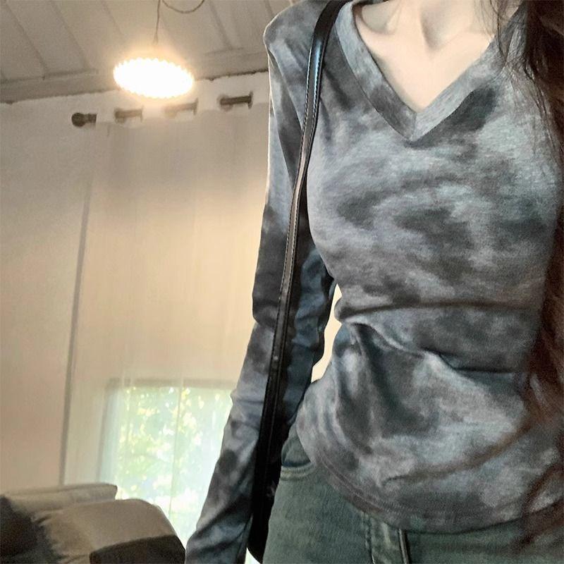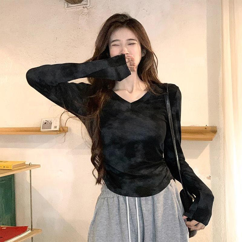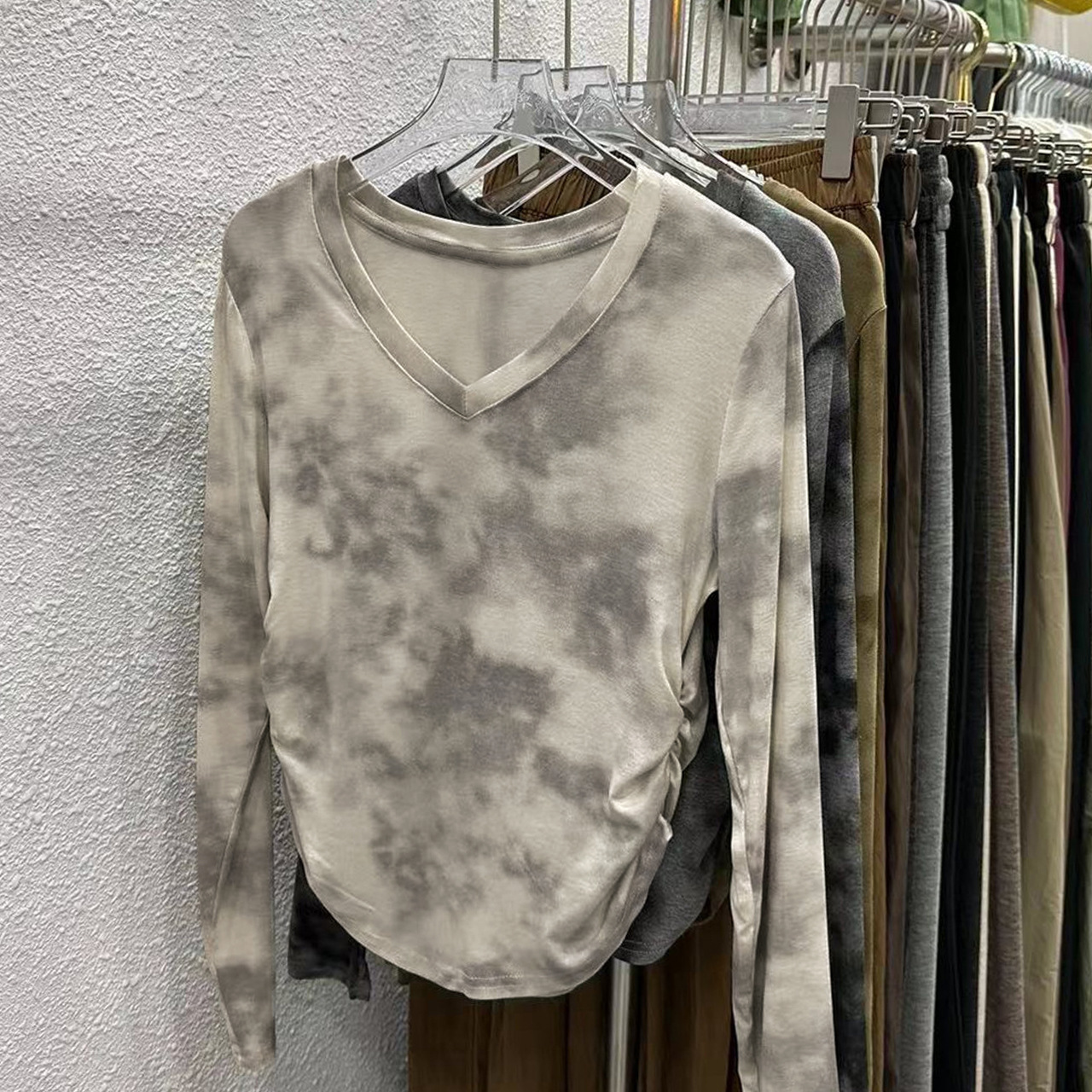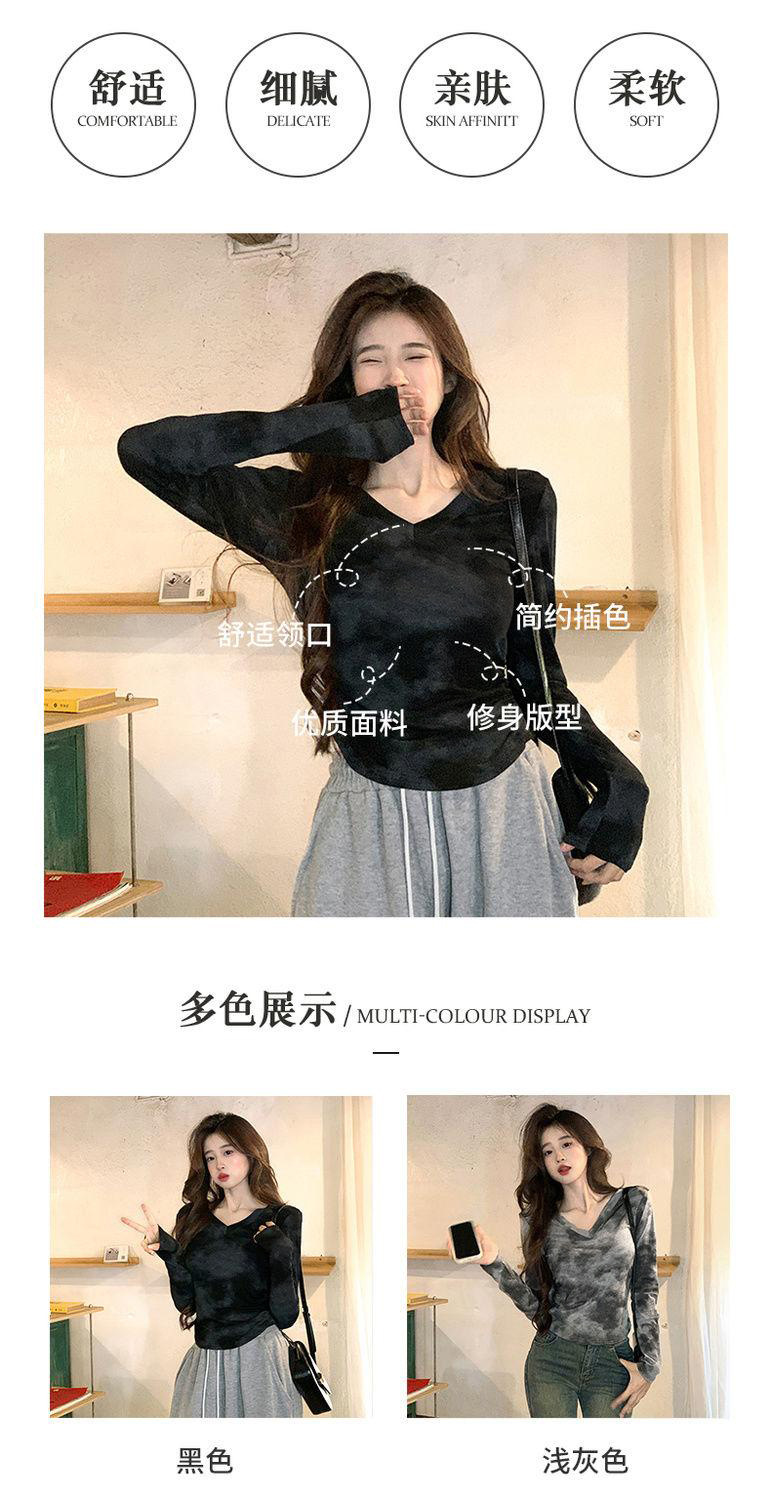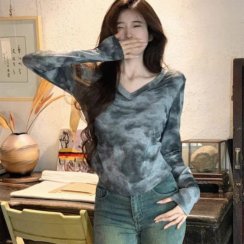 美式复古扎染V领短款上衣女早秋辣妹收腰修身内搭打底衫长袖T恤女