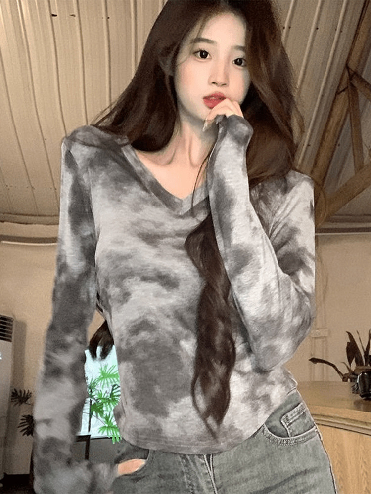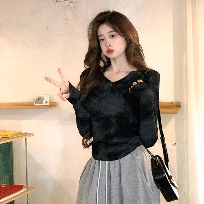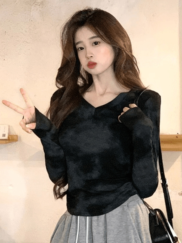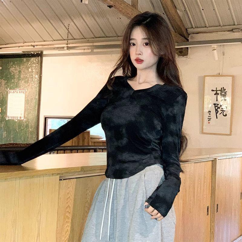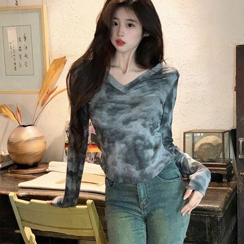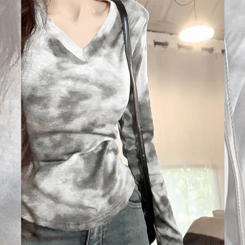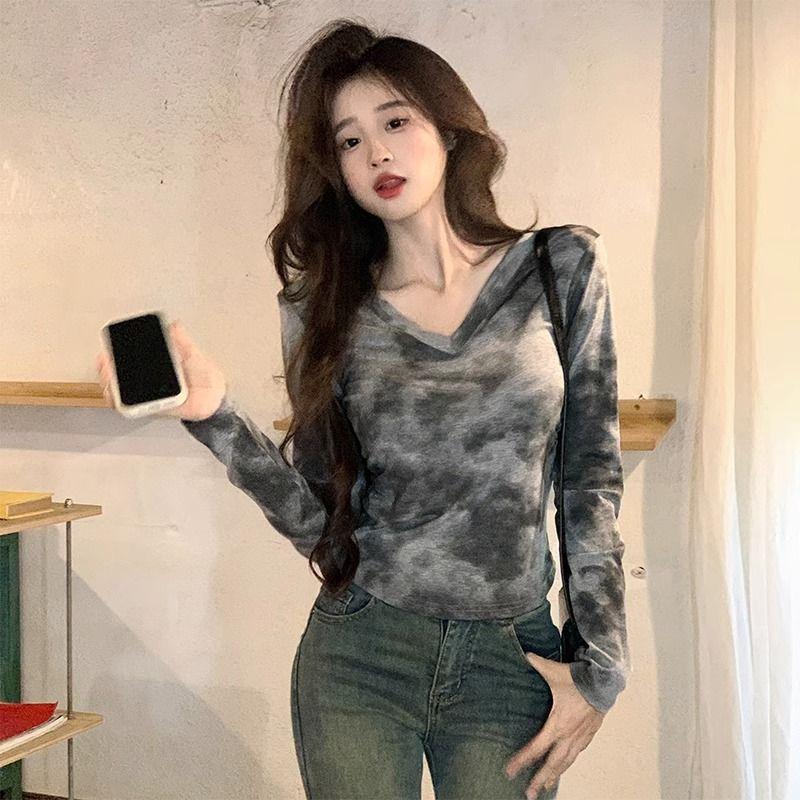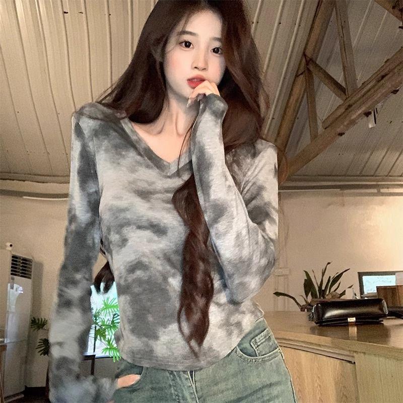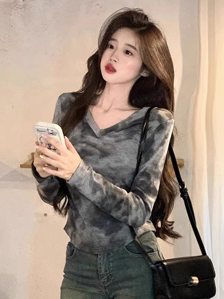 美式复古扎染V领短款上衣女早秋辣妹收腰修身内搭打底衫长袖T恤女