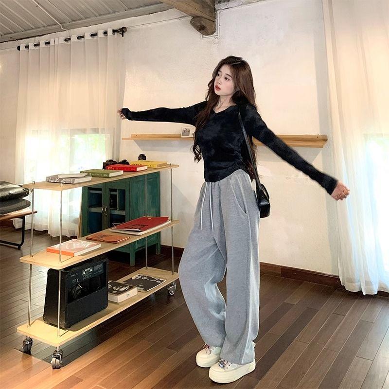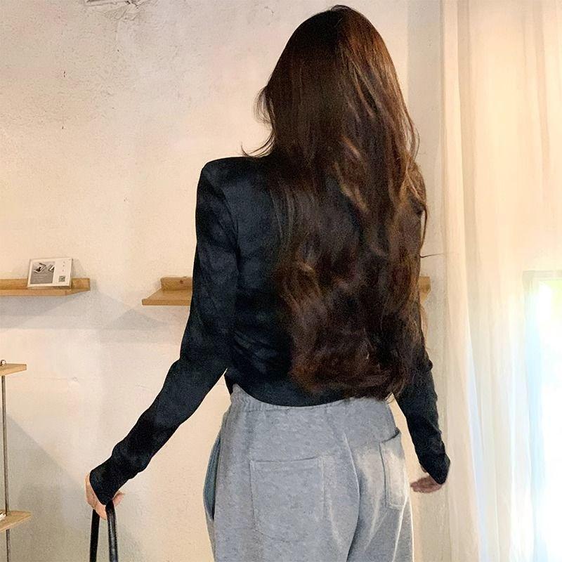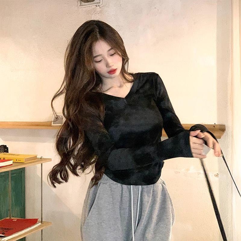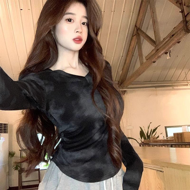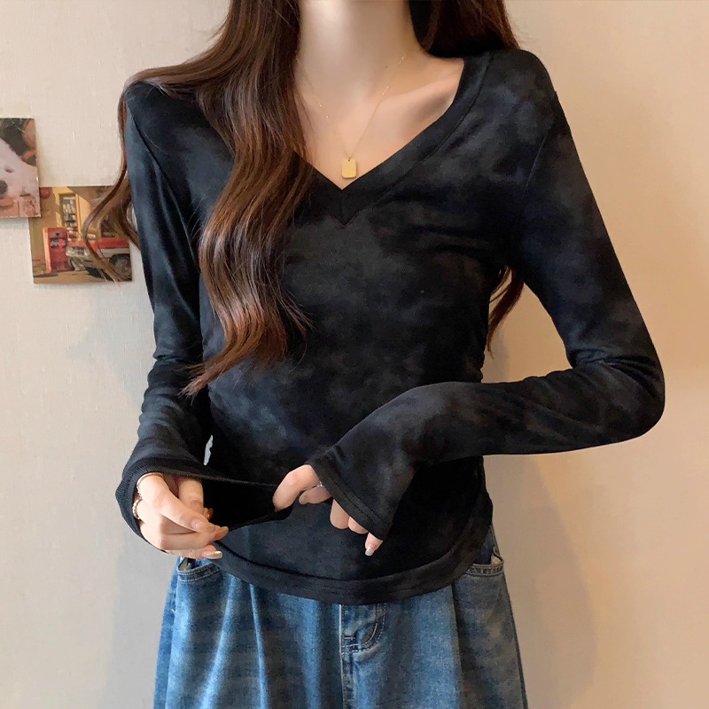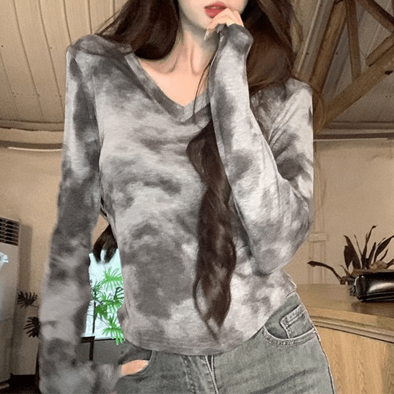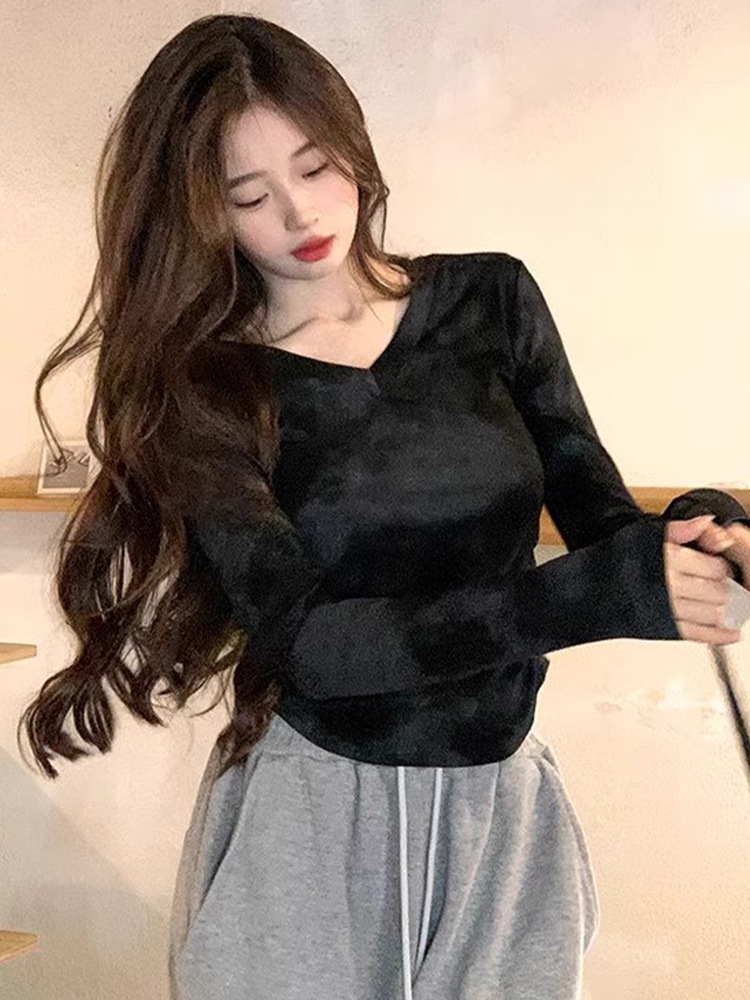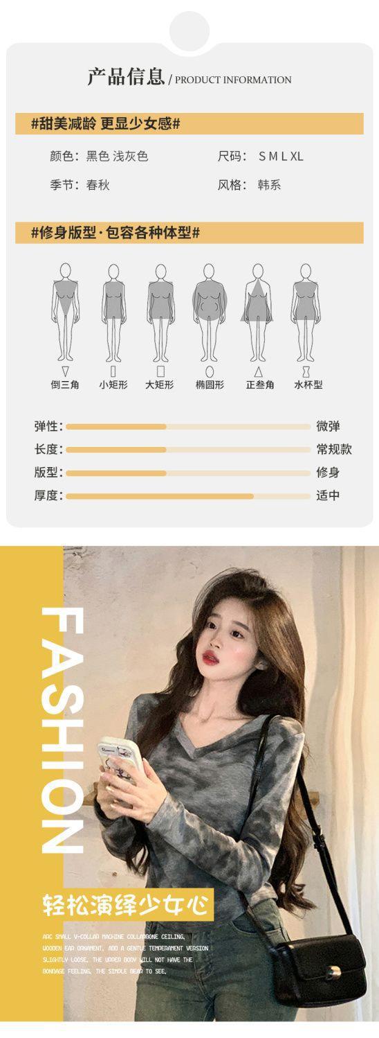 美式复古扎染V领短款上衣女早秋辣妹收腰修身内搭打底衫长袖T恤女