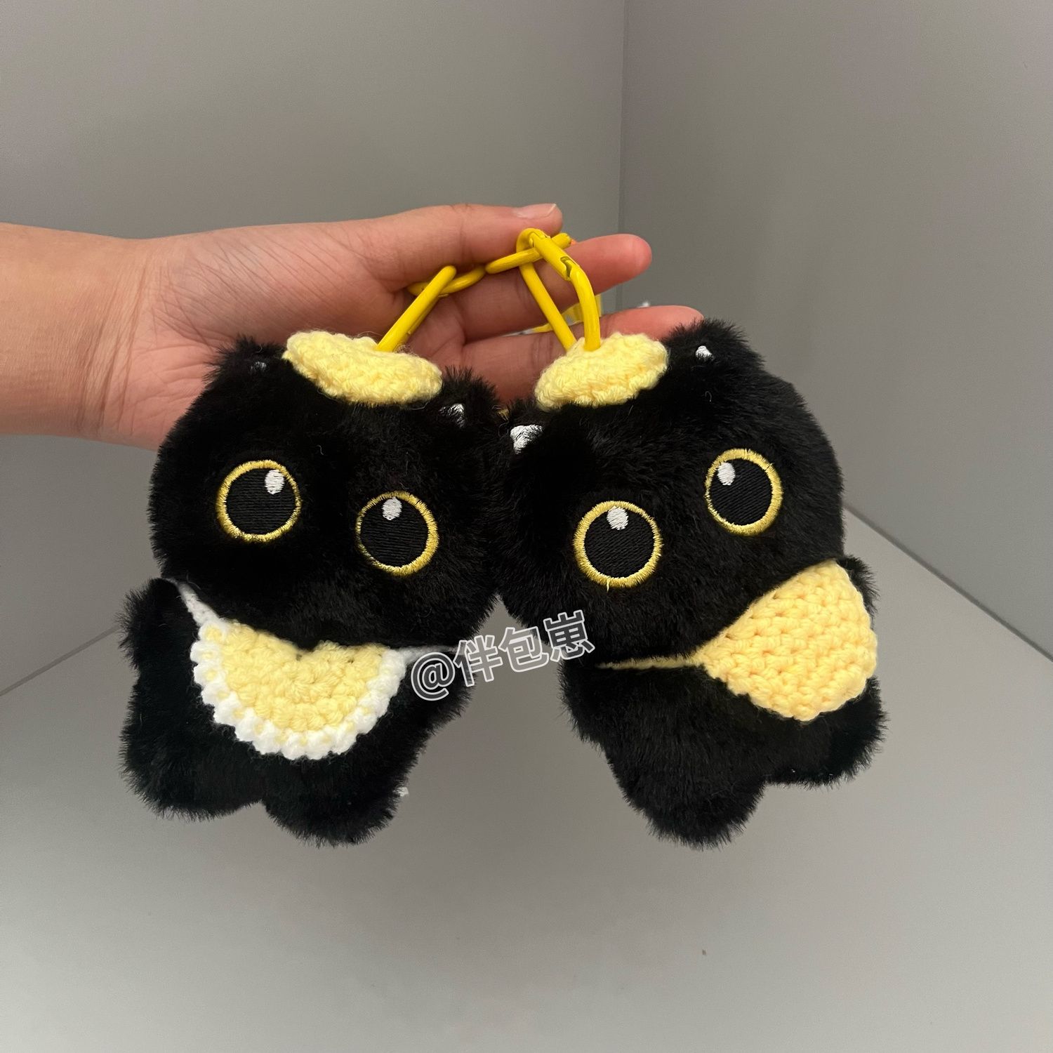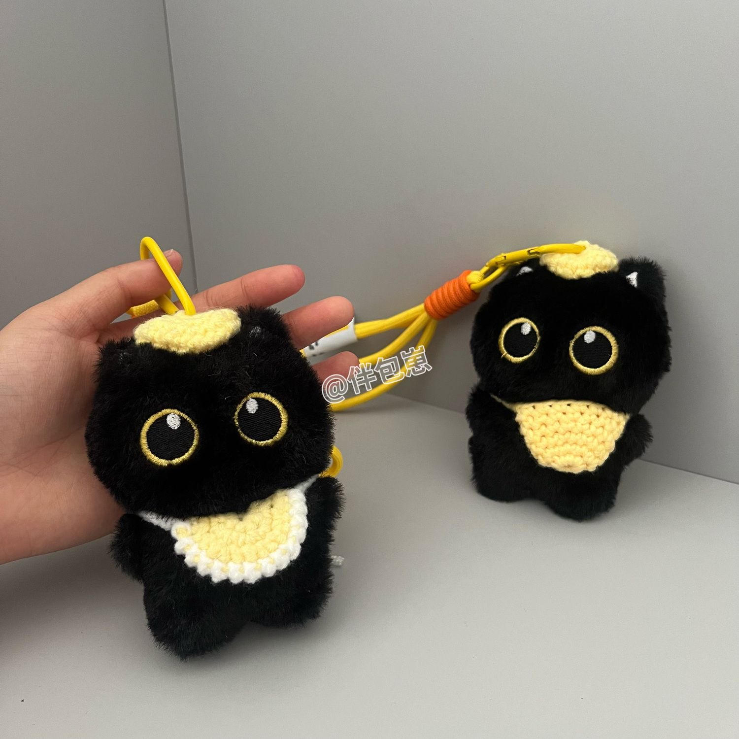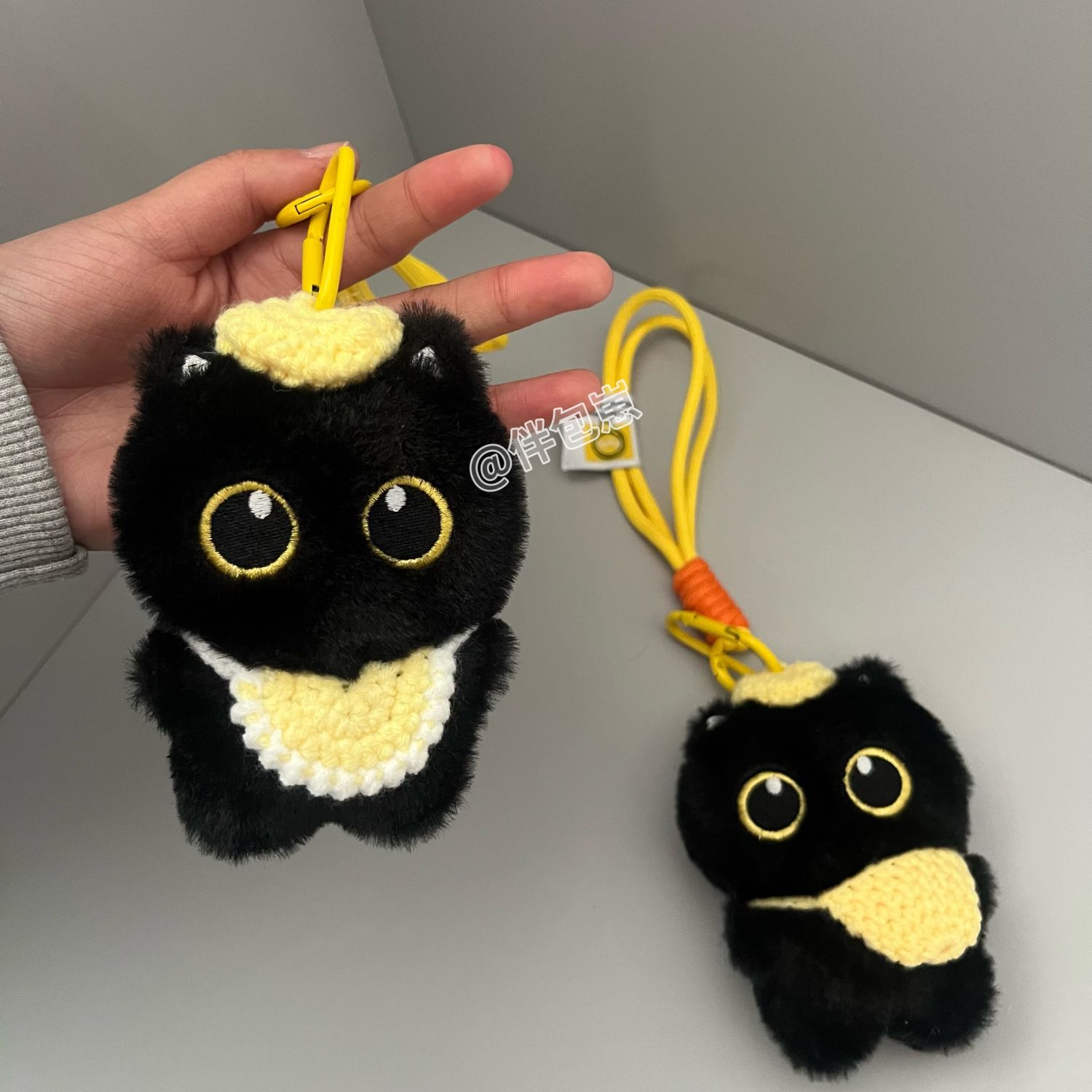 新款原创吱吱叫毛绒小黑猫挎包挂件多巴胺口水巾小挎包玩偶钥匙扣