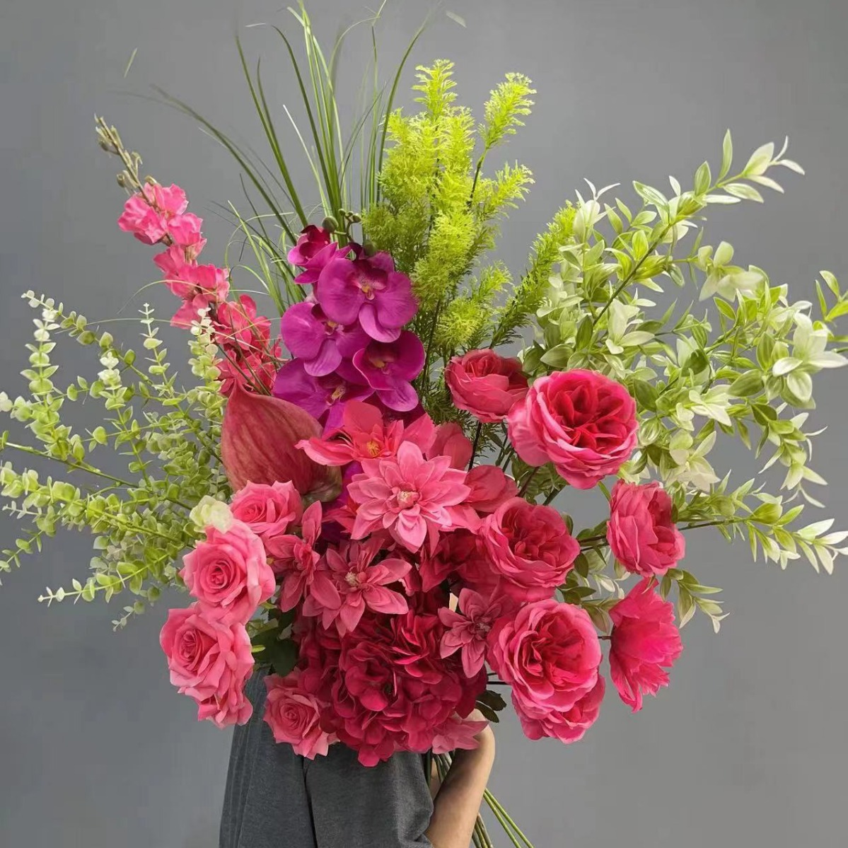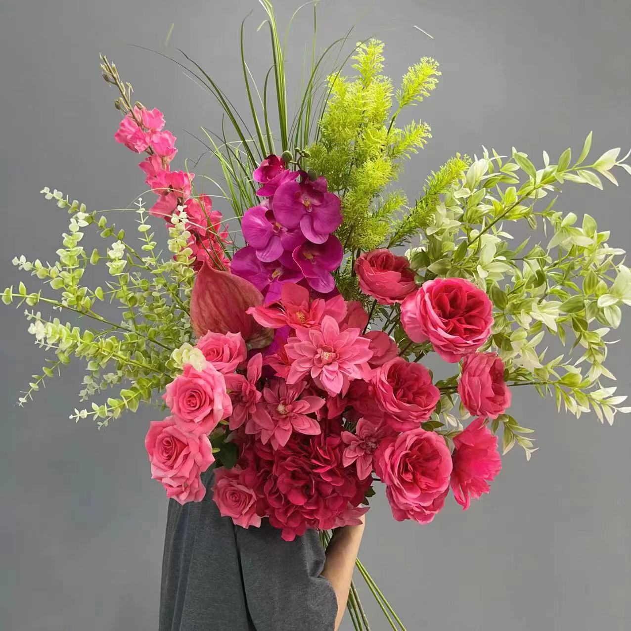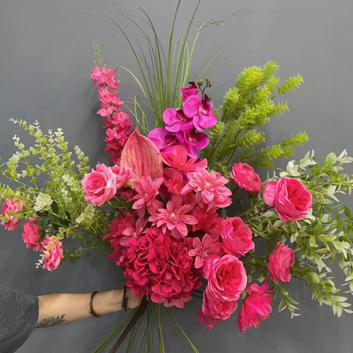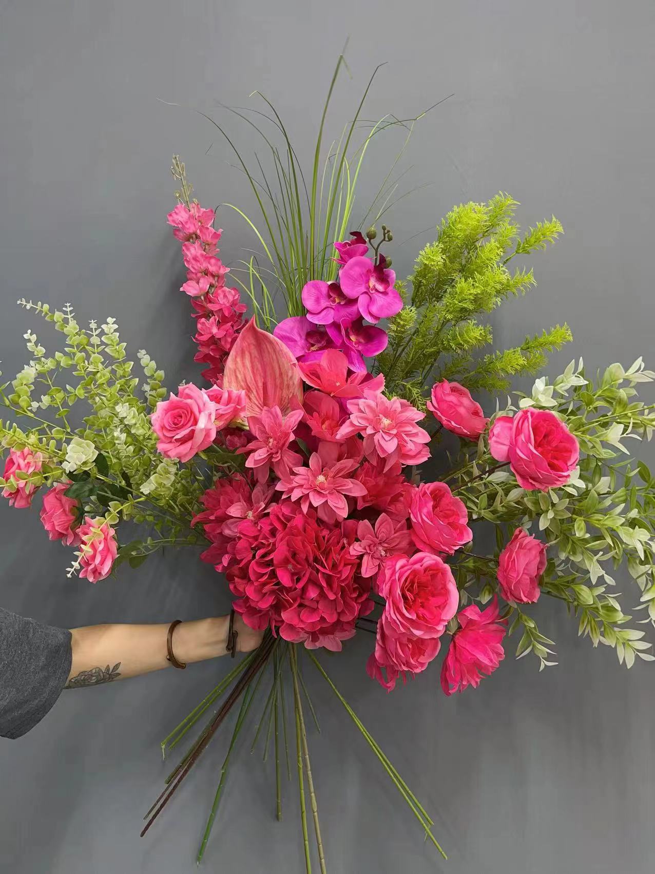 玫红色套红色婚礼仿真花婚礼堂酒店布置路引花排拍摄道具吊顶垂吊